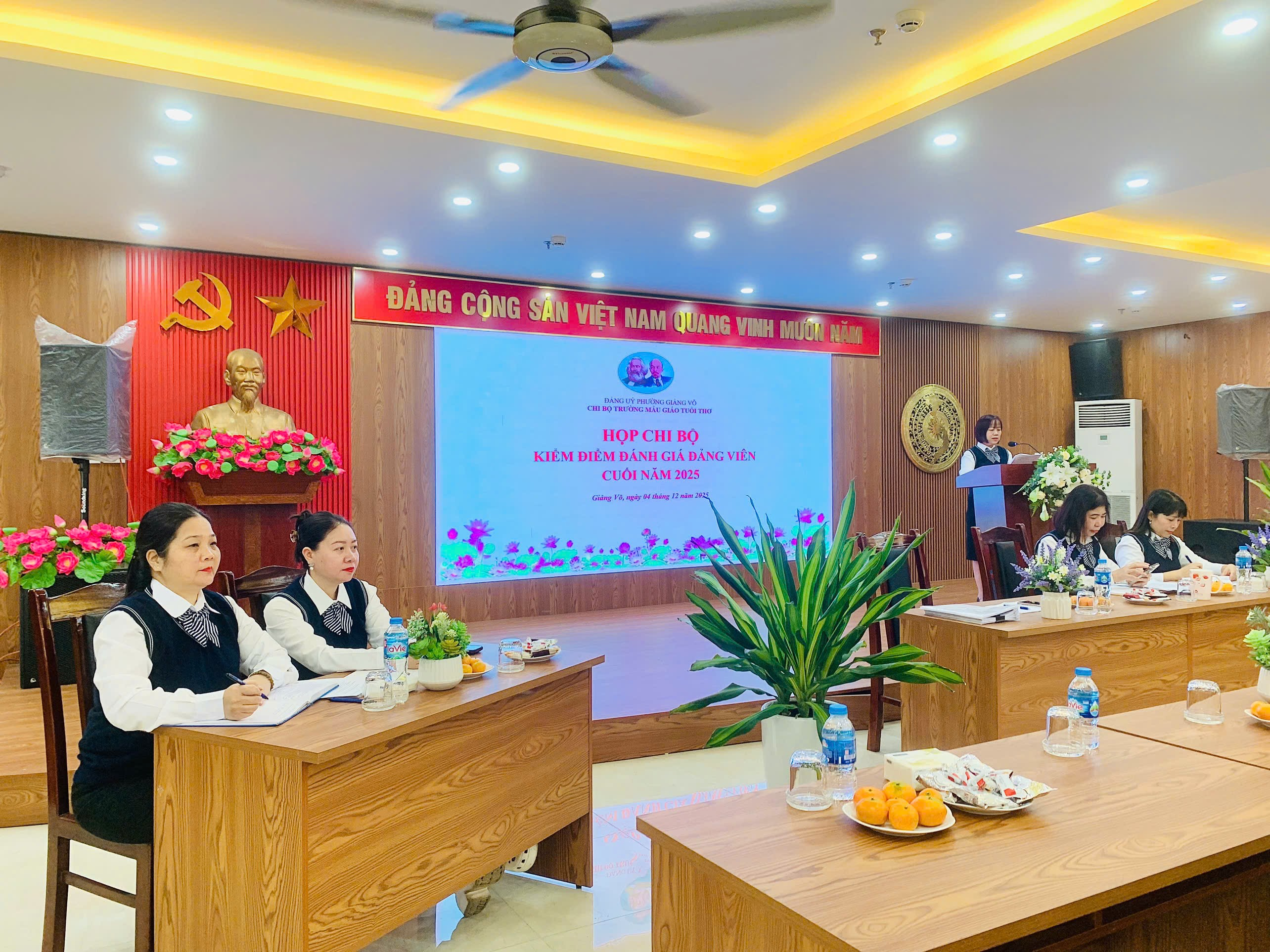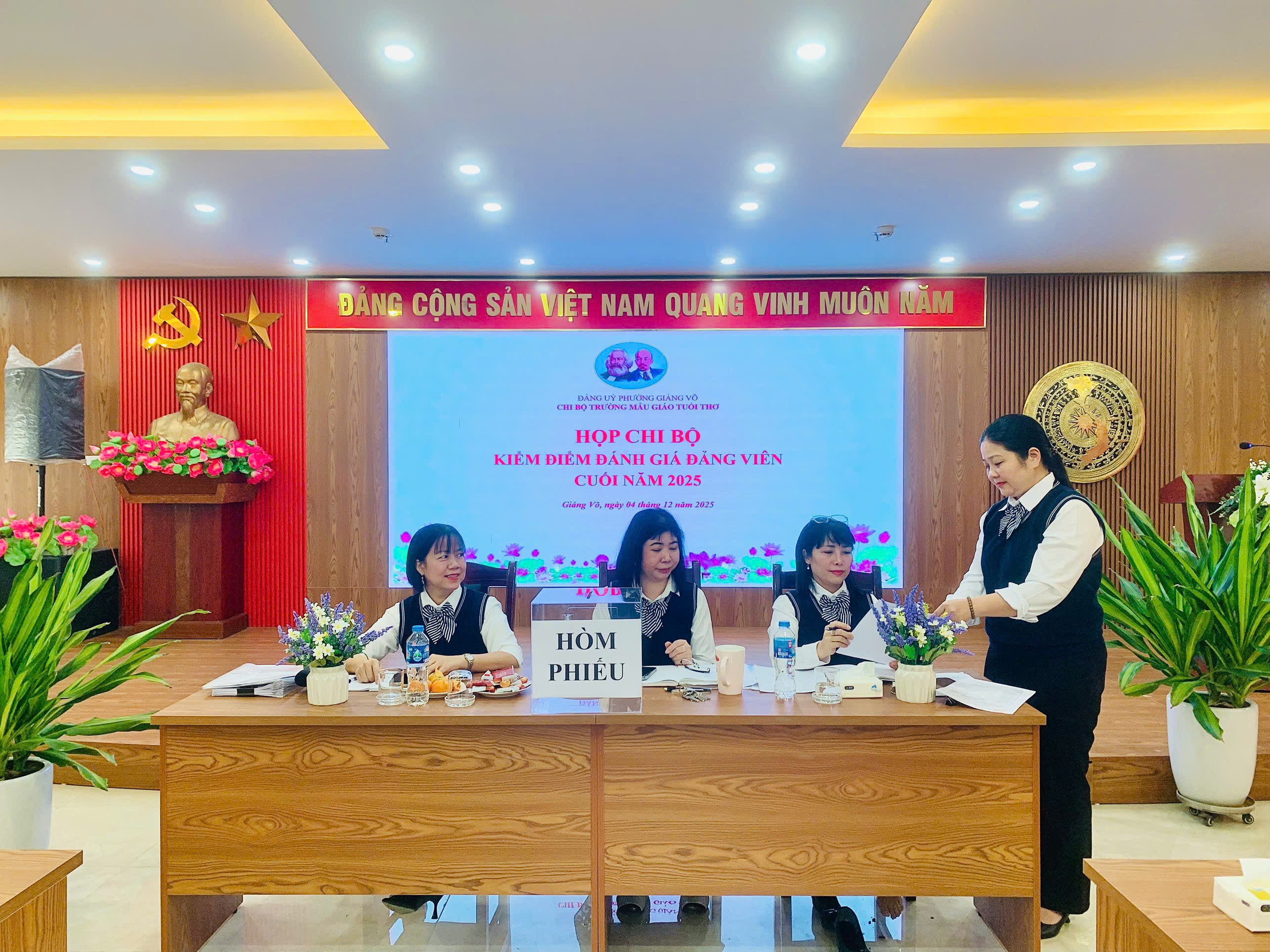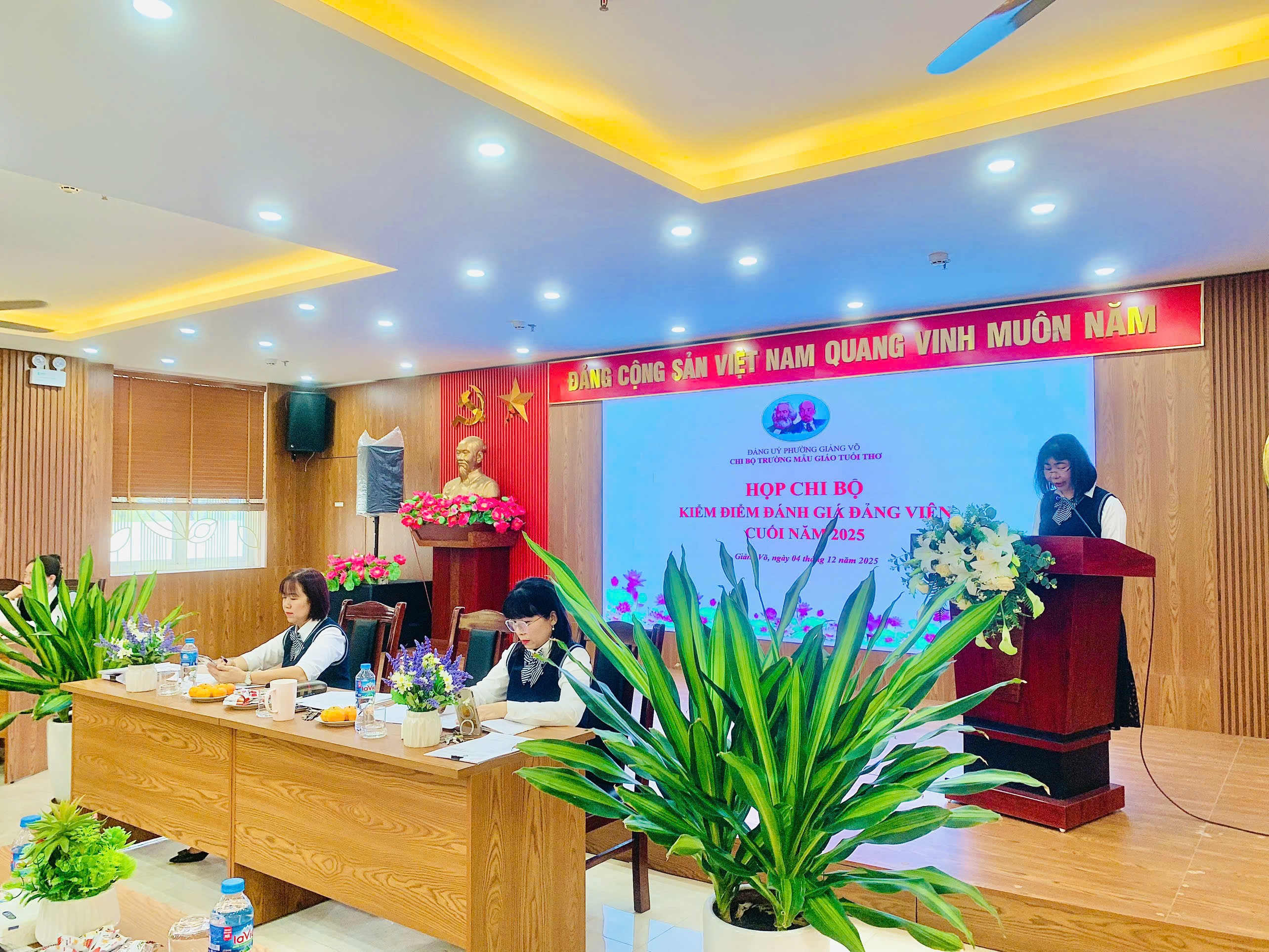 Sáng ngày 4/12/2025, Chi bộ Trường MG Tuổi Thơ đã tổ chức thành công buổi sinh hoạt kiểm điểm, đánh giá và xếp loại chất lượng đối với tập thể và đảng viên năm 2025. Hoạt động được triển khai theo Kế hoạch số 17-KH/ĐU ngày 24/11/2025 của Đảng ủy Phường Giảng Võ.