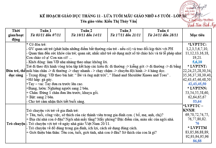 Kế hoạch hoạt động giáo dục tháng 11. Năm học 2025-2026. Lớp MGN B1