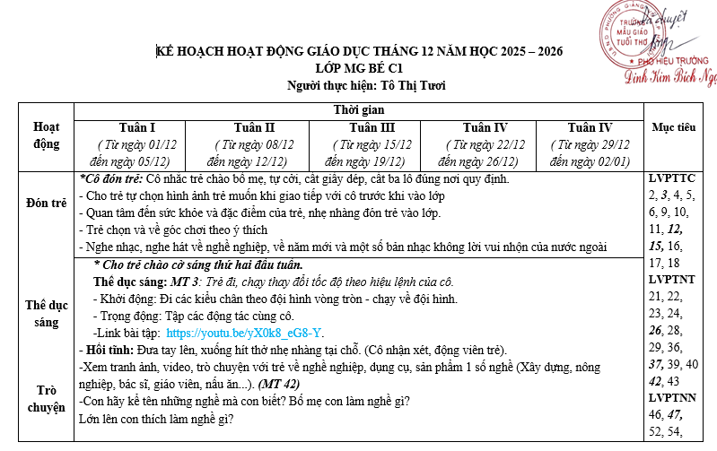 Kế hoạch hoạt động giáo dục tháng 12. Năm học 2025-2026. Lớp MGB C1
