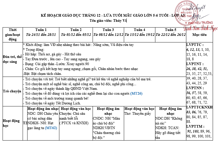 Kế hoạch hoạt động giáo dục tháng 12. Năm học 2025-2026. Lớp MGL A3