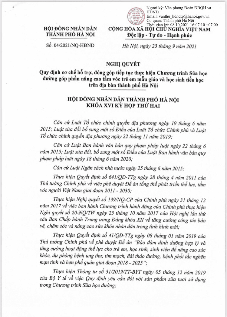 Nghị quyết: Quy định cơ chế hỗ trợ, đóng góp tiếp tục thực hiện Chương sữa học đường góp phần nâng cao tầm vóc trẻ em mẫu giáo và tiểu học trên địa của thành phố Hà Nội