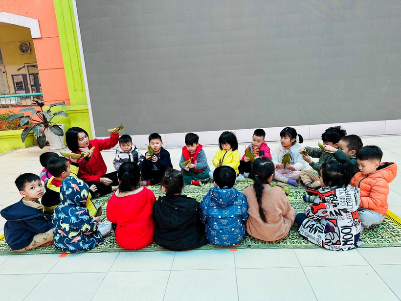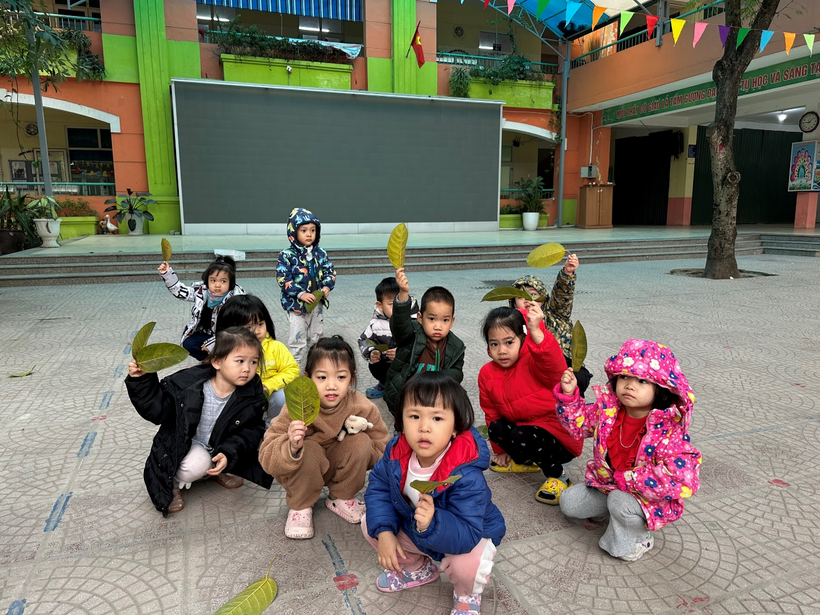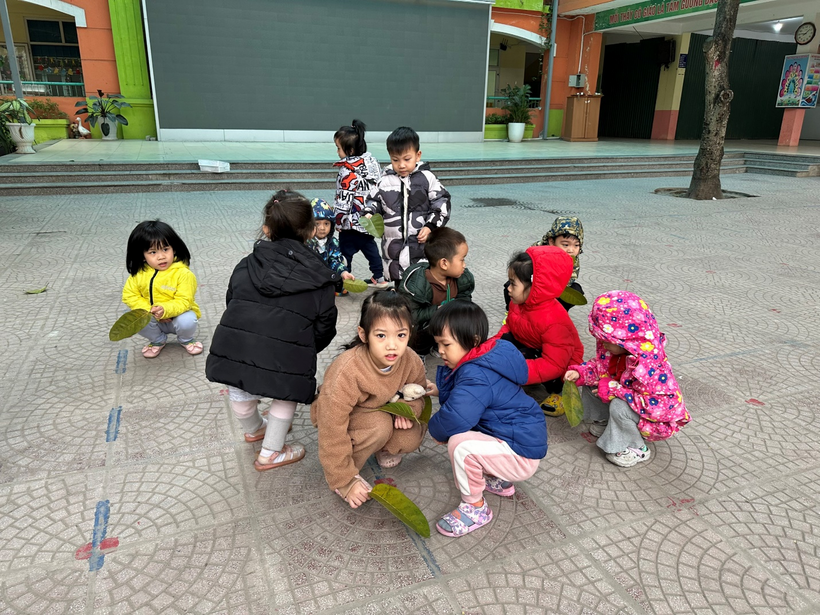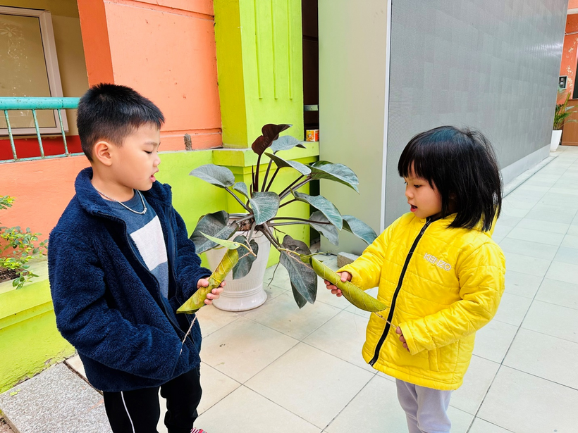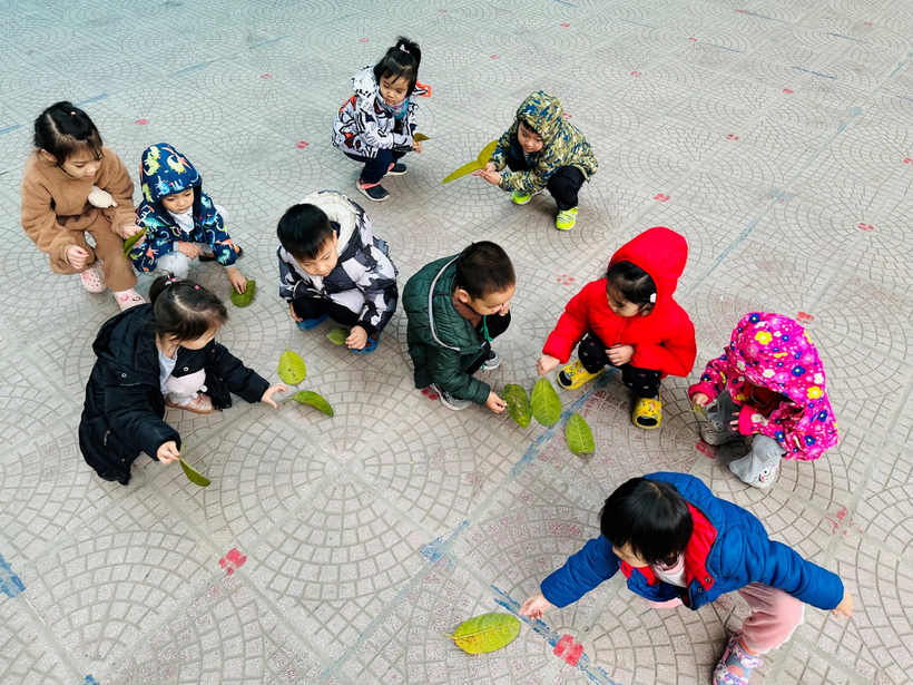1)Những chiếc lá rụng dưới sân trường được trẻ đi gom làm nguyên liệu tạo hình