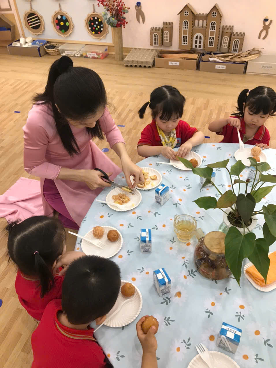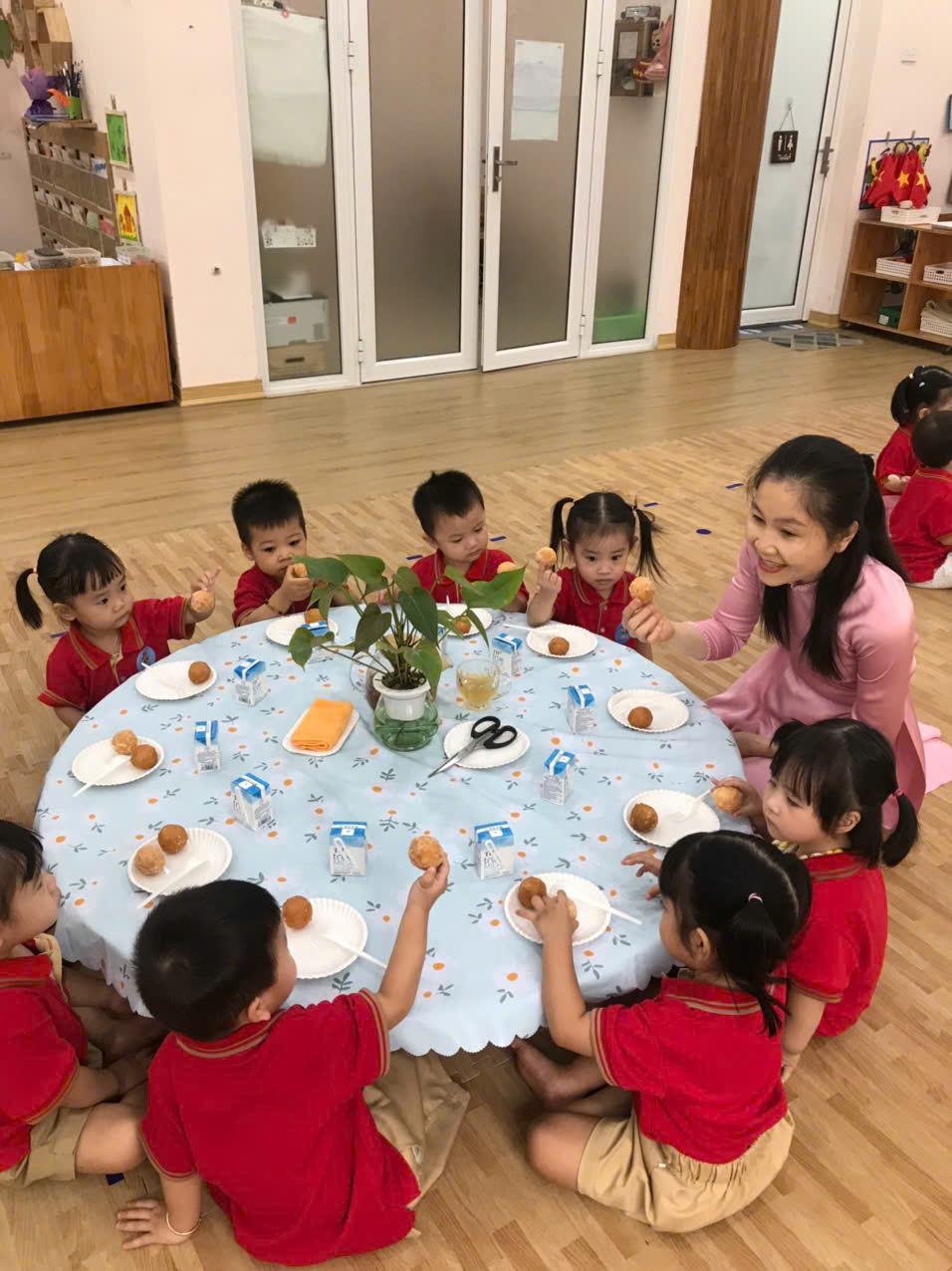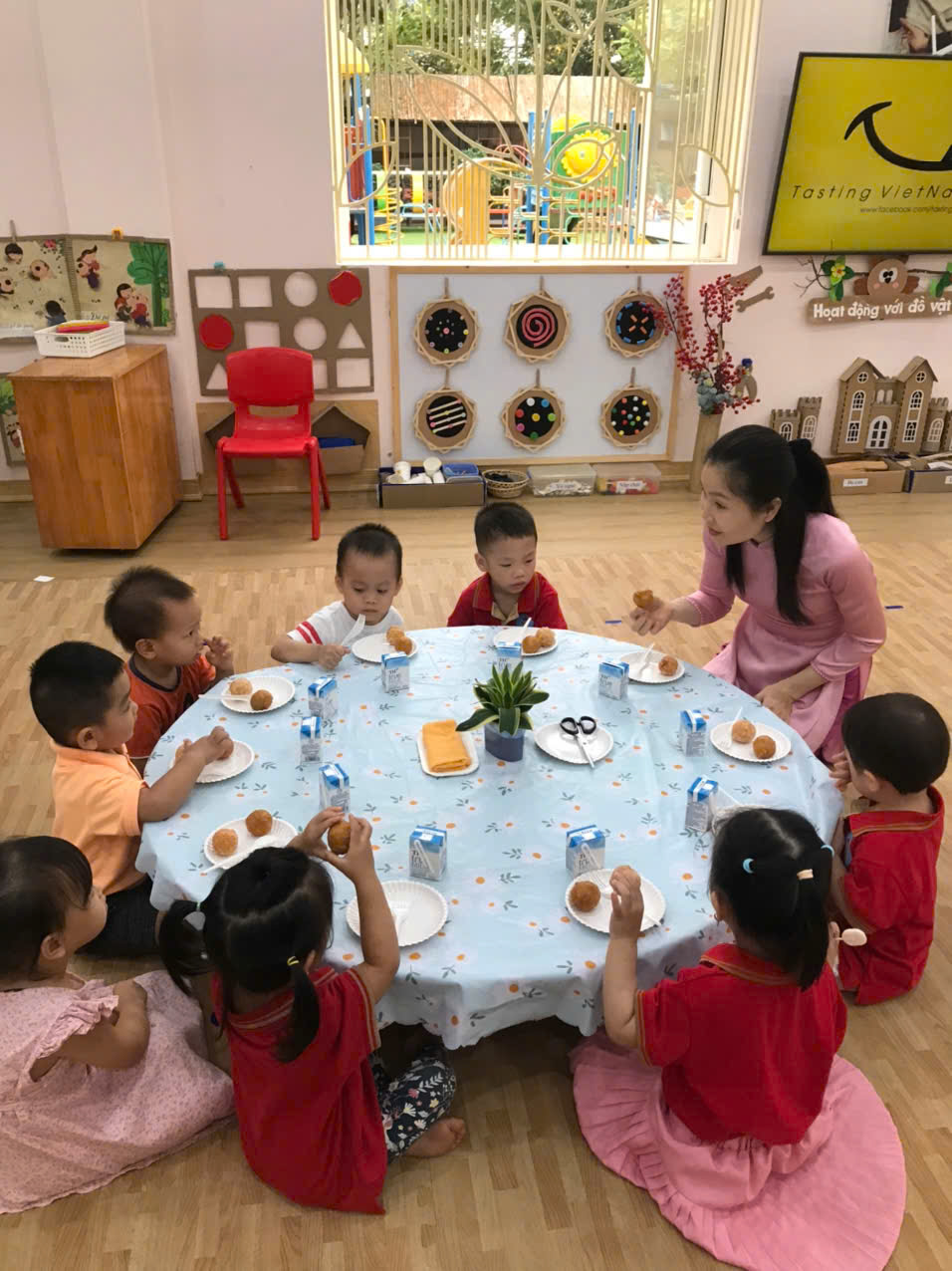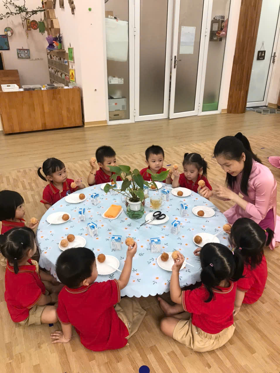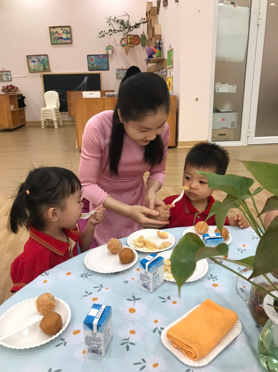 Hoạt động này không những nhận được sự thích thú hưởng ứng của các bé, mà còn nhận được sự ủng nhiệt tình từ phía phụ huynh. Đến với buổi khám phá, các con được trò chuyện về nguyên liệu để làm nên những chiếc “Bánh rán mật - Bánh rán đường”nhỏ xinh: như bột mì, trứng, sữa, nhân đậu xanh, đường, mật… và cách làm nên những chiếc bánh rán mật màu nâu óng ánh ngọt đậm, những chiếc bánh rán đường bao quanh đượm vị nhân đậu xanh thơm ngon.