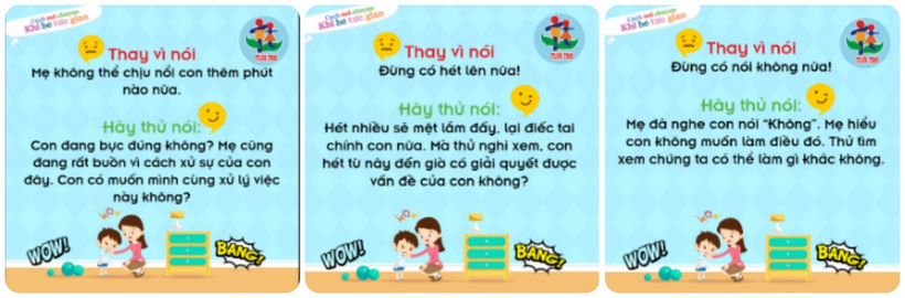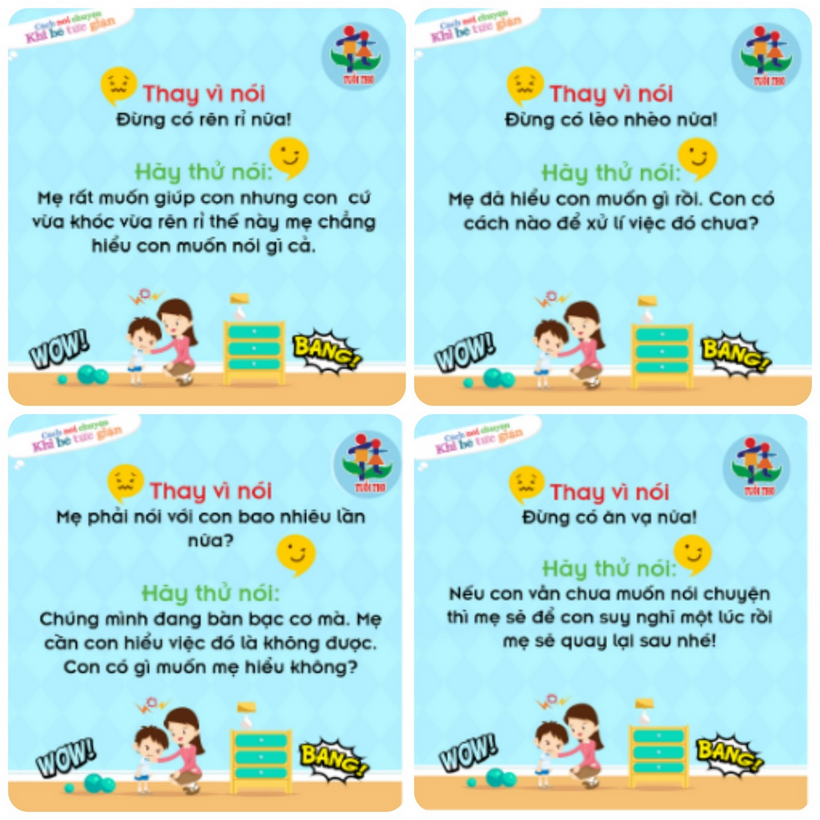 Việc thứ tư, sau khi trẻ đã qua cơn tức giận, đó mới là lúc bố mẹ và trẻ nói chuyện với nhau. Khi đang tức giận, trẻ sẽ không muốn nghe gì cả. Nên để trẻ nguôi giận rồi mới nói chuyện. Bố mẹ nên mở đầu câu chuyện bằng việc mô tả lại vấn đề, con muốn gì và nhắc lại, KHẲNG ĐỊNH LẠI MONG MUỐN CỦA TRẺ. Sau đó mới là bố mẹ nghĩ thế nào và phương án giải quyết là gì. Việc được bố mẹ hiểu mong muốn của mình cũng sẽ giúp trẻ nguôi giận hơn, tranh luận vào trọng tâm hơn.