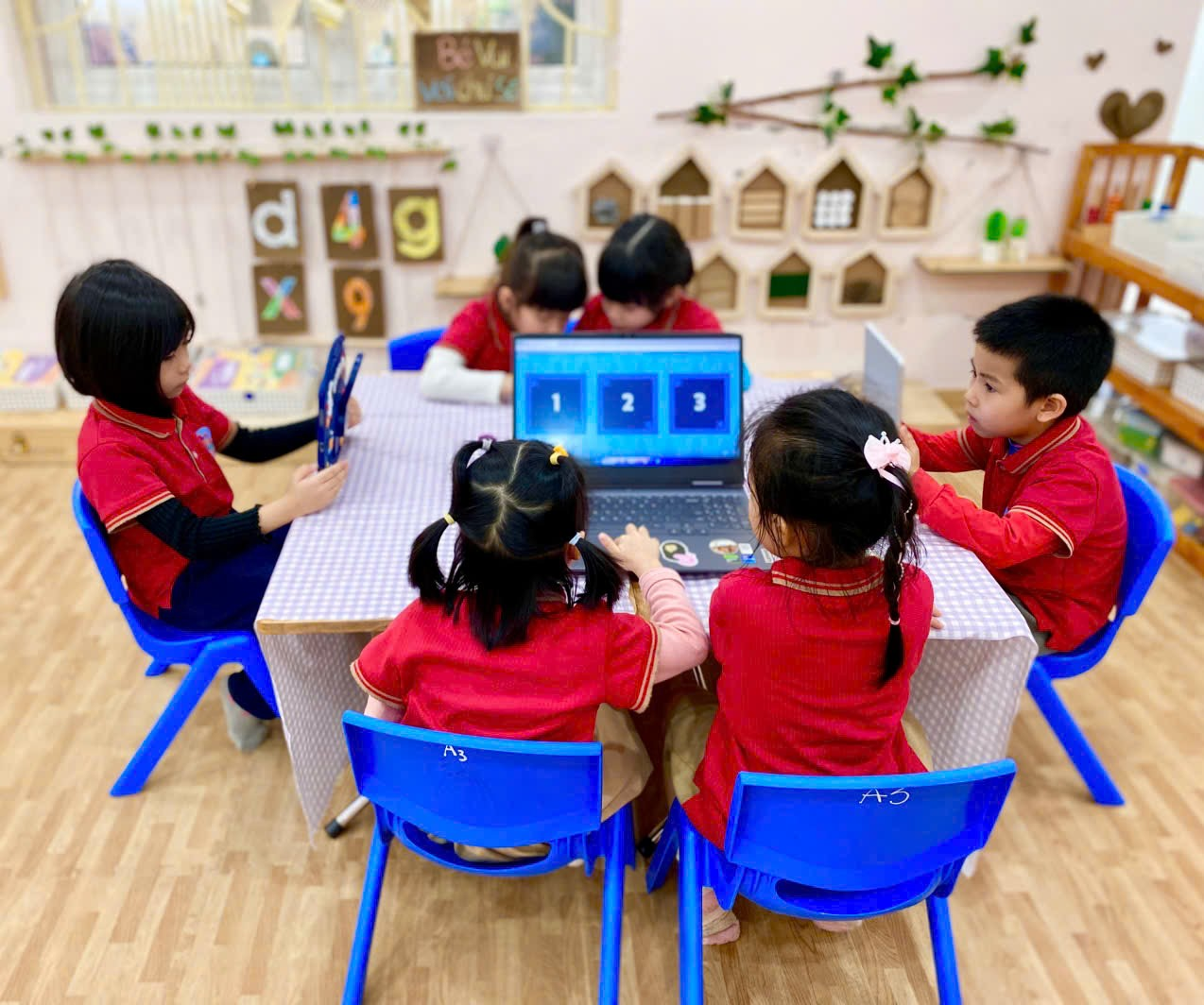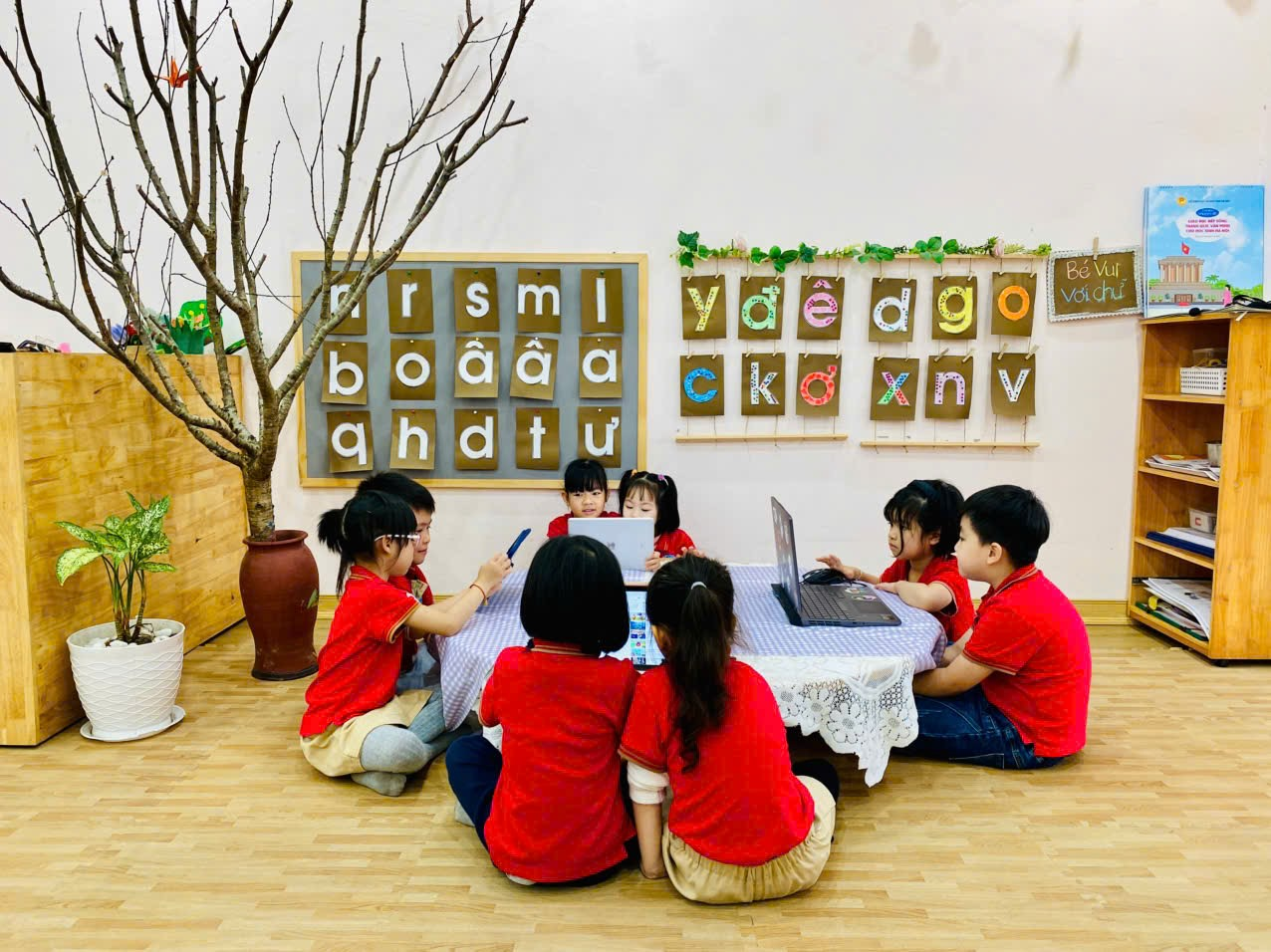 Không gian: Môi trường trong lớp học: Khi ứng dụng công nghệ Al vào giảng dạy thì tôi đã xây dựng môi trường hoạt động thân thiện với trẻ với đầy đủ các trang thiết bị như: Tivi, máy tính, laptop, ipad, bảng tương tác…