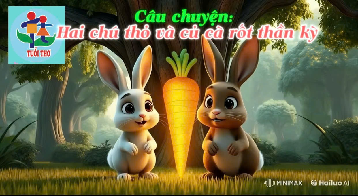 Ví dụ truyện: Hai chú thỏ và cây cà rốt thần kỳ. (Sáng tác qua ChatGPT, Leonardo. Al, Hailuo. Al)