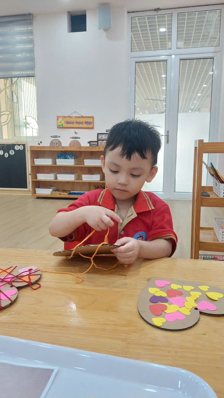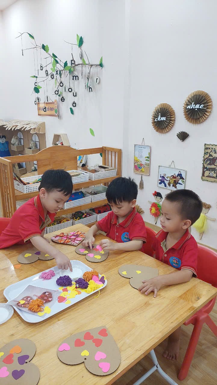 3. Bé trang trí khung tranh trái tim: