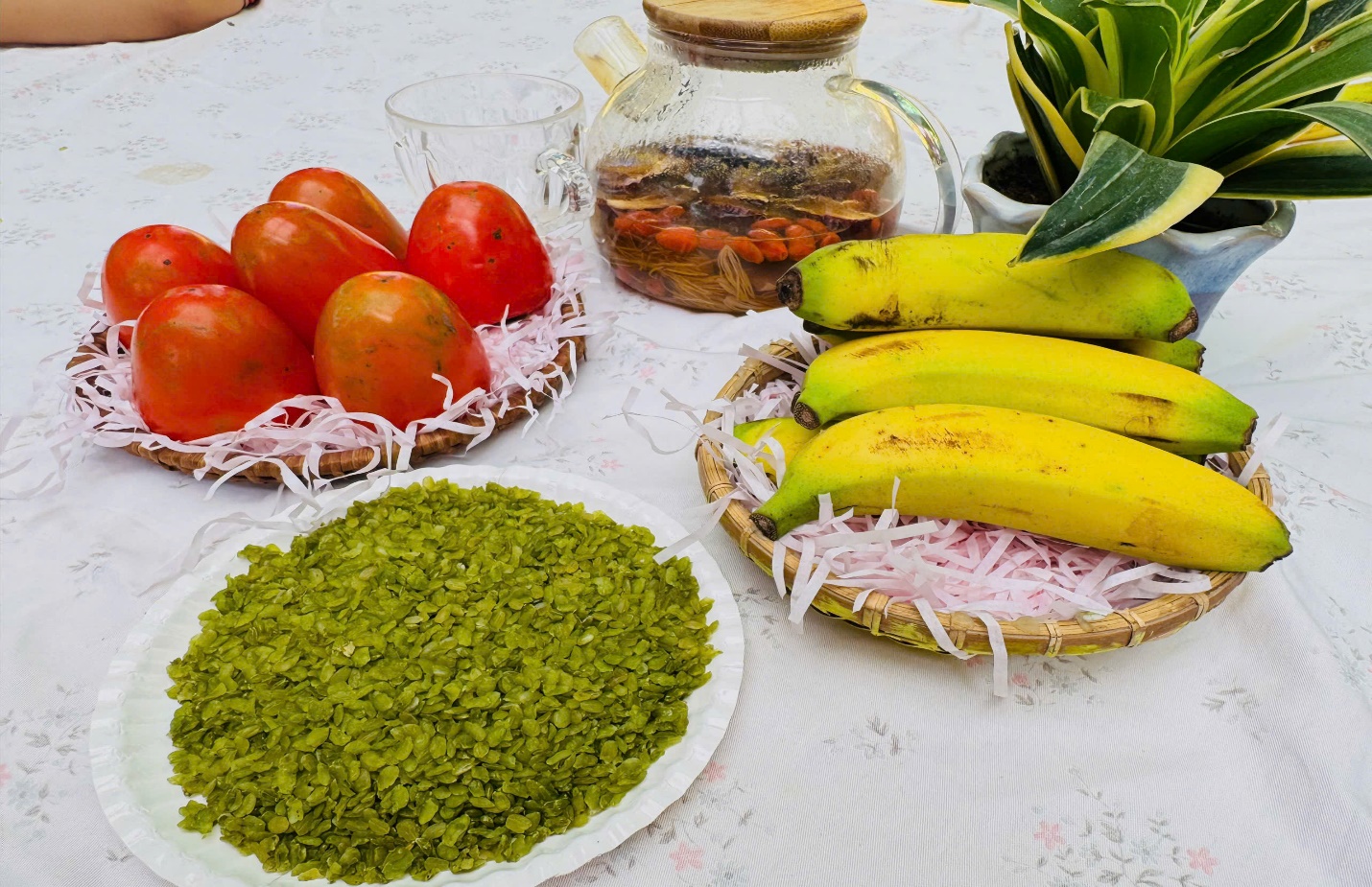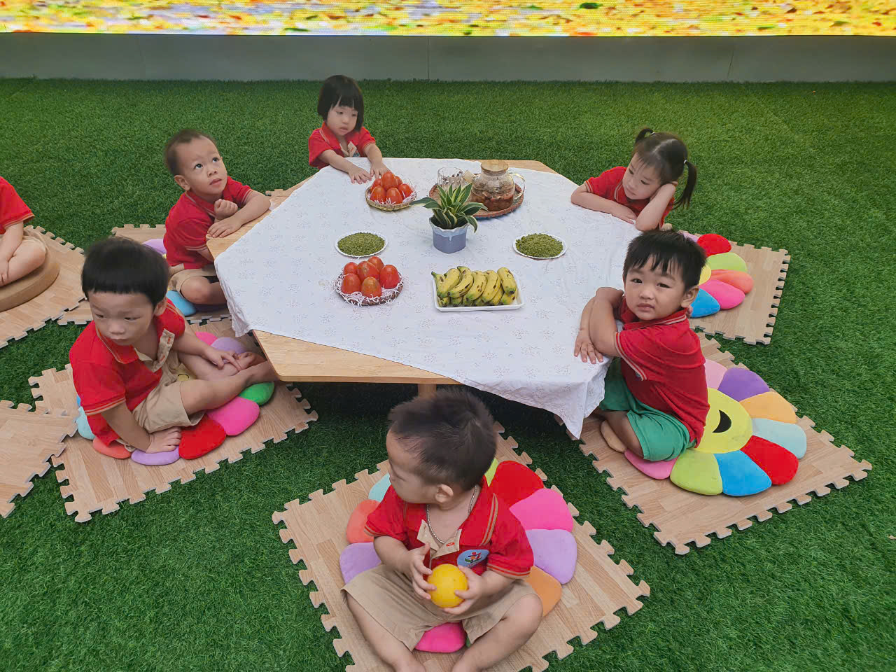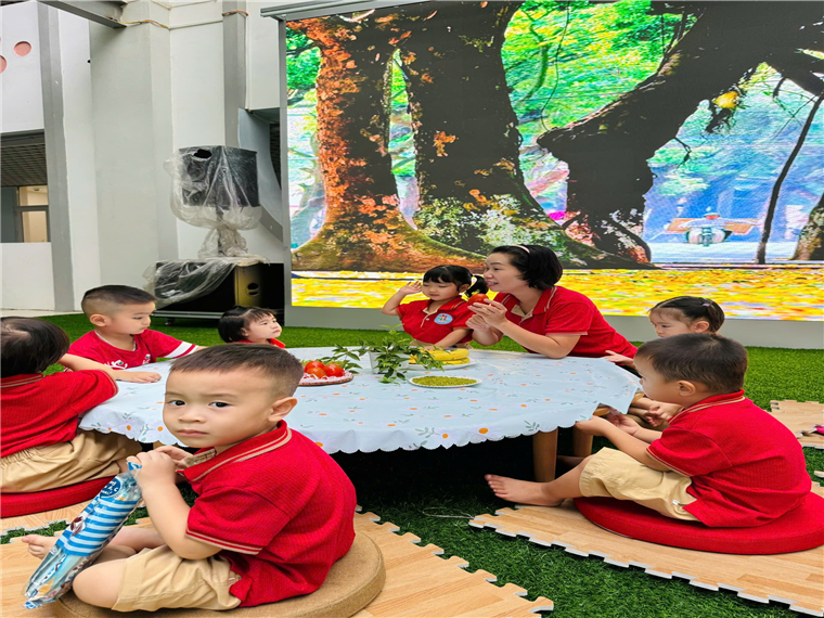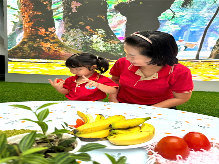 Chúng con được các Cô hướng dẫn để nhận biết: quả hồng – quả chuối – cốm!