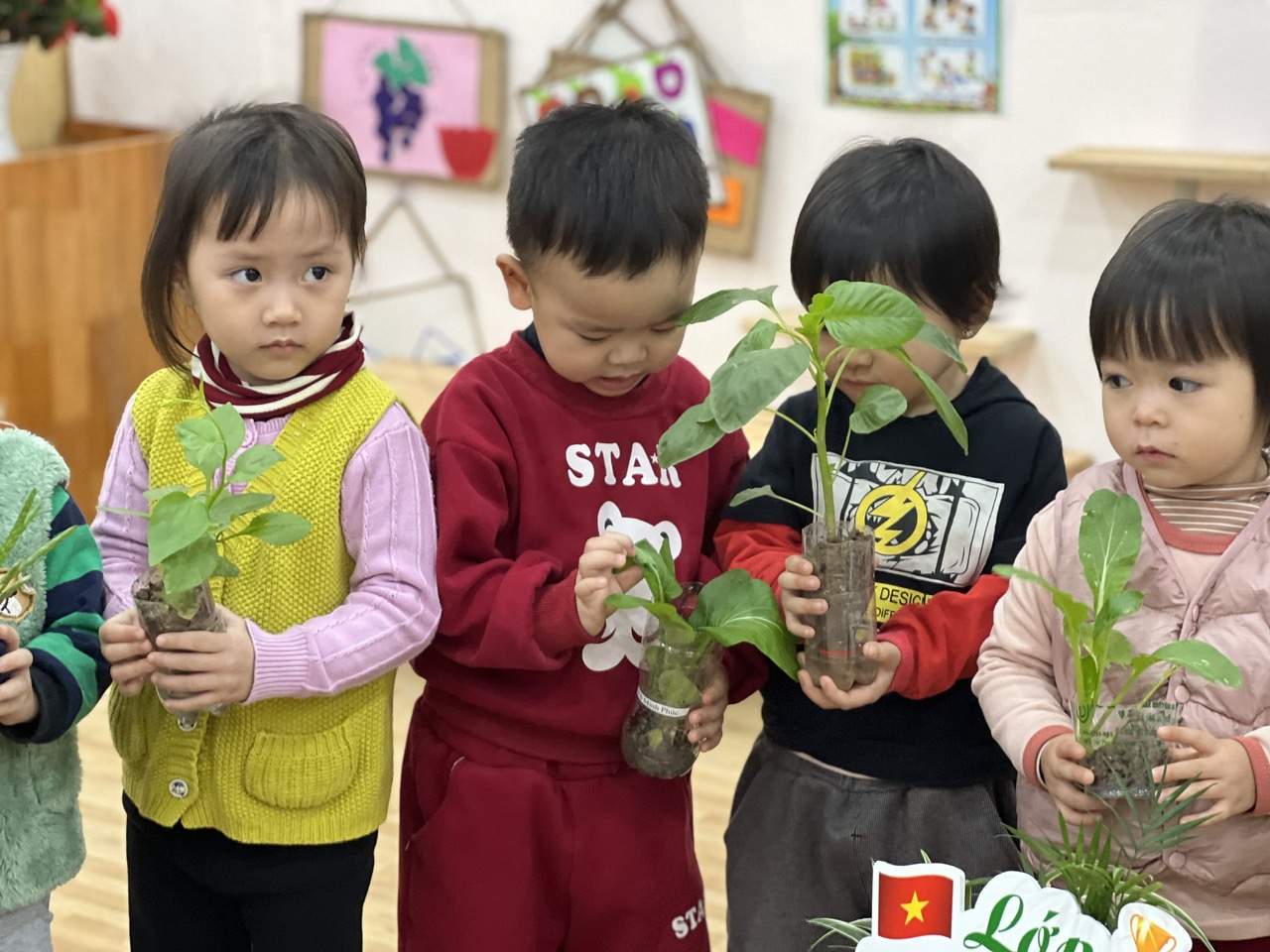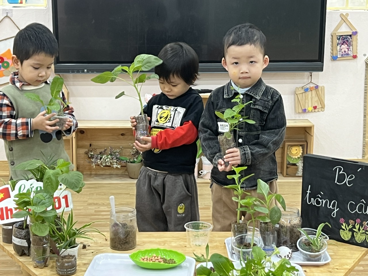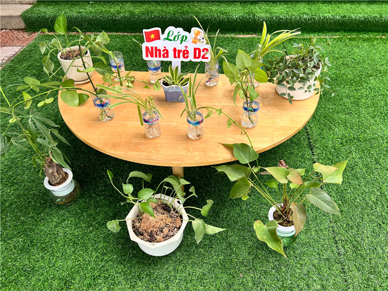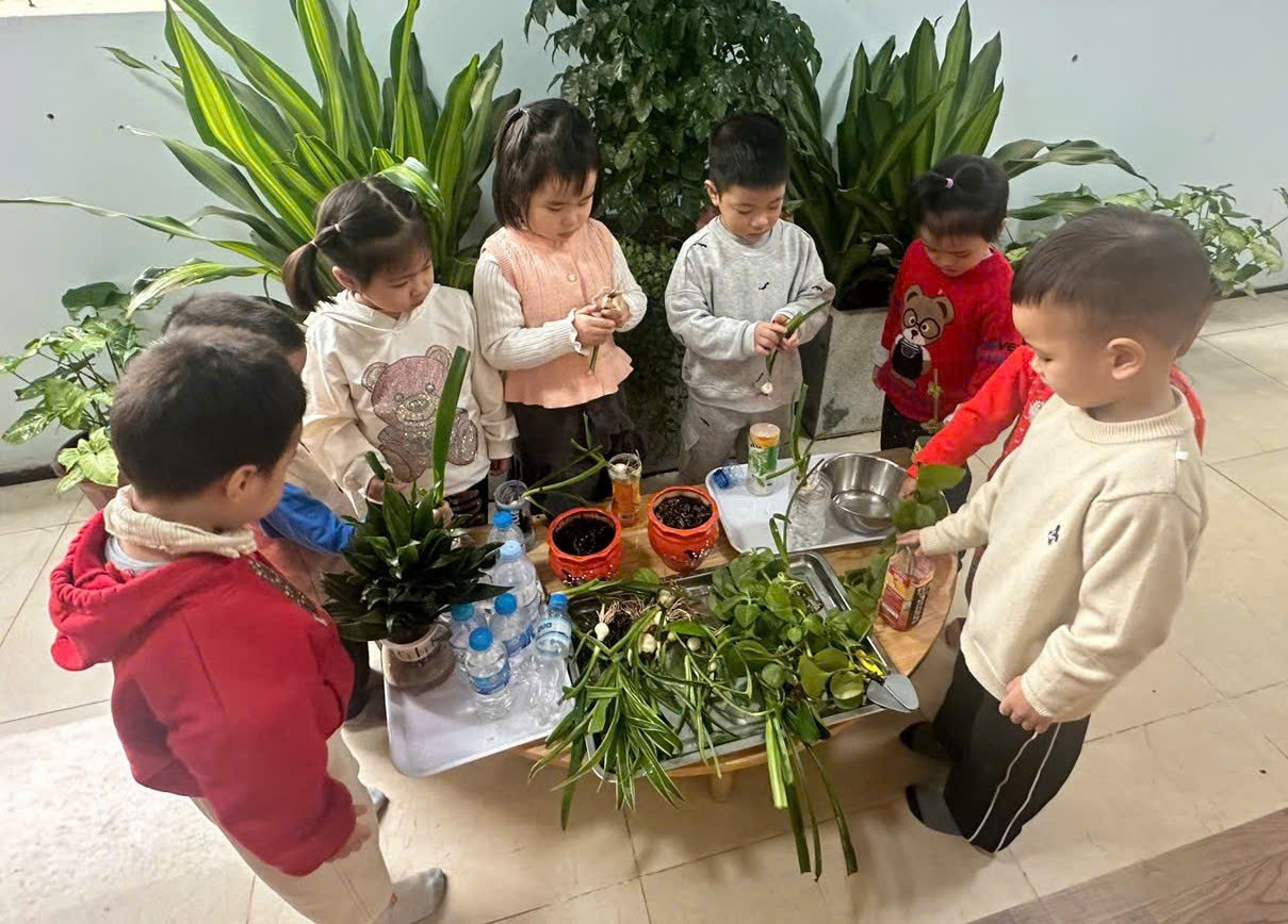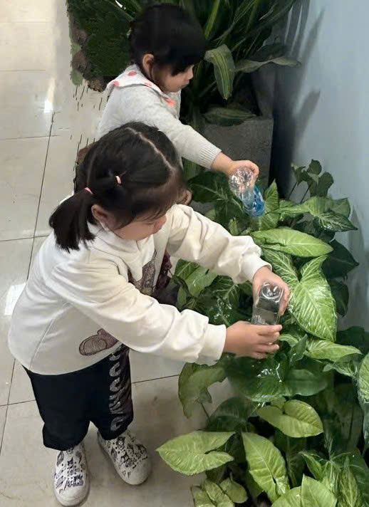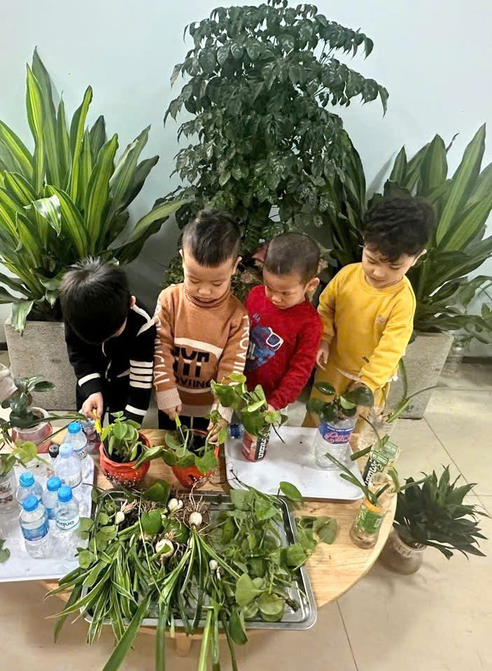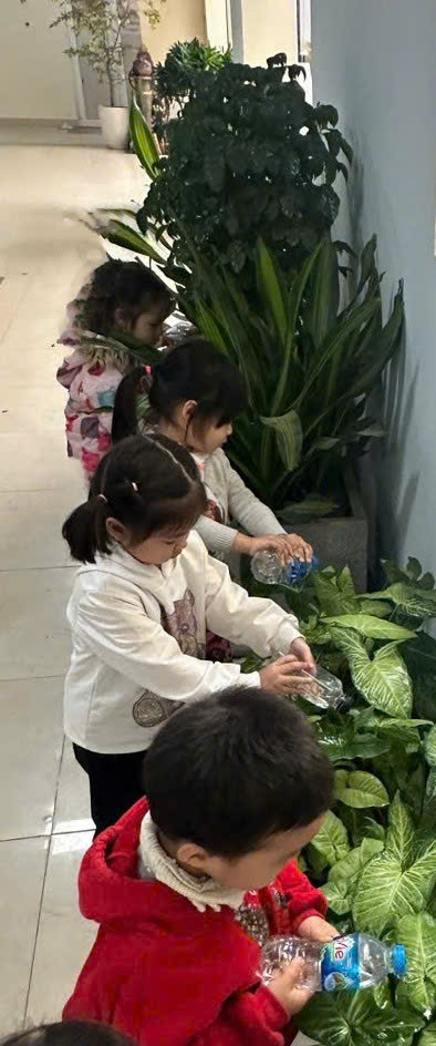 *Các Bé lớp C1 vui sướng khi được tham gia chăm sóc cây xanh của lớp và tập trồng cây thủy sinh: