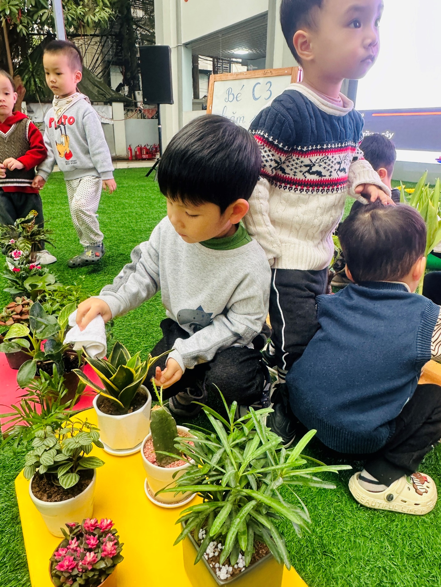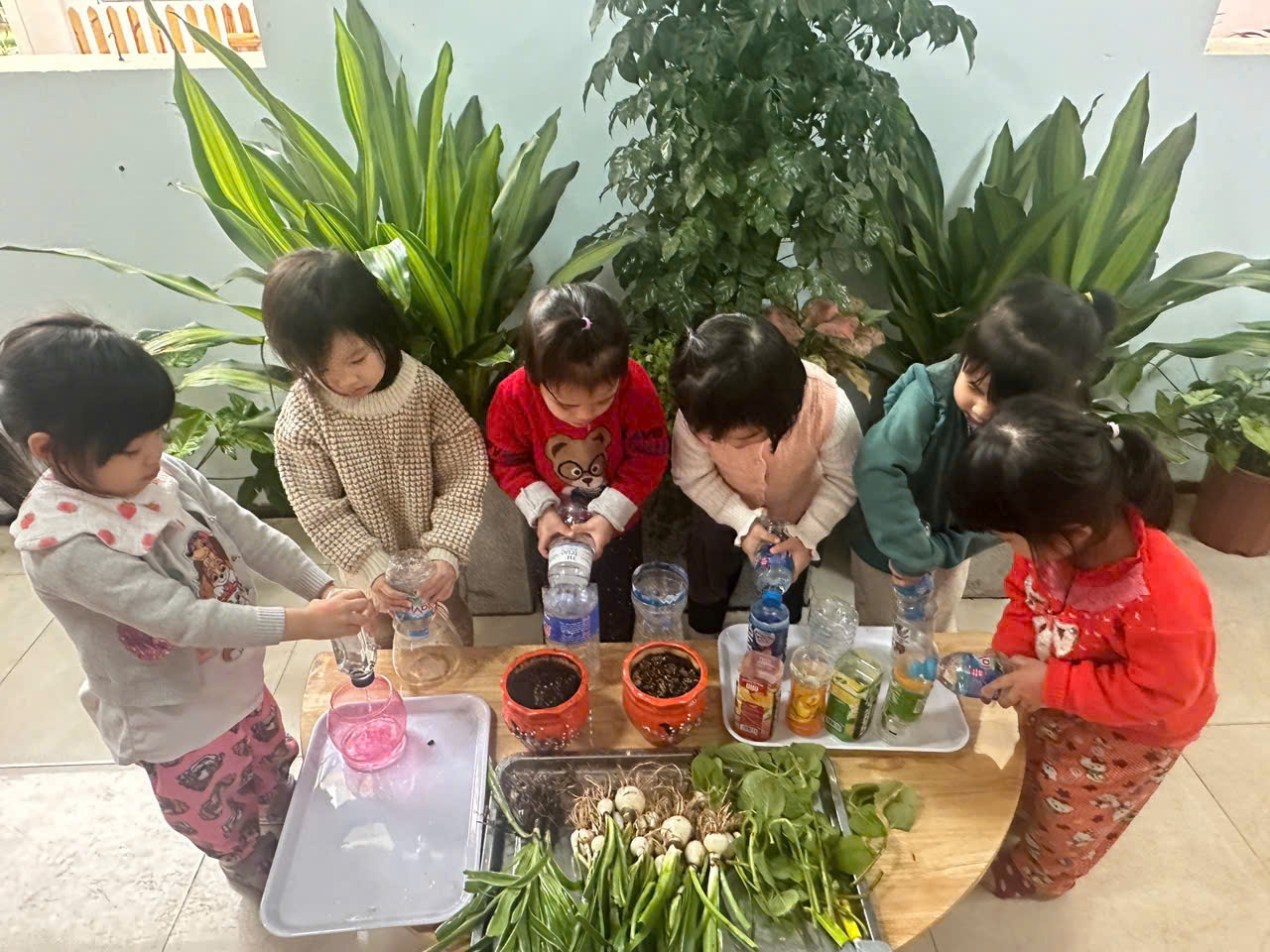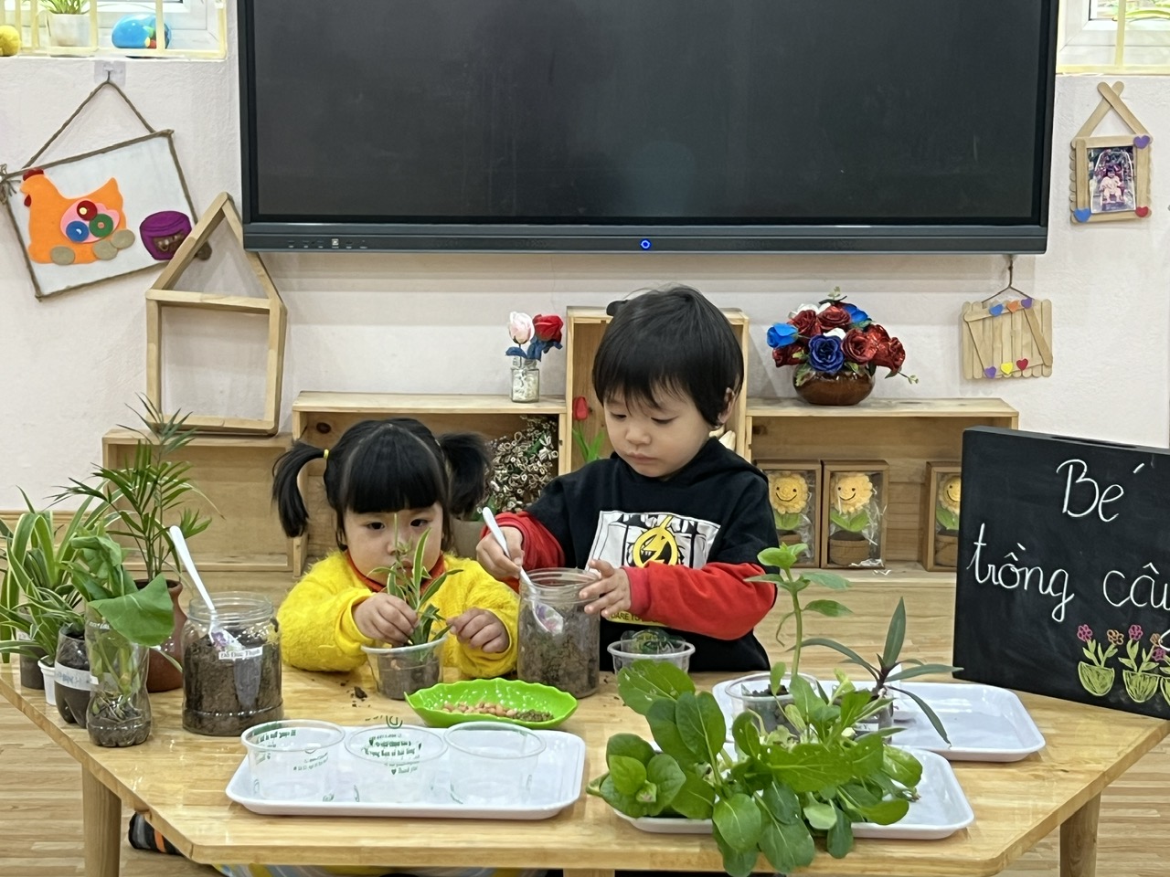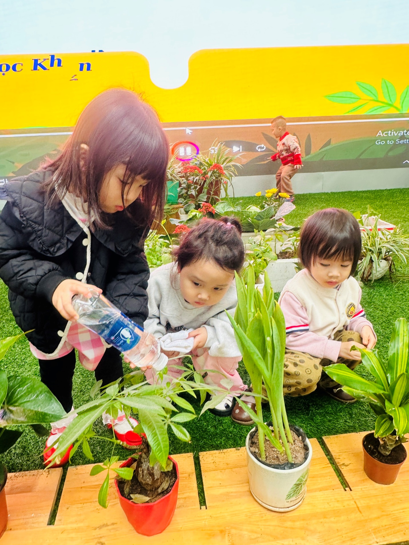 *Các Bé lớp C1 vui sướng khi được tham gia chăm sóc cây xanh của lớp và tập trồng cây thủy sinh:
