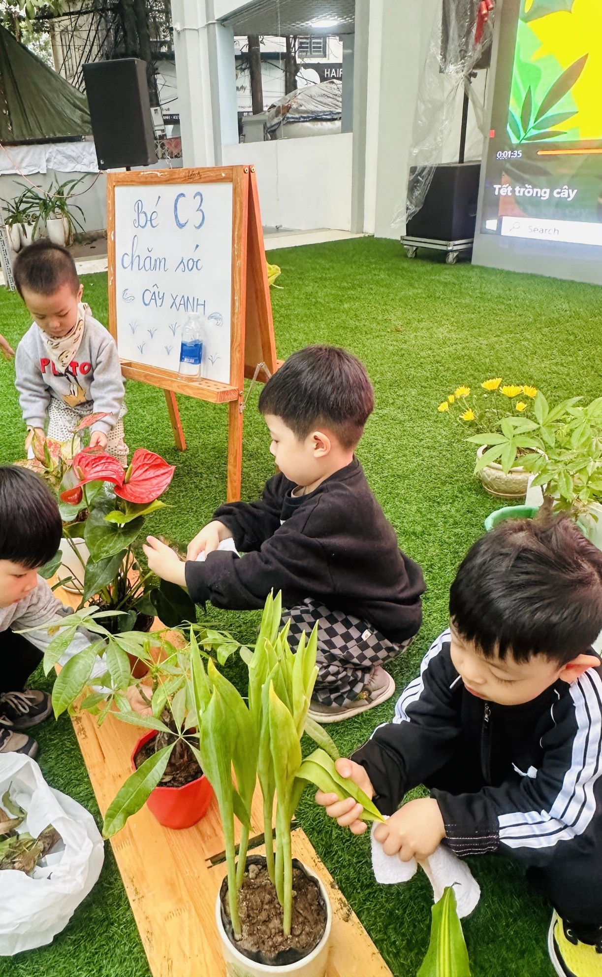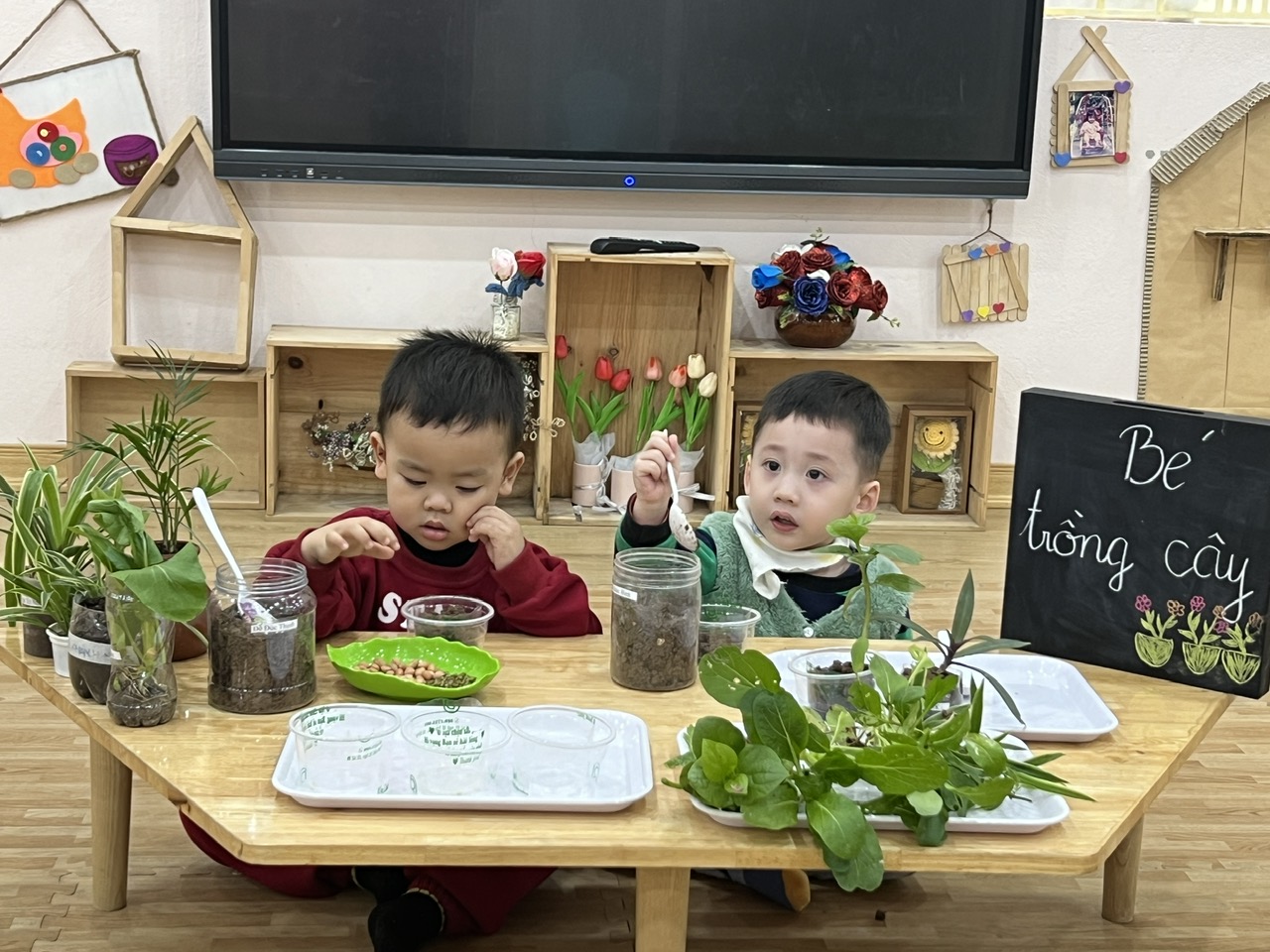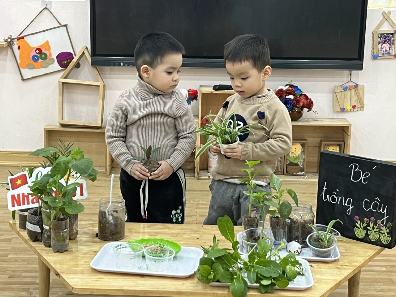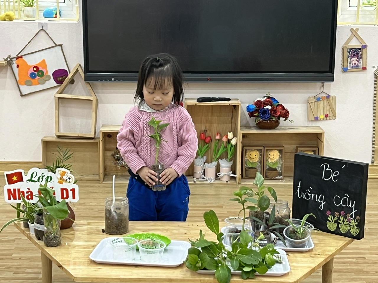 *Các Bé lớp C1 vui sướng khi được tham gia chăm sóc cây xanh của lớp và tập trồng cây thủy sinh: