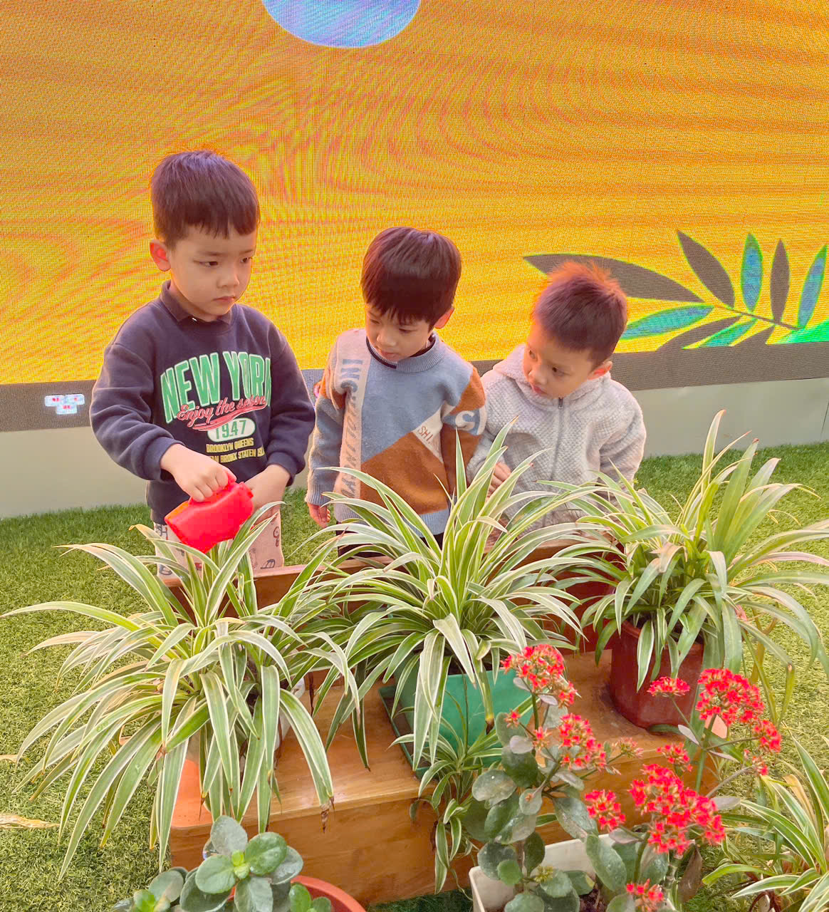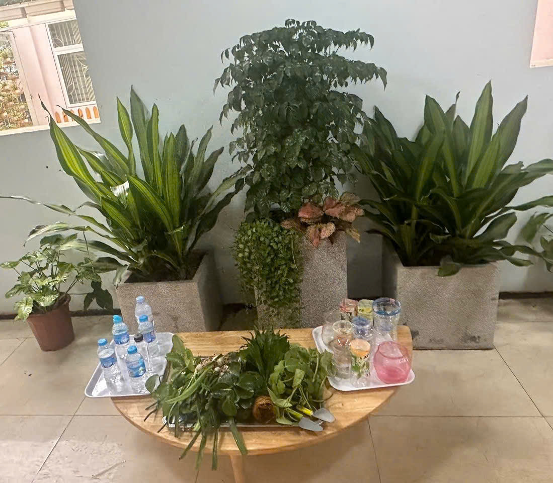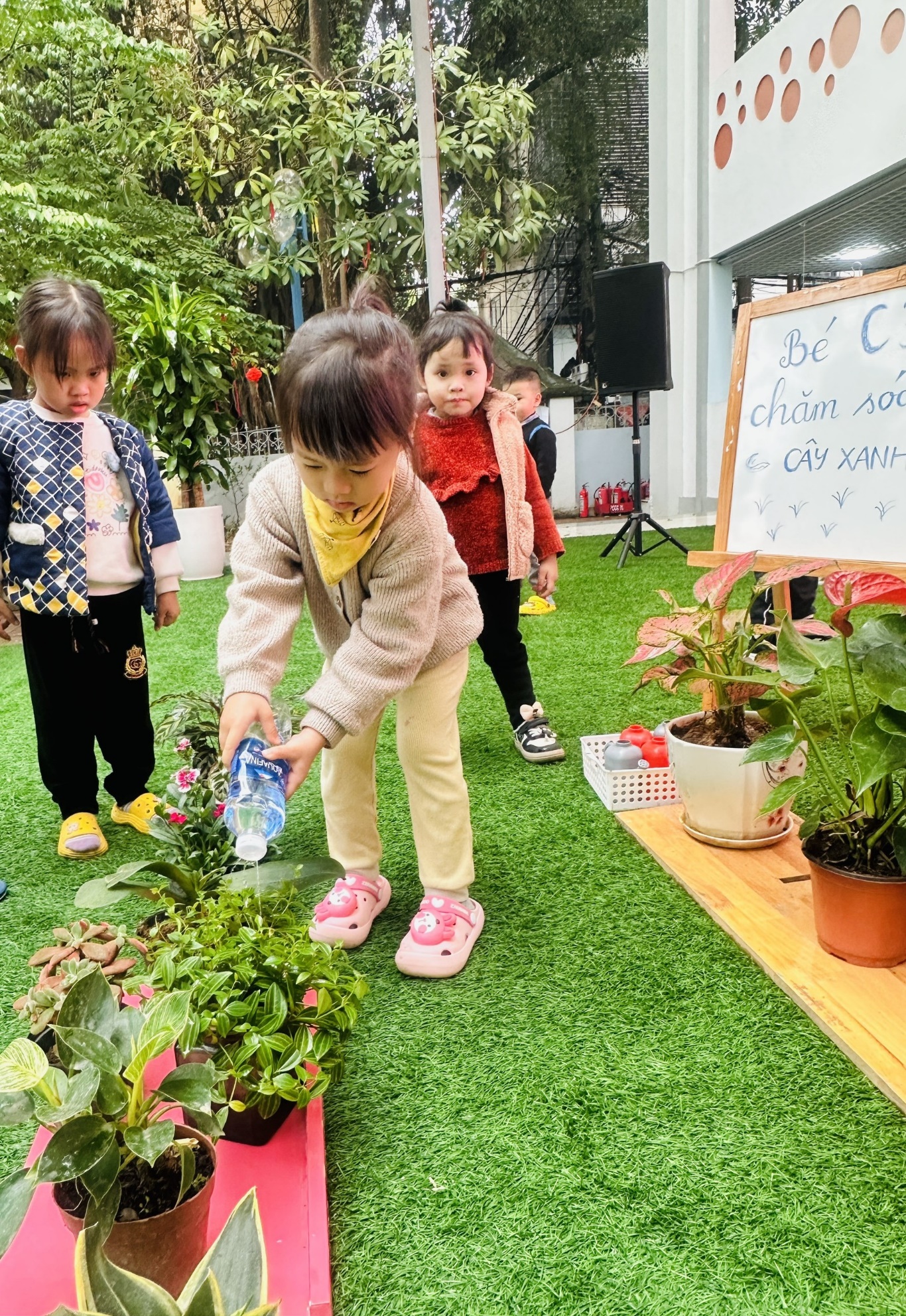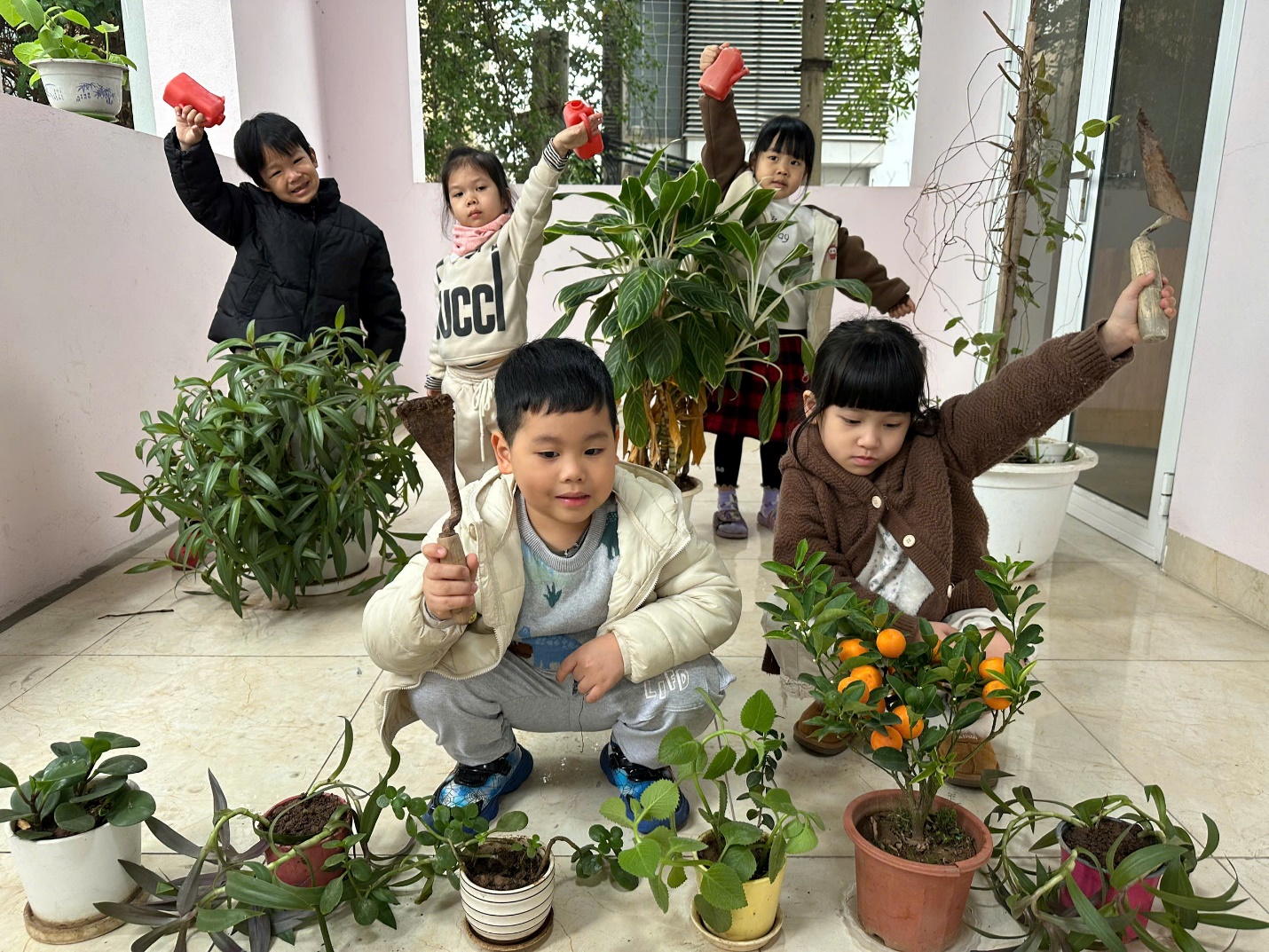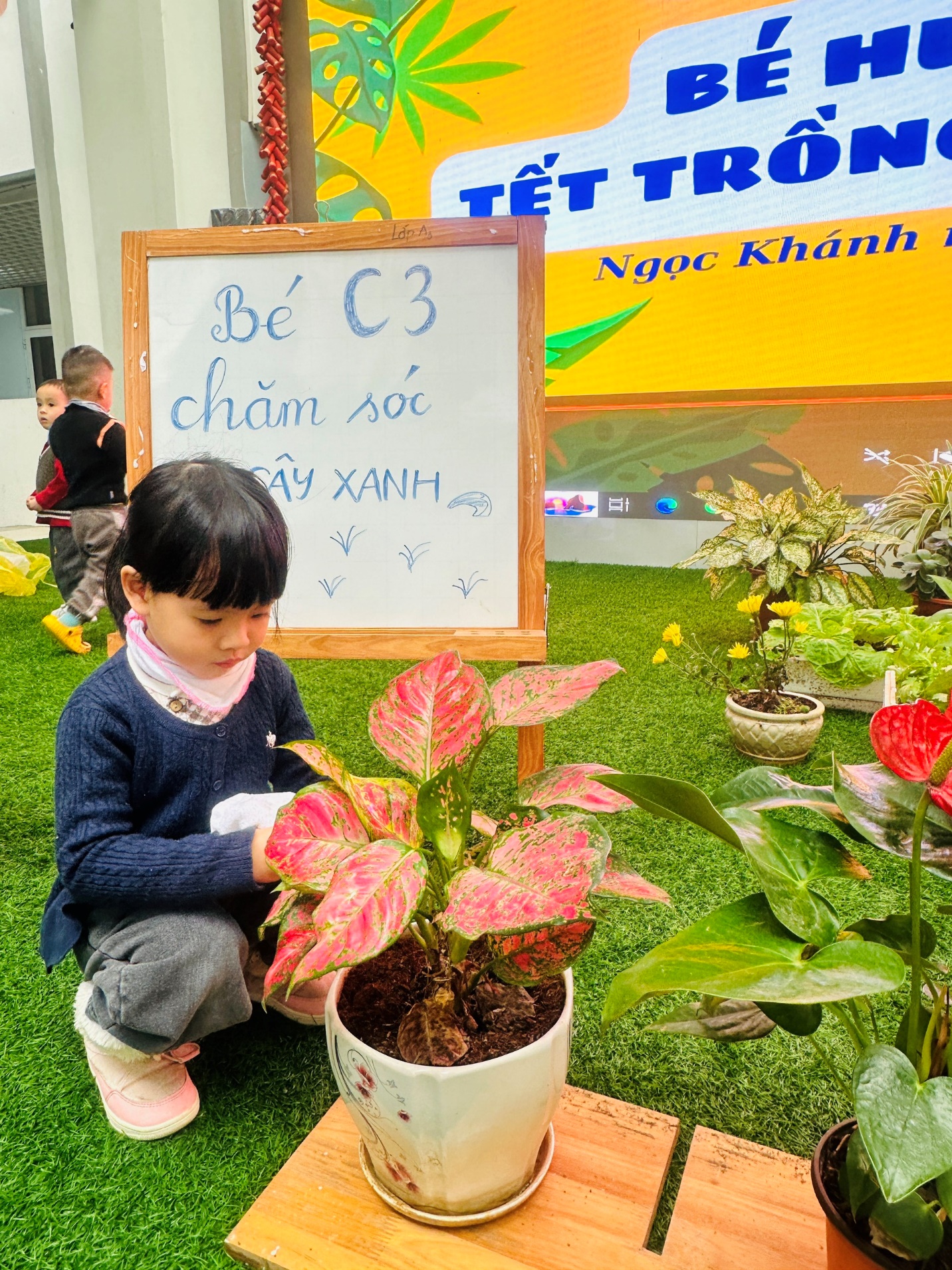*Các Bé lớp C1 vui sướng khi được tham gia chăm sóc cây xanh của lớp và tập trồng cây thủy sinh: