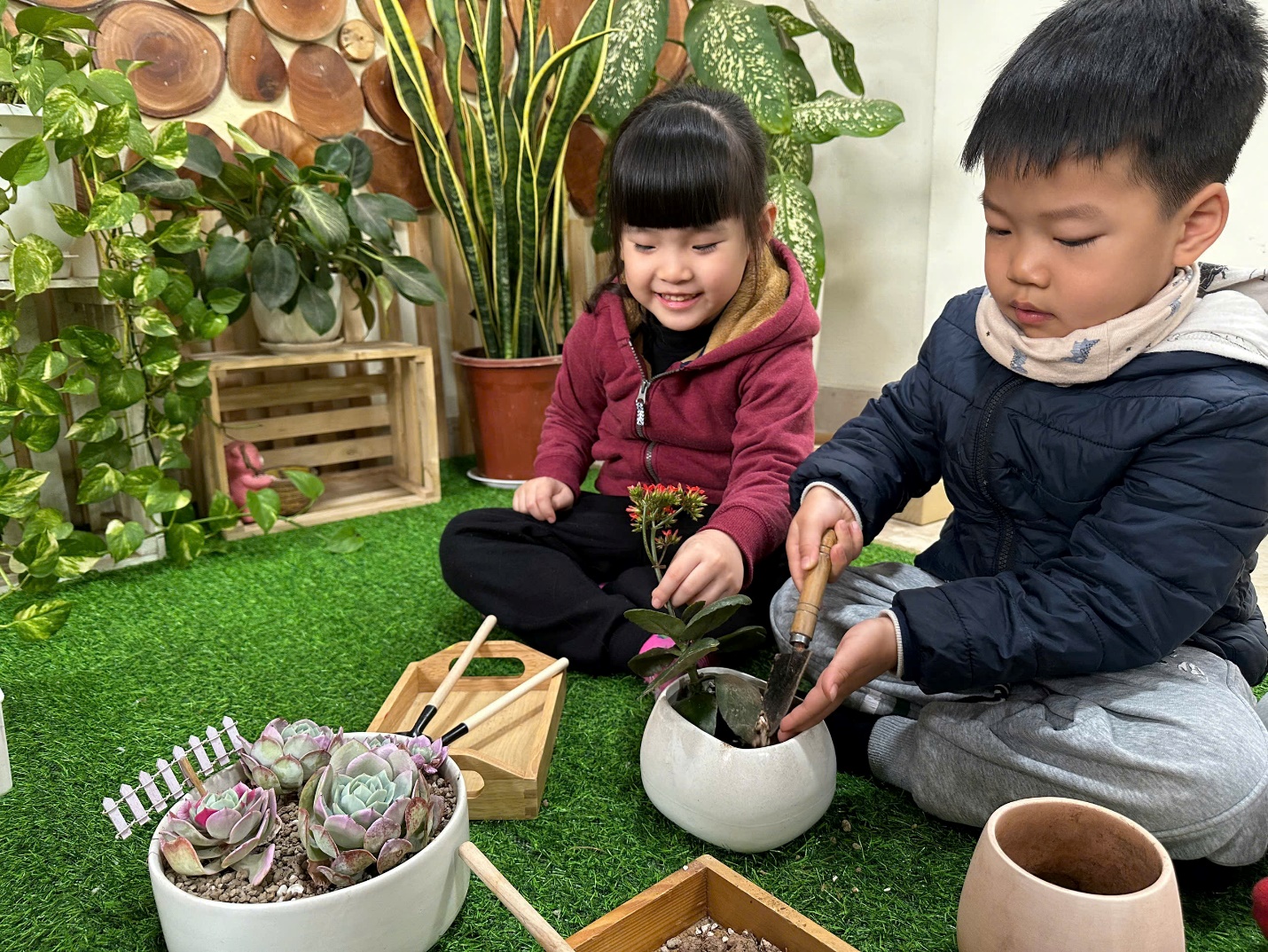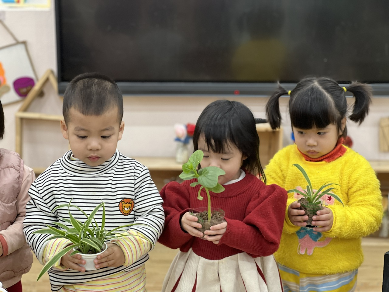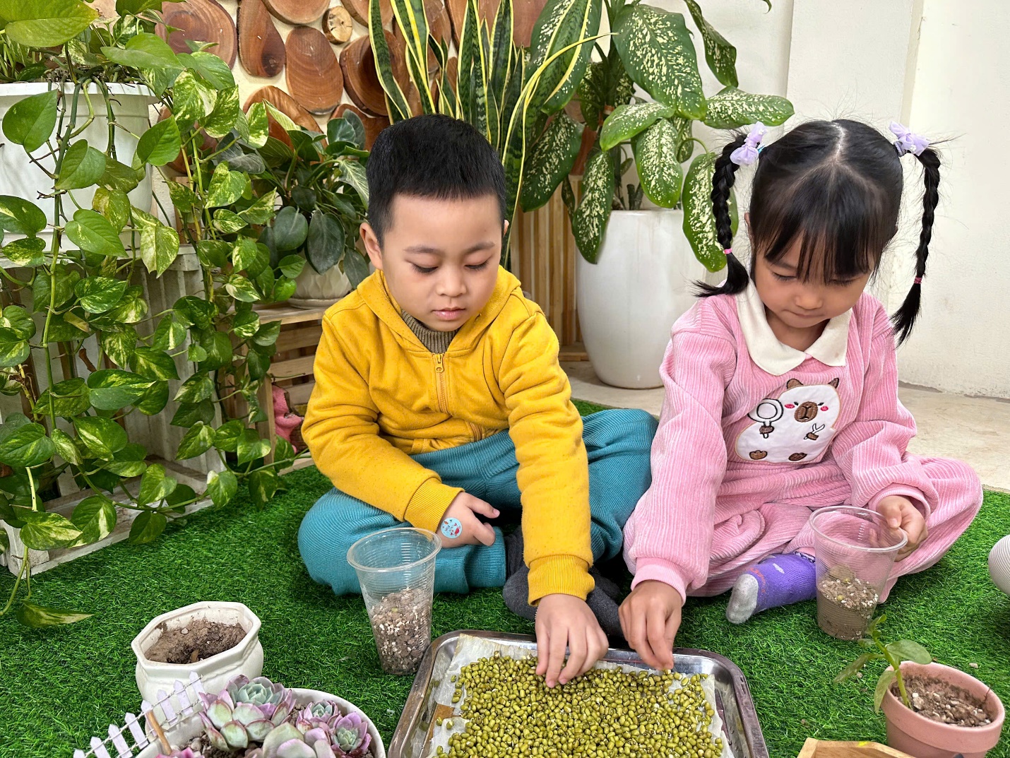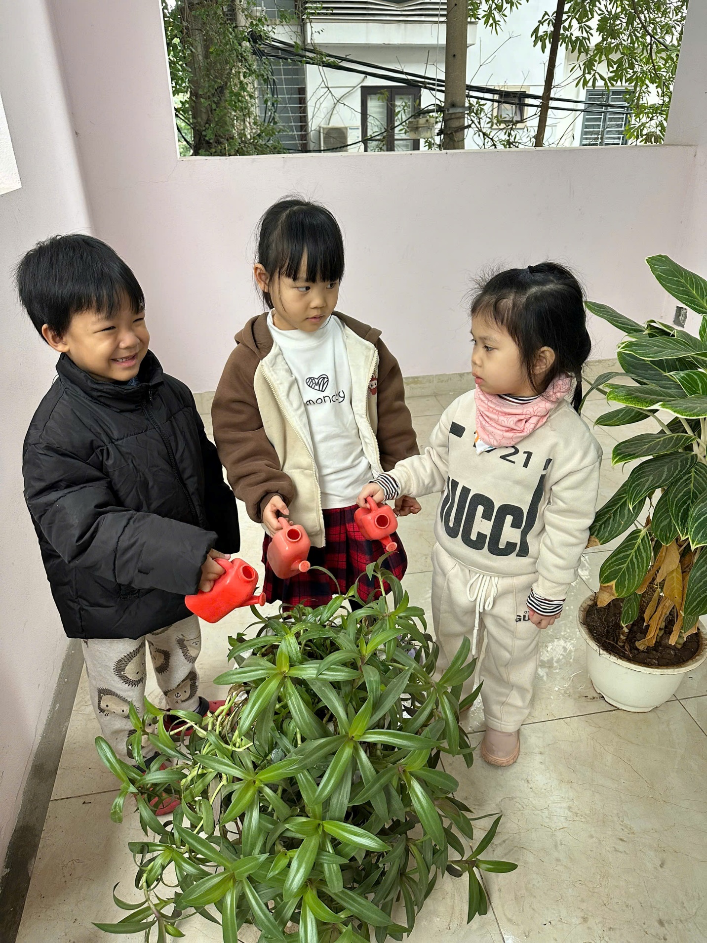 *Các Bé lớp C1 vui sướng khi được tham gia chăm sóc cây xanh của lớp và tập trồng cây thủy sinh: