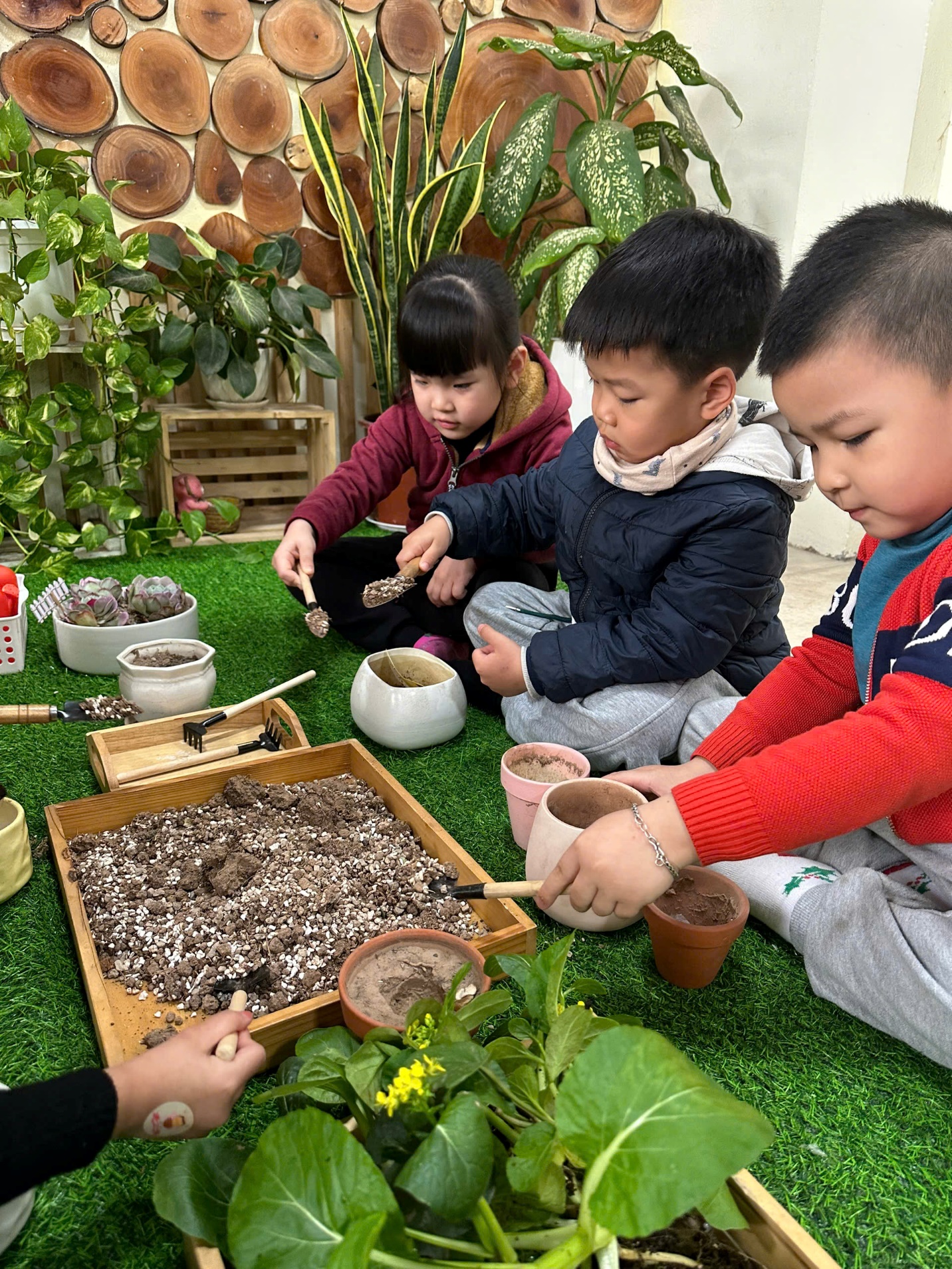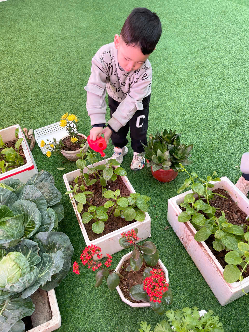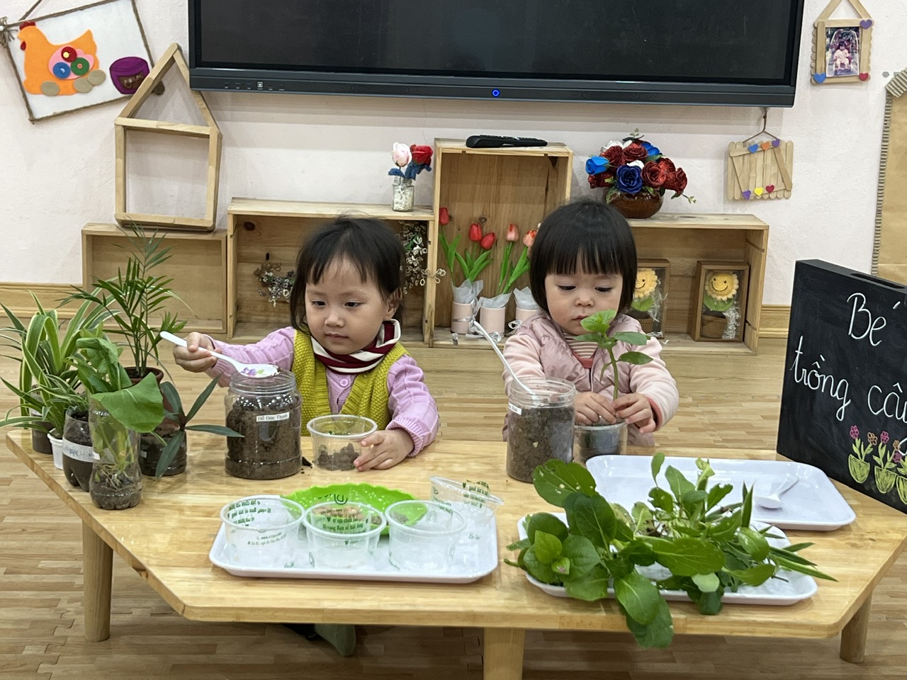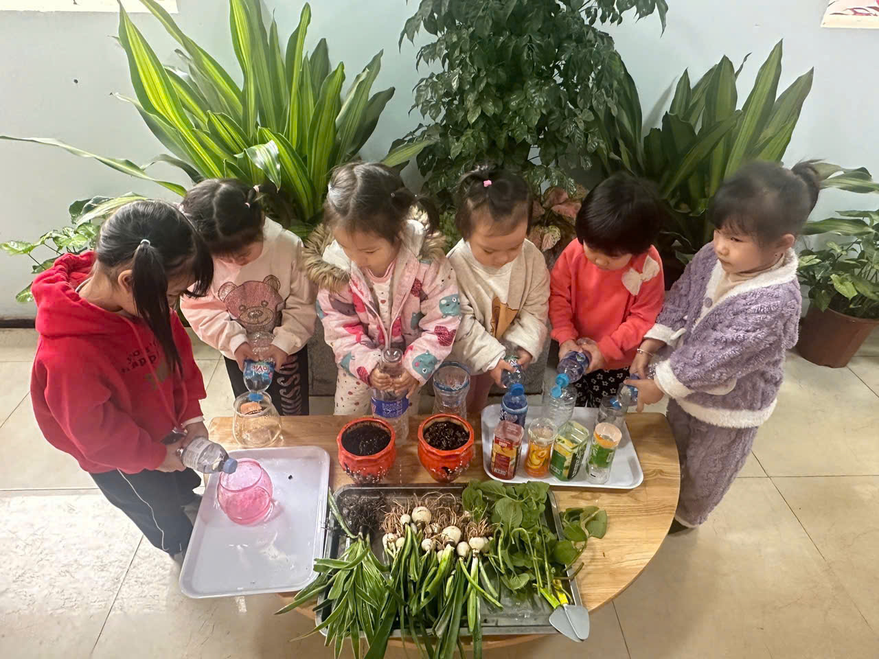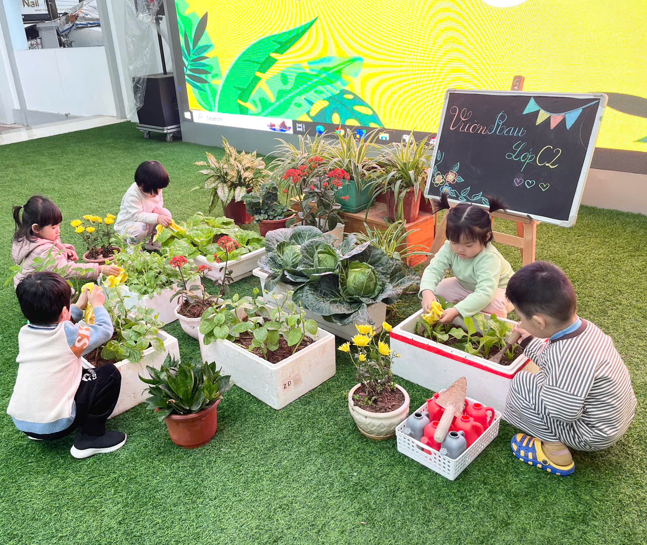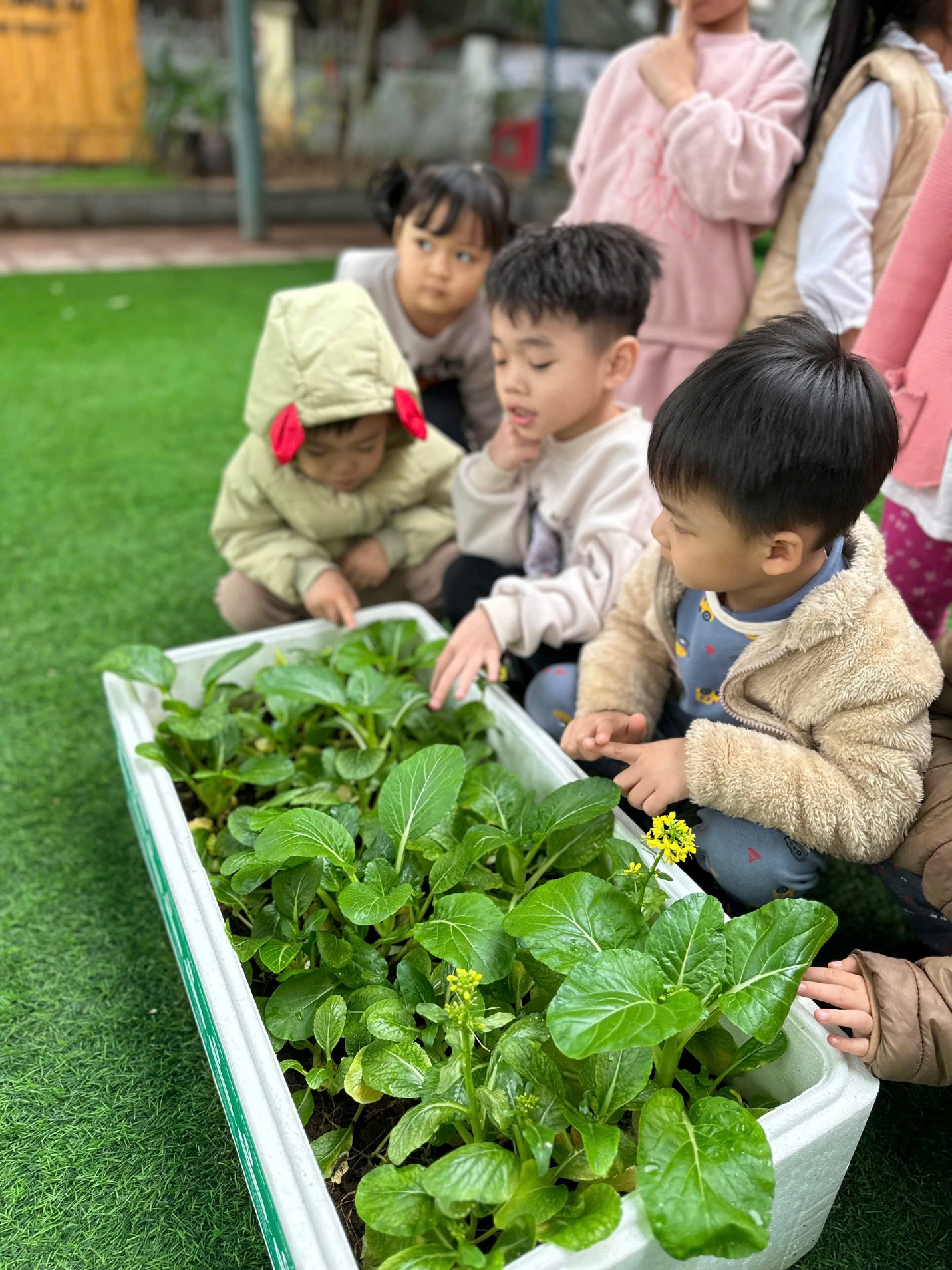 *Các Bé lớp MGB C2 cùng nhau chăm sóc và ngắm nhìn các bạn rau xanh đáng yêu!