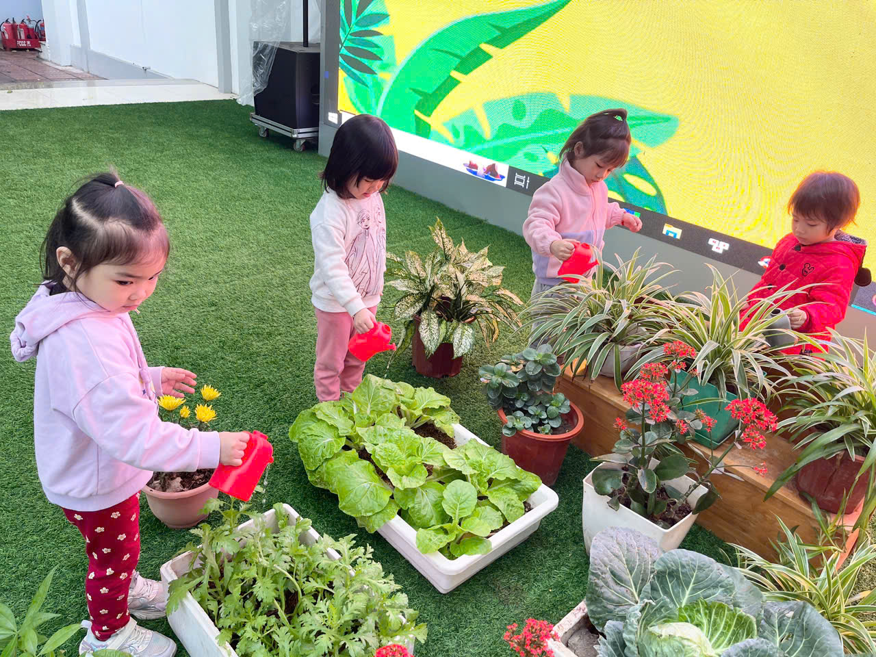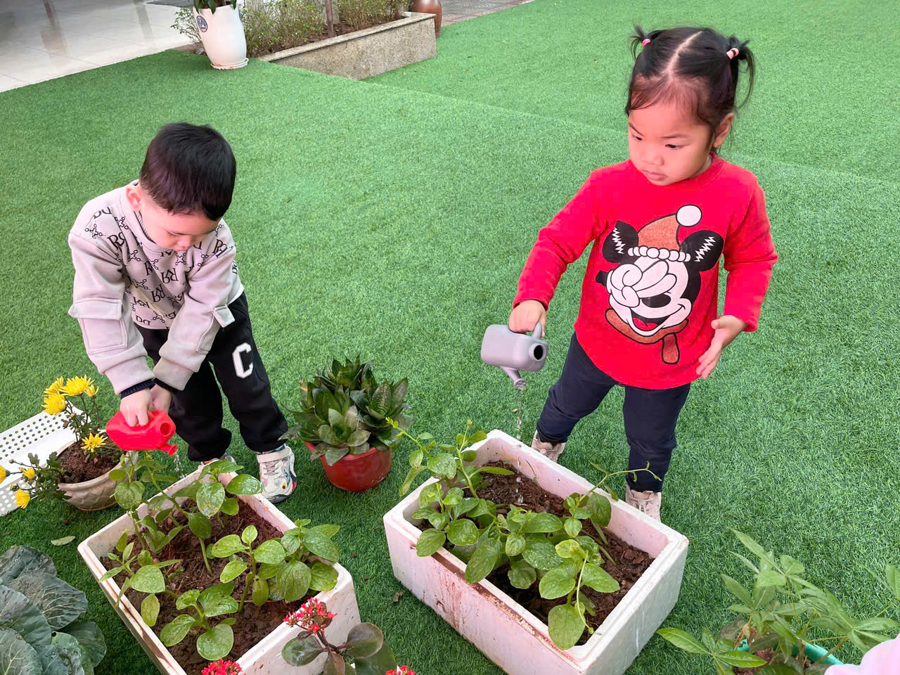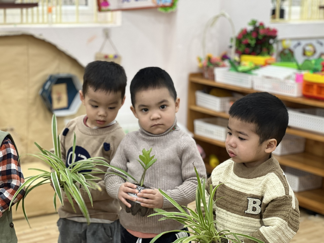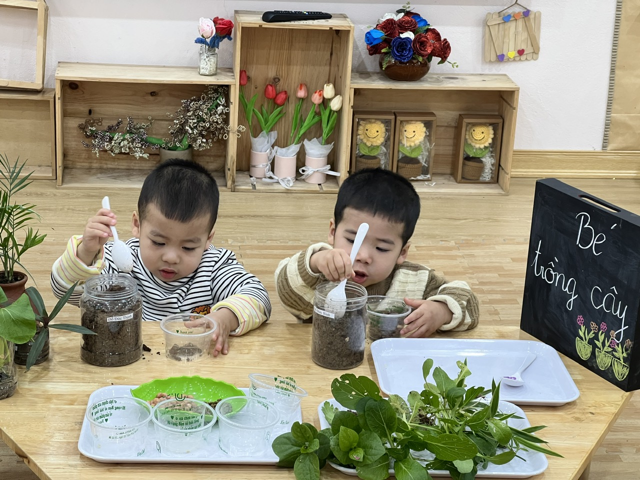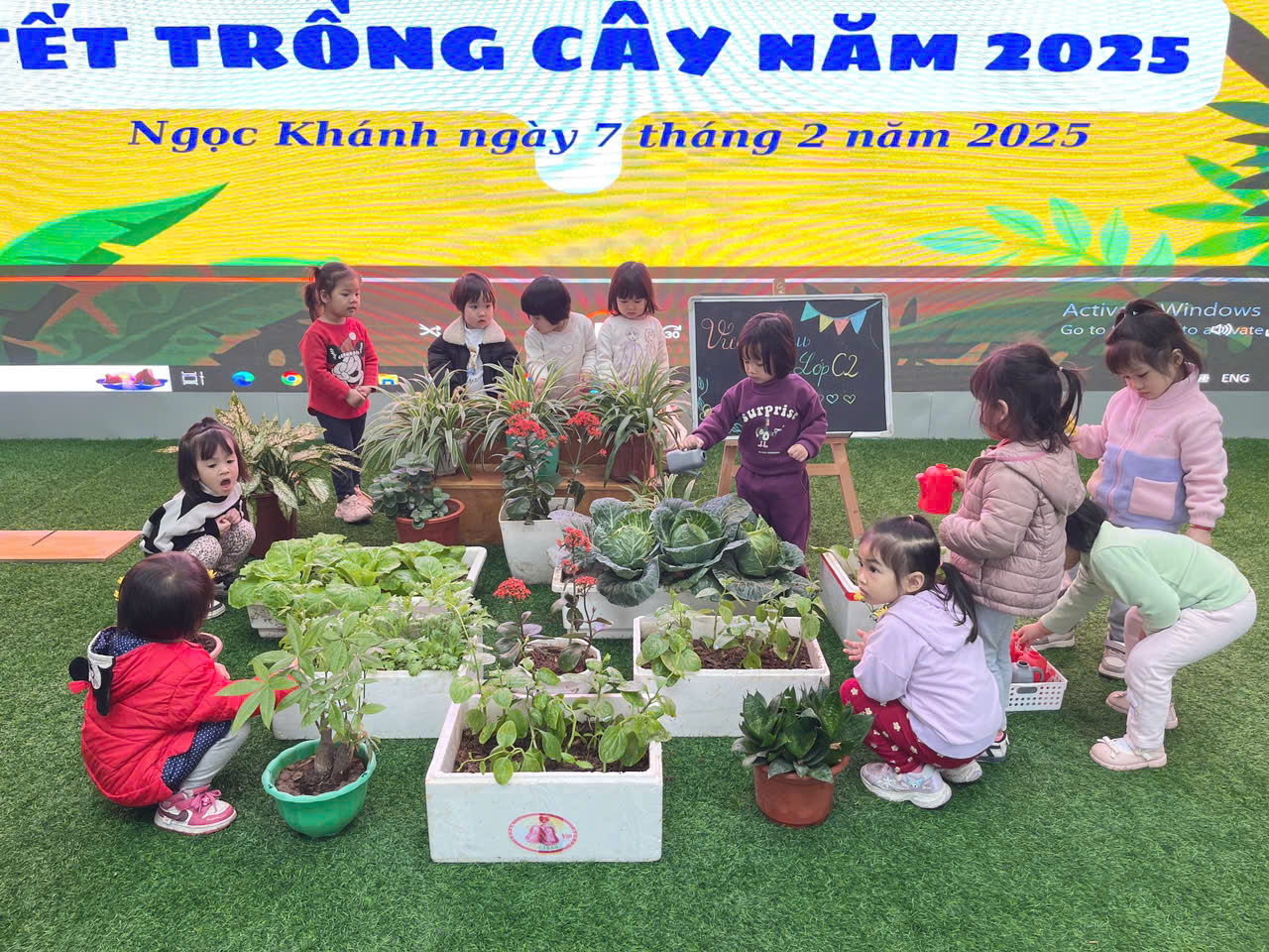 *Các Bé lớp MGB C2 cùng nhau chăm sóc và ngắm nhìn các bạn rau xanh đáng yêu!