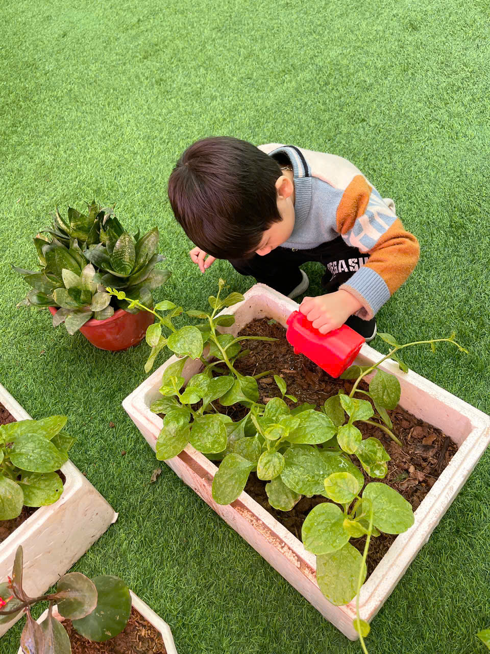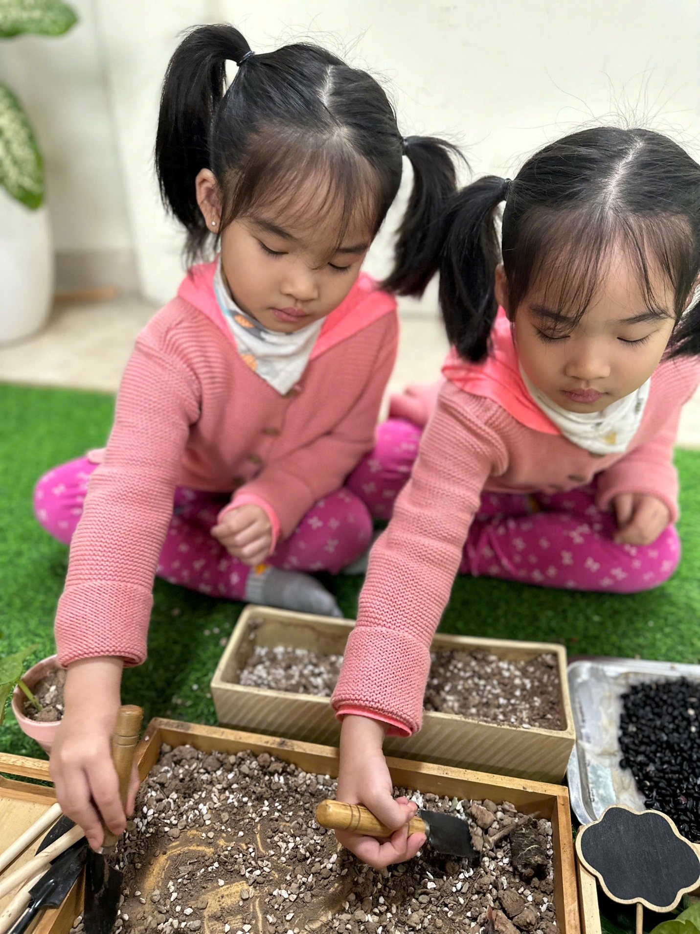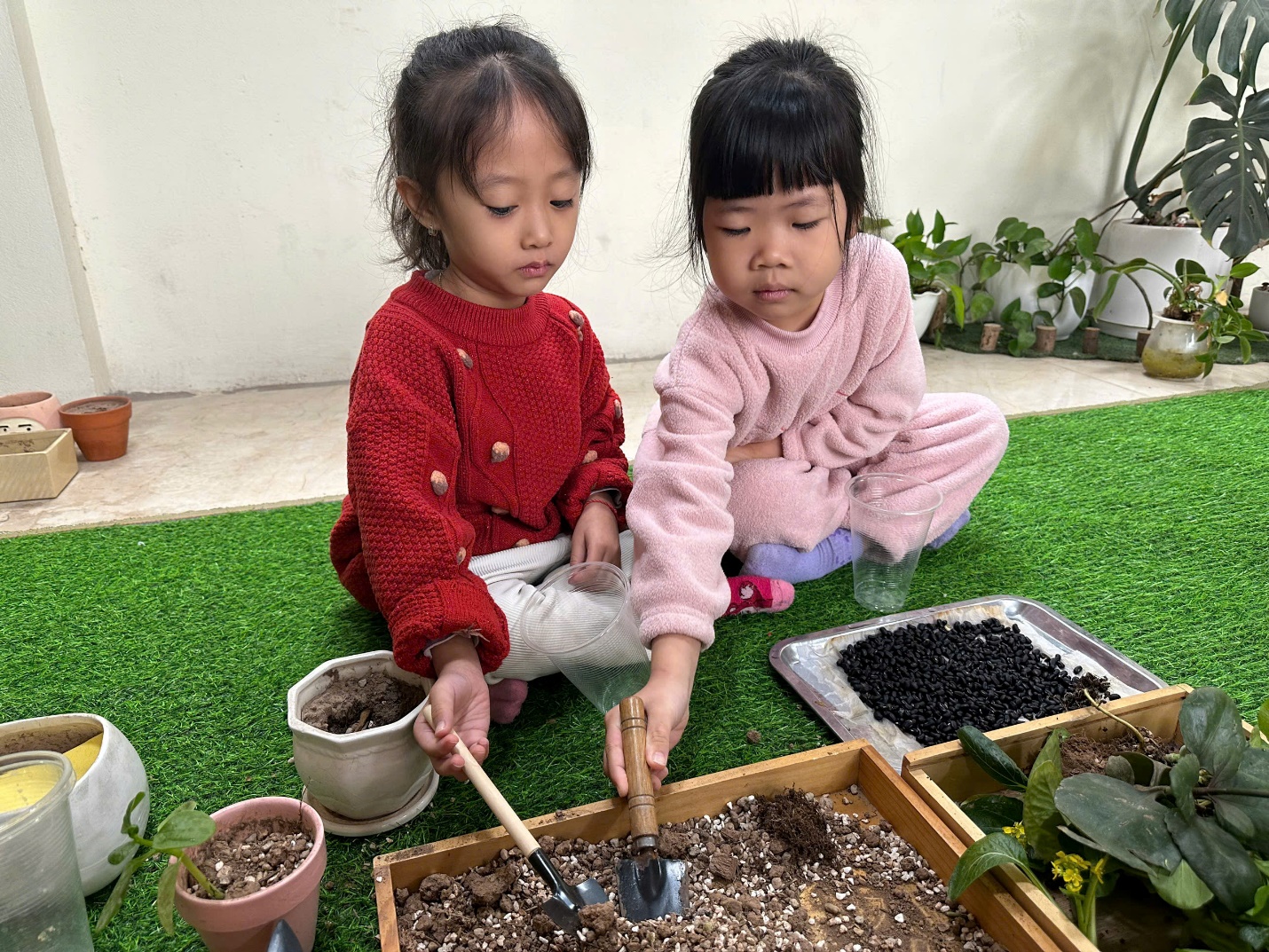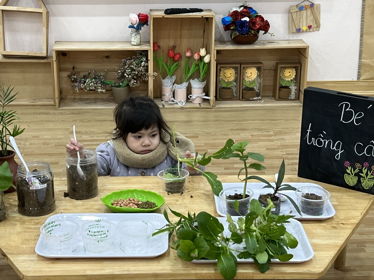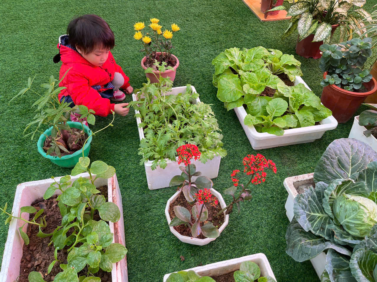 *Các Bé lớp MGB C2 cùng nhau chăm sóc và ngắm nhìn các bạn rau xanh đáng yêu!