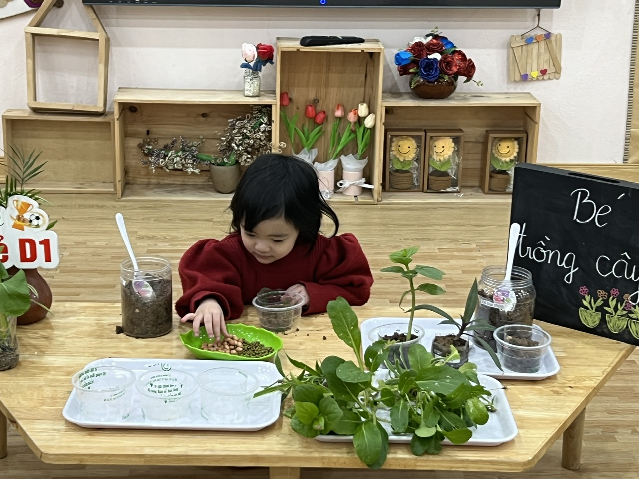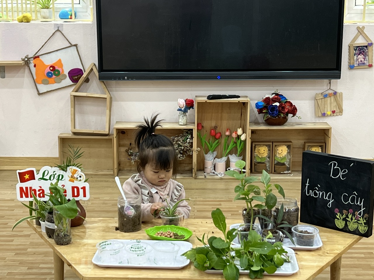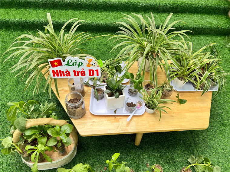 *Các Bé lớp nhà trẻ D1: Các cô giáo đã hướng dẫn các Bé cách trồng cây, gieo hạt, chăm sóc cây con...