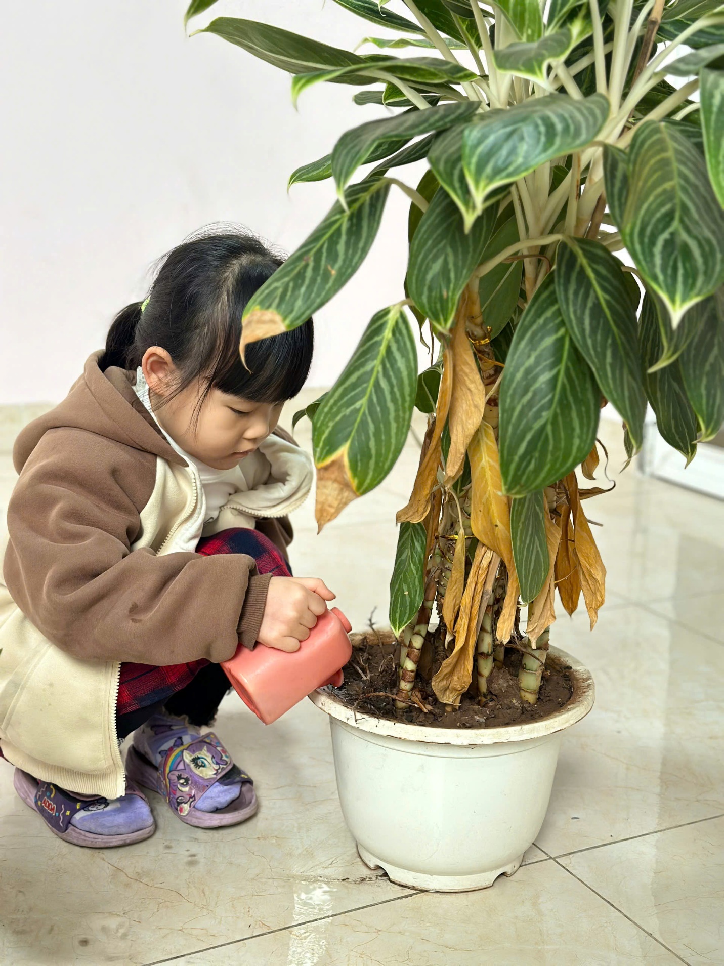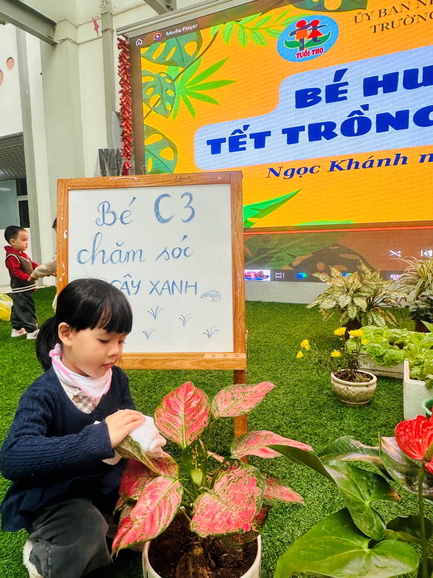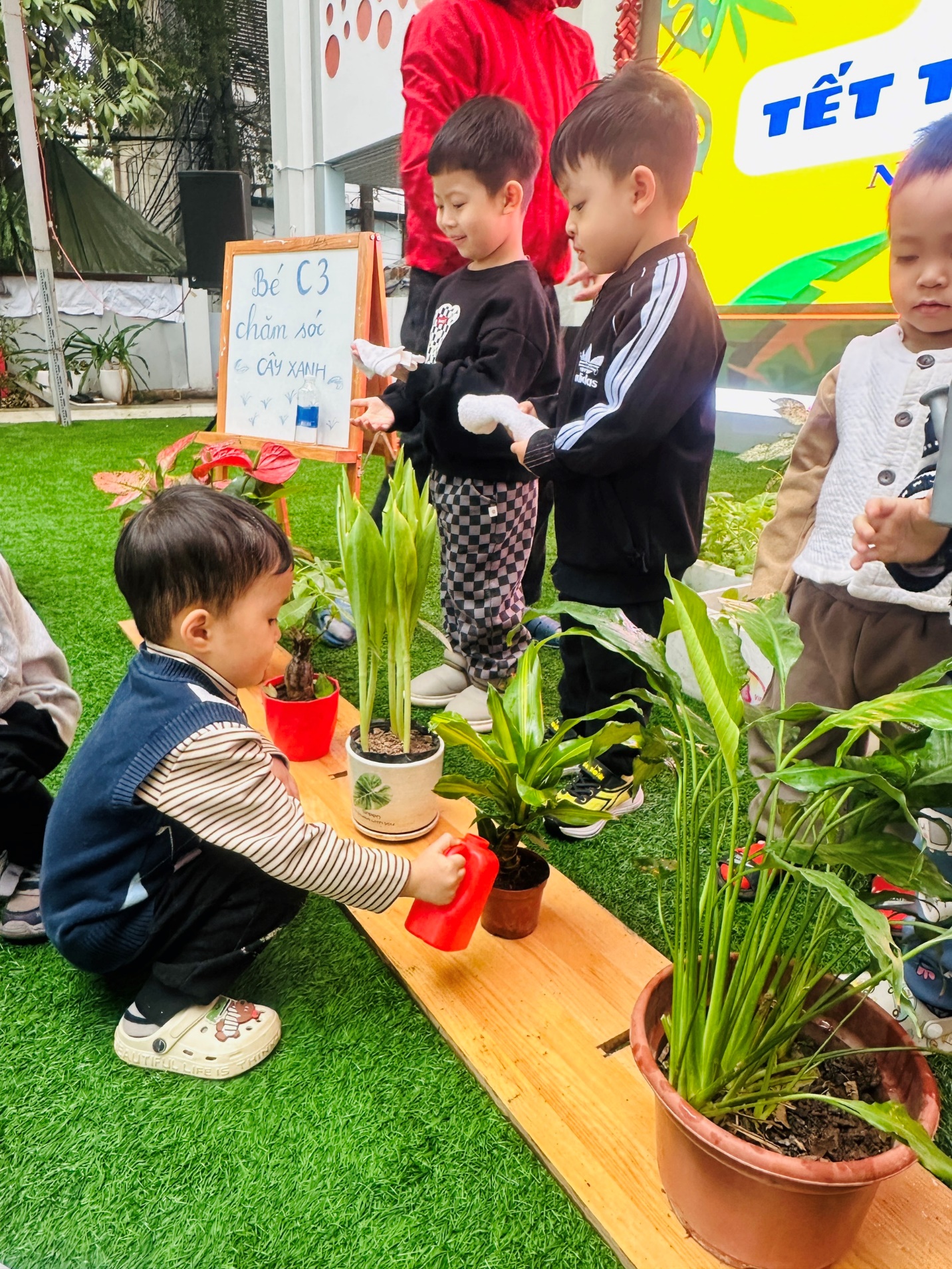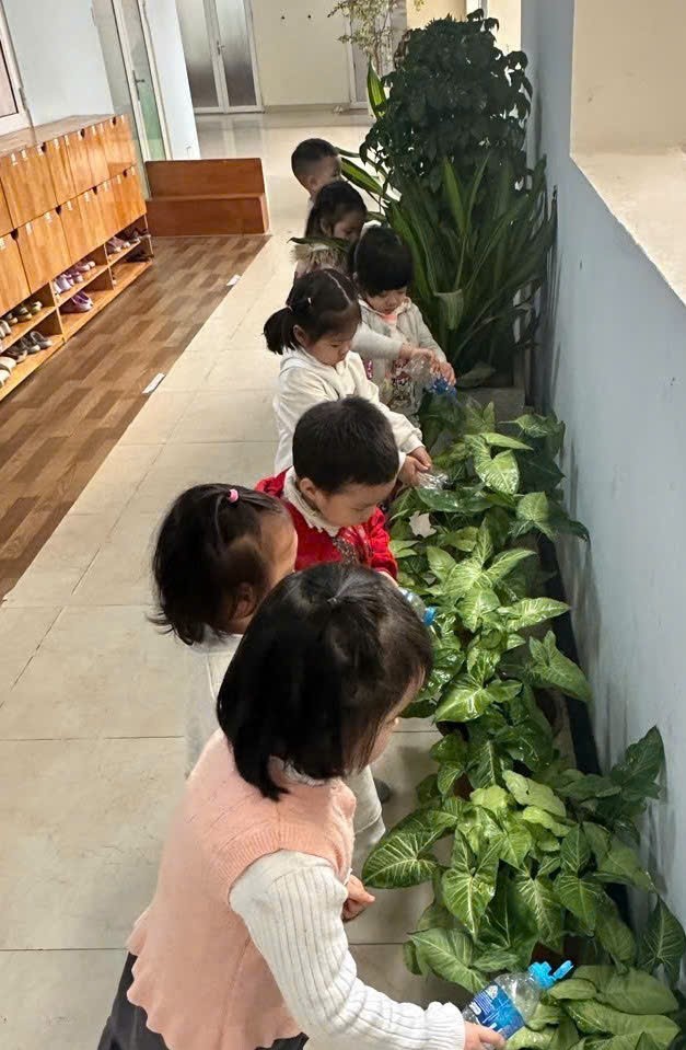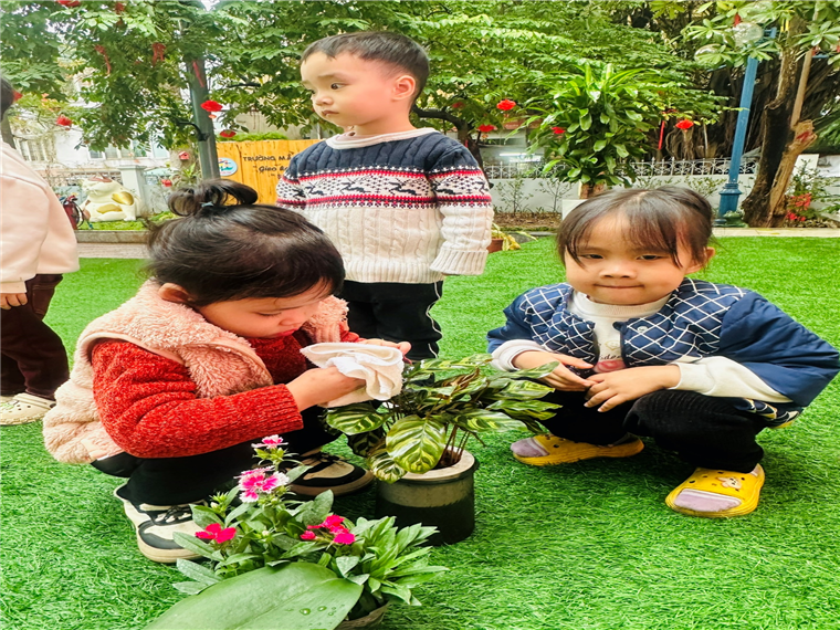 *Các Bé lớp MG Bé C3 tỉ mỉ lau từng chiếc lá, tưới nước, chăm sóc cho cây mau lớn, mãi xanh tươi.