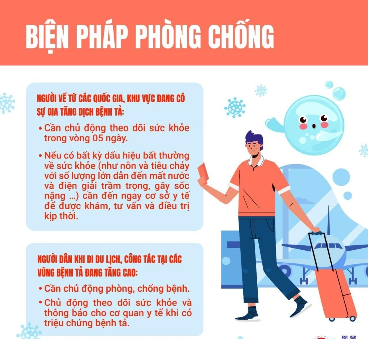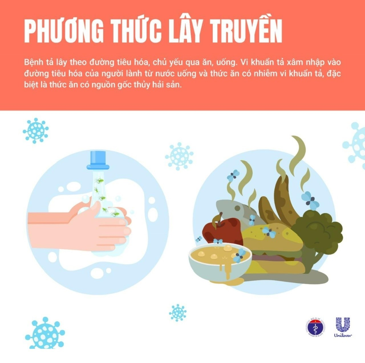 Bệnh tả là bệnh truyền nhiễm nguy hiểm do vi khuẩn Vibrio cholerae gây ra, có thể dẫn tới tiêu chảy cấp, mất nước, rối loạn điện giải và tử vong nếu không được điều trị kịp thời. Bệnh lây qua đường tiêu hóa, chủ yếu từ ăn uống thực phẩm, nguồn nước nhiễm khuẩn, đặc biệt là hải sản. Để chủ động phòng chống bệnh tả cần thực hiện