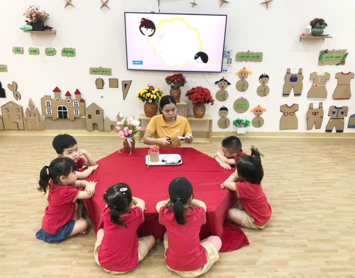 Hôm nay các bạn nhỏ lớp MGB C2 Trường Mẫu giáo Tuổi Thơ được cô giáo hướng dẫn kỹ năng sử dụng kéo và cắt trên giấy.