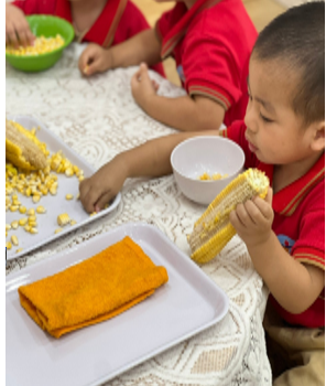 Hoạt động trải nghiệm: "Rèn kỹ năng tách hạt ngô "- Lớp Nhà trẻ D1