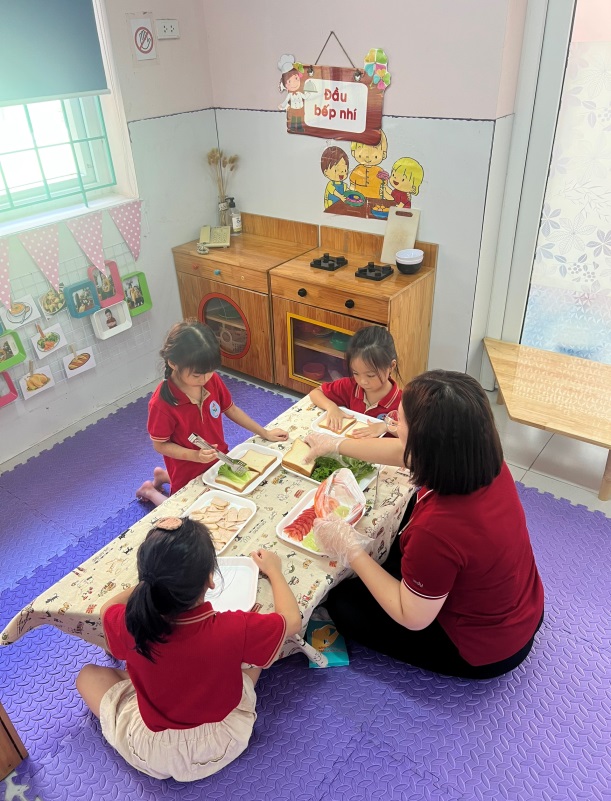 Cô và cháu cùng làm bánh mỳ kẹp