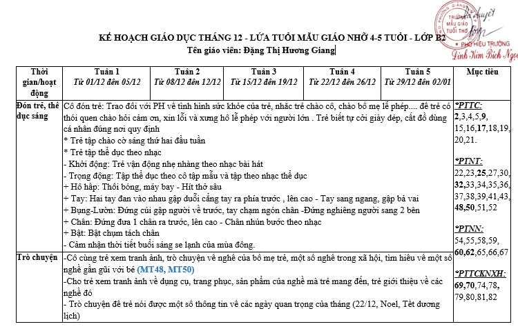 Kế hoạch hoạt động giáo dục tháng 12. Năm học 2025-2026. Lớp MGN B2