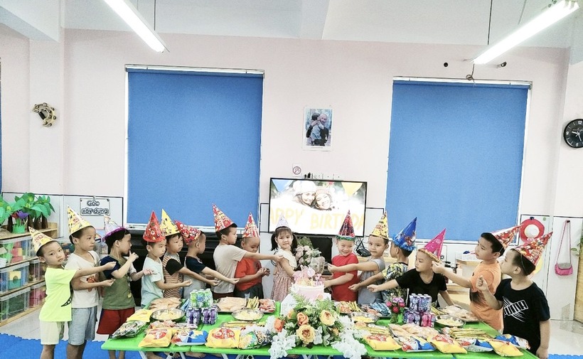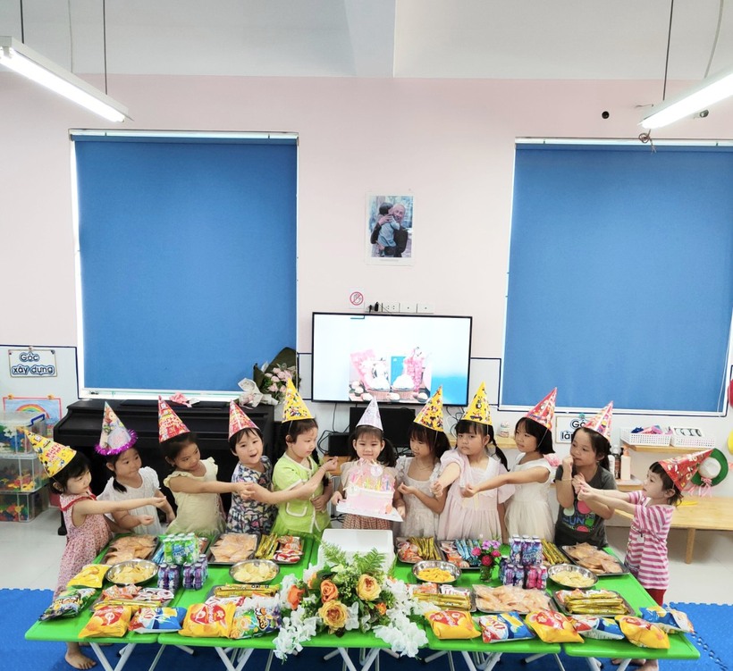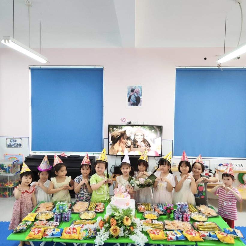 Trong buổi tiệc sinh nhật các Cô Minh Huyền và Tuyết Lệ đã hướng dẫn cho cả lớp hát tặng bạn bài hát sinh nhật, nói những lời chúc tốt đẹp, được thổi nến, được cắt bánh và chụp những kiểu ảnh thân thương, quay video gửi cho bố mẹ lưu lại làm kỷ niệm Sinh nhật ở lớp học sẽ là những kỷ niệm, dấu ấn đẹp trong tiềm thức của các con.