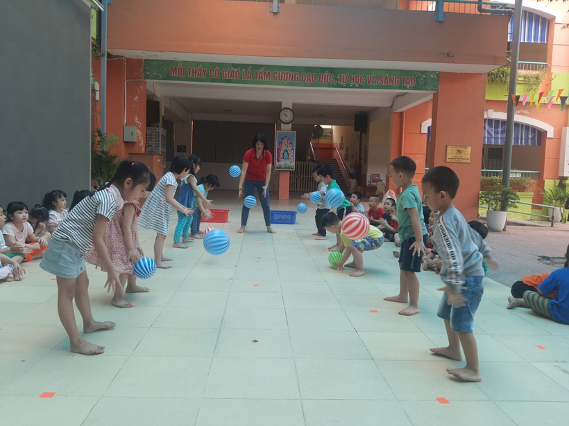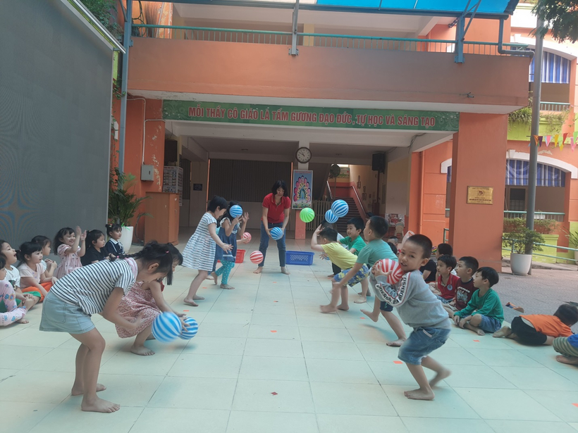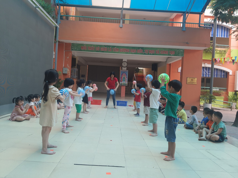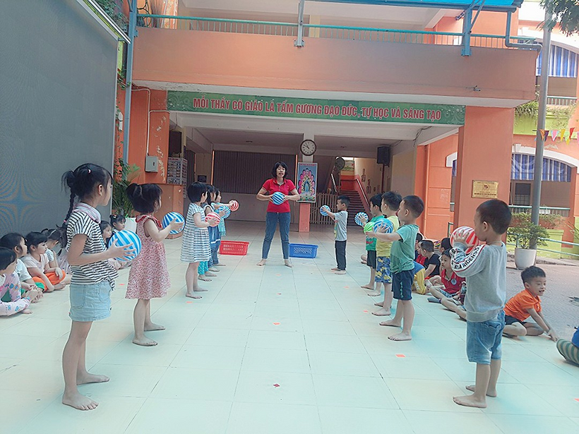 Cô giáo Tuyết Lệ dạy các cháu kỹ năng đập và bắt bóng