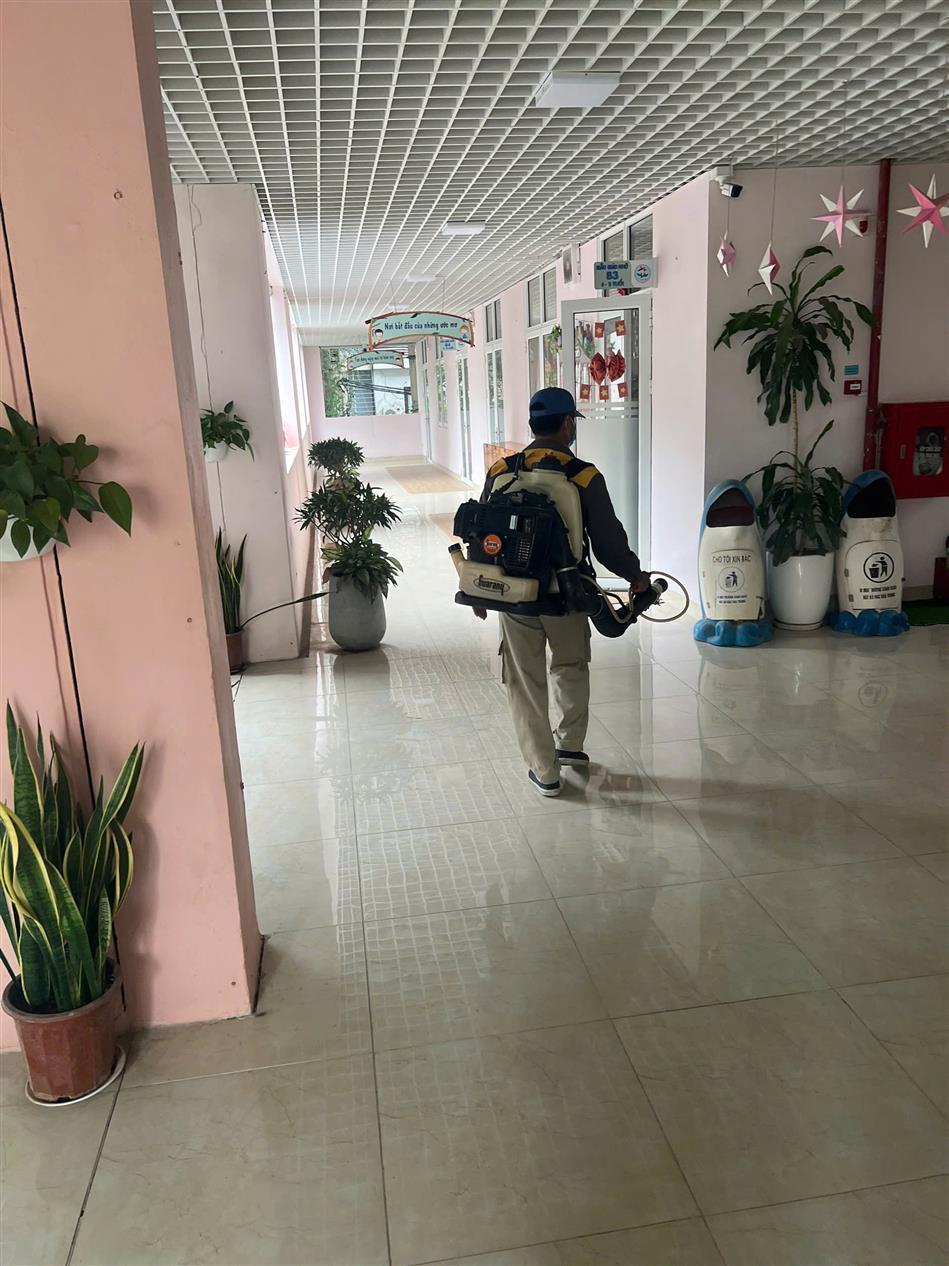Trạm Y tế phường Giảng Võ phối hợp phun khử khuẩn tại Trường mẫu giáo Tuổi Thơ