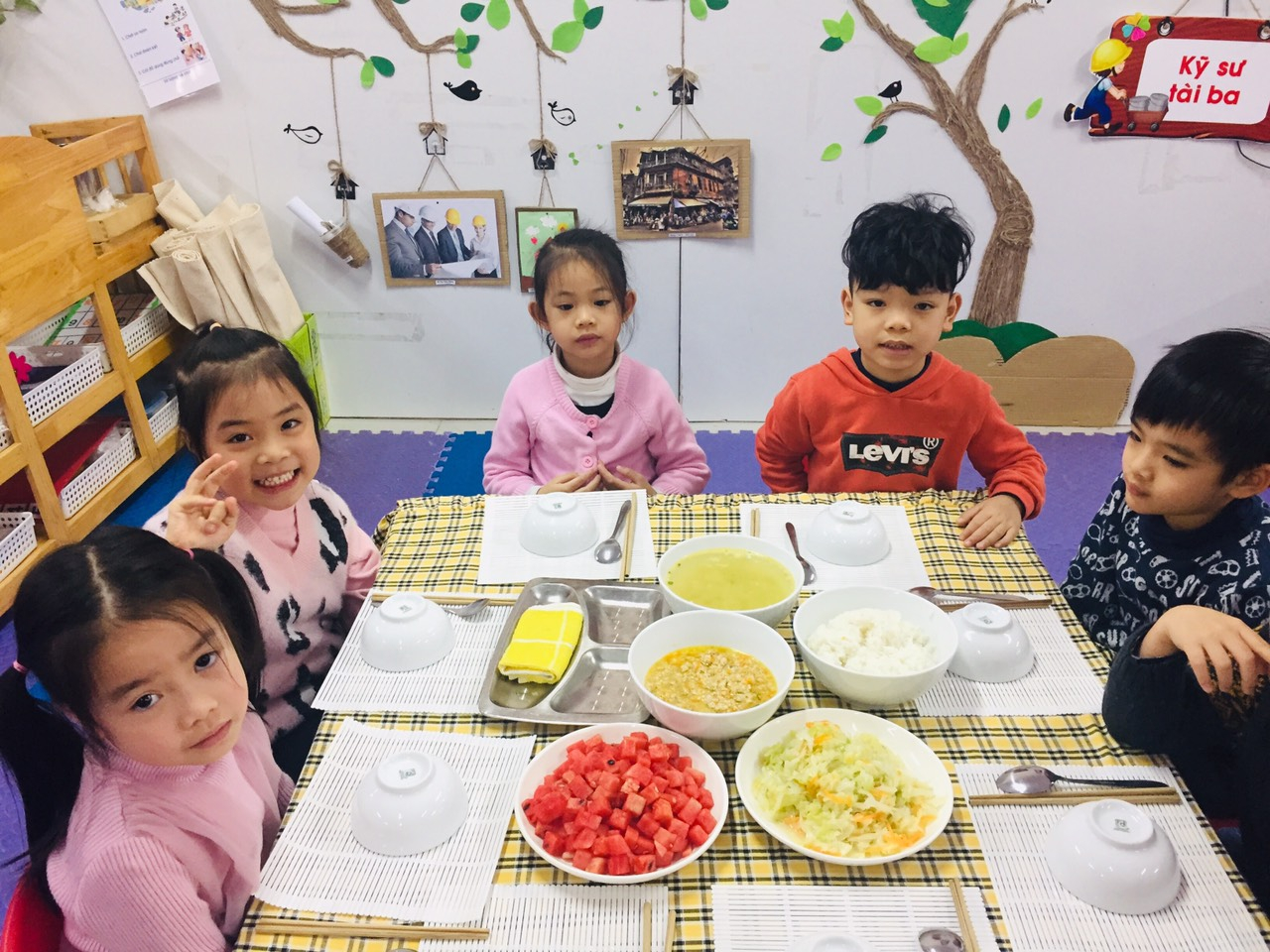 Bữa ăn gia đình tại trường mầm non có món mặn, món xào, món canh và tráng miệng, trẻ được lựa chọn thức ăn và ăn theo sở thích của mình. Tại bữa ăn trẻ được trải nghiệm cách tự lấy cơm, tự lấy thức ăn, được sử dụng đũa để gắp thức ăn và cùng mời các bạn ăn cơm. Trẻ được trải nghiệm văn hóa ăn uống, văn hóa ứng xử trong bữa ăn, không khí ấm áp thân thương của gia đình.