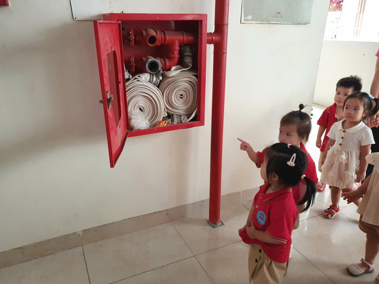 Các Bé lớp MGN B3 quan sát cách sử dụng bình cứu hỏa