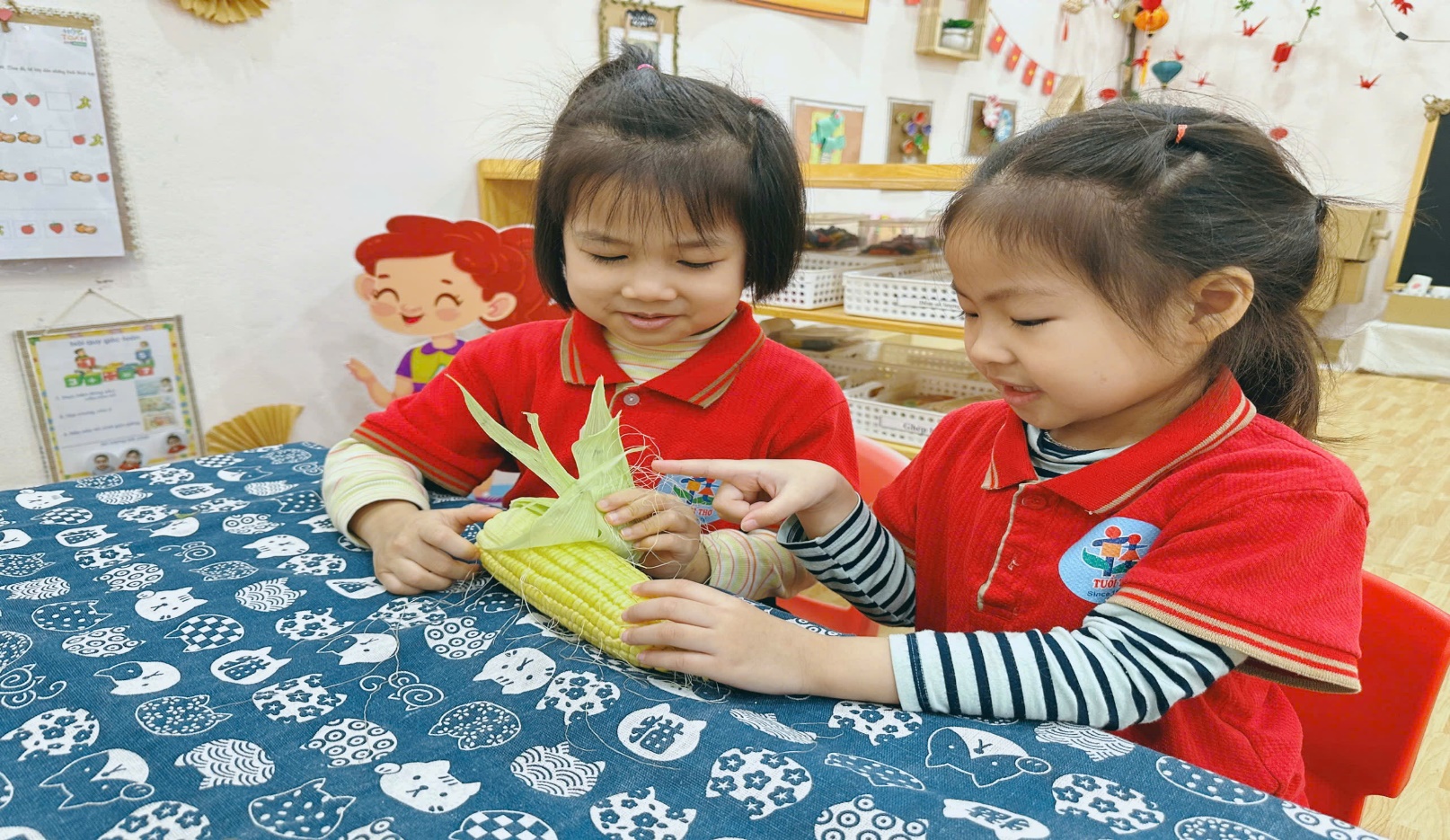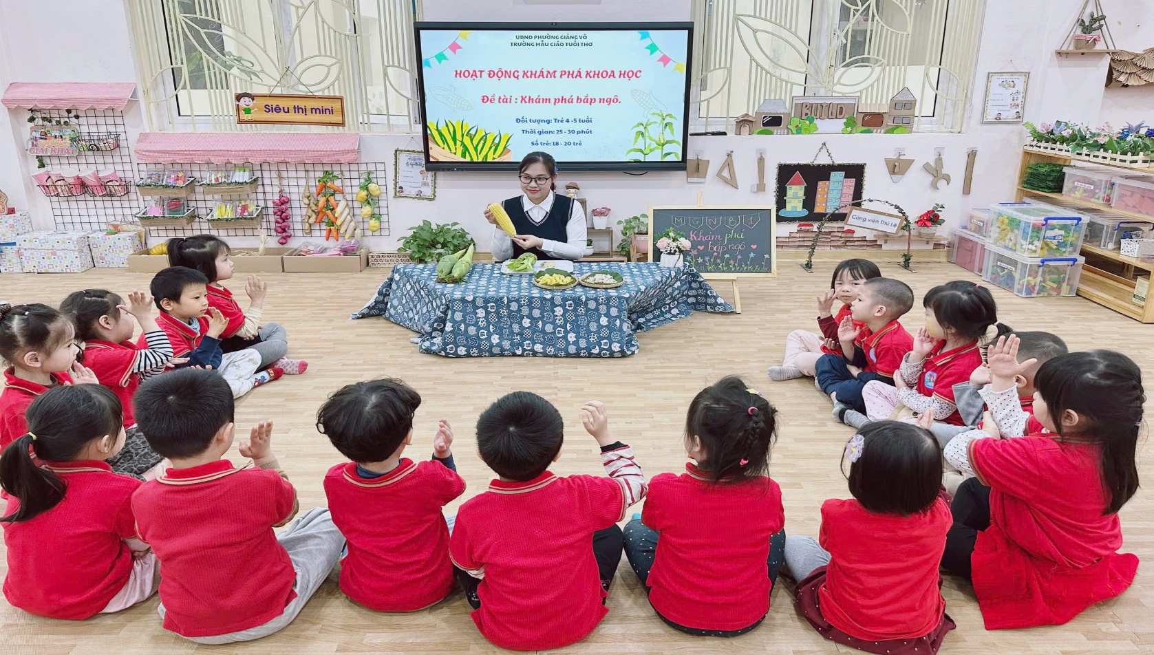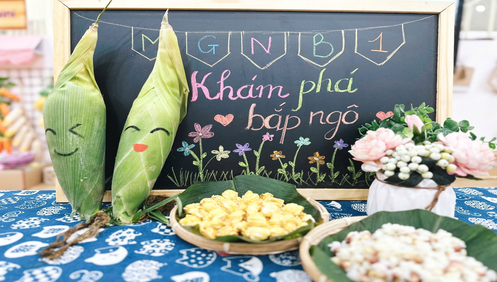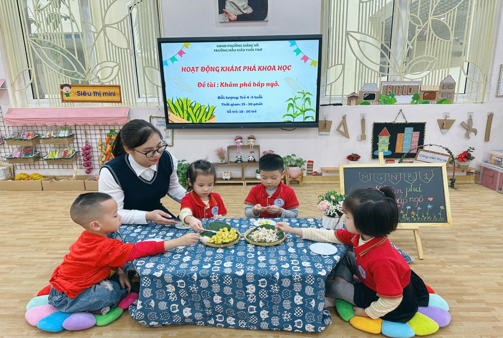 Không gian học tập gần gũi, giàu tính trải nghiệm. Hoạt động được giáo viên lớp Mẫu giáo Nhỡ B1 chuẩn bị chu đáo với những bắp ngô tươi, ngô đã tách hạt và các sản phẩm chế biến từ ngô. Không gian học tập được trang trí sinh động, thân thiện, giúp trẻ dễ dàng quan sát, khám phá và chủ động tham gia vào các hoạt động.