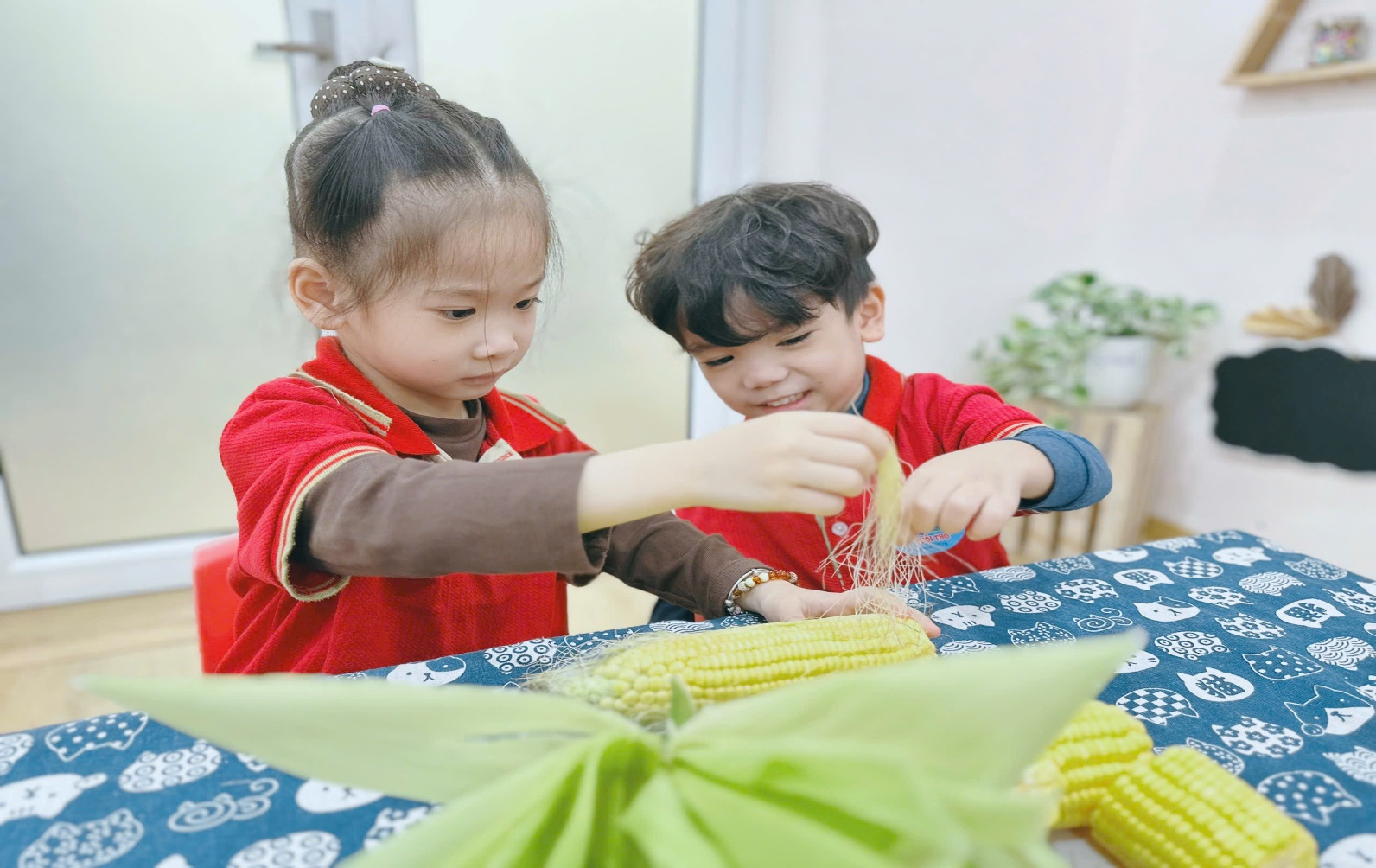 Trong quá trình khám phá, các bé được trực tiếp quan sát, sờ, bóc vỏ bắp ngô, tìm hiểu các bộ phận như vỏ ngô, râu ngô và hạt ngô. Dưới sự hướng dẫn nhẹ nhàng của cô giáo, trẻ mạnh dạn trả lời câu hỏi, chia sẻ suy nghĩ và thể hiện sự tò mò, thích thú với hoạt động khám phá.