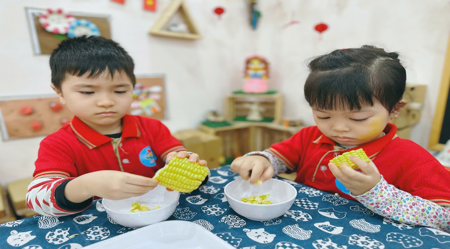 Các bé thực hành tách hạt ngô – hoạt động giúp phát triển vận động tinh và sự tập trung.