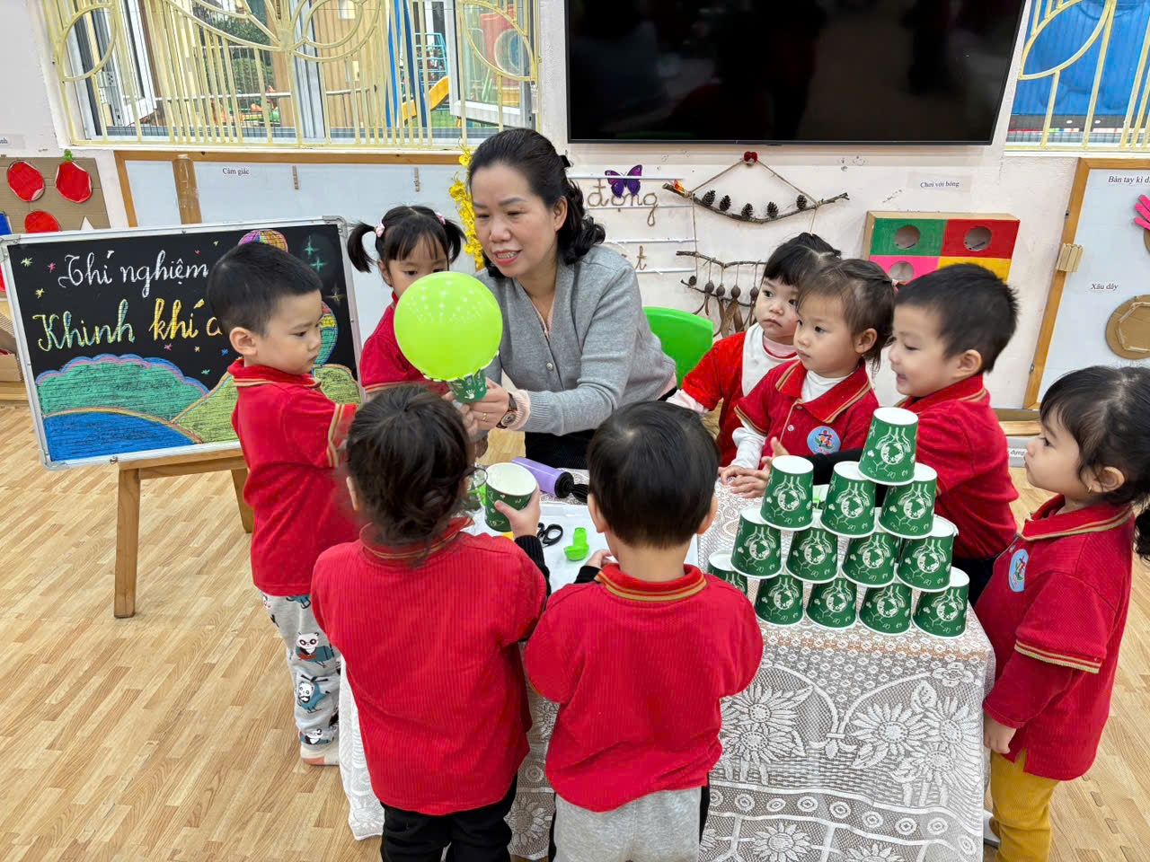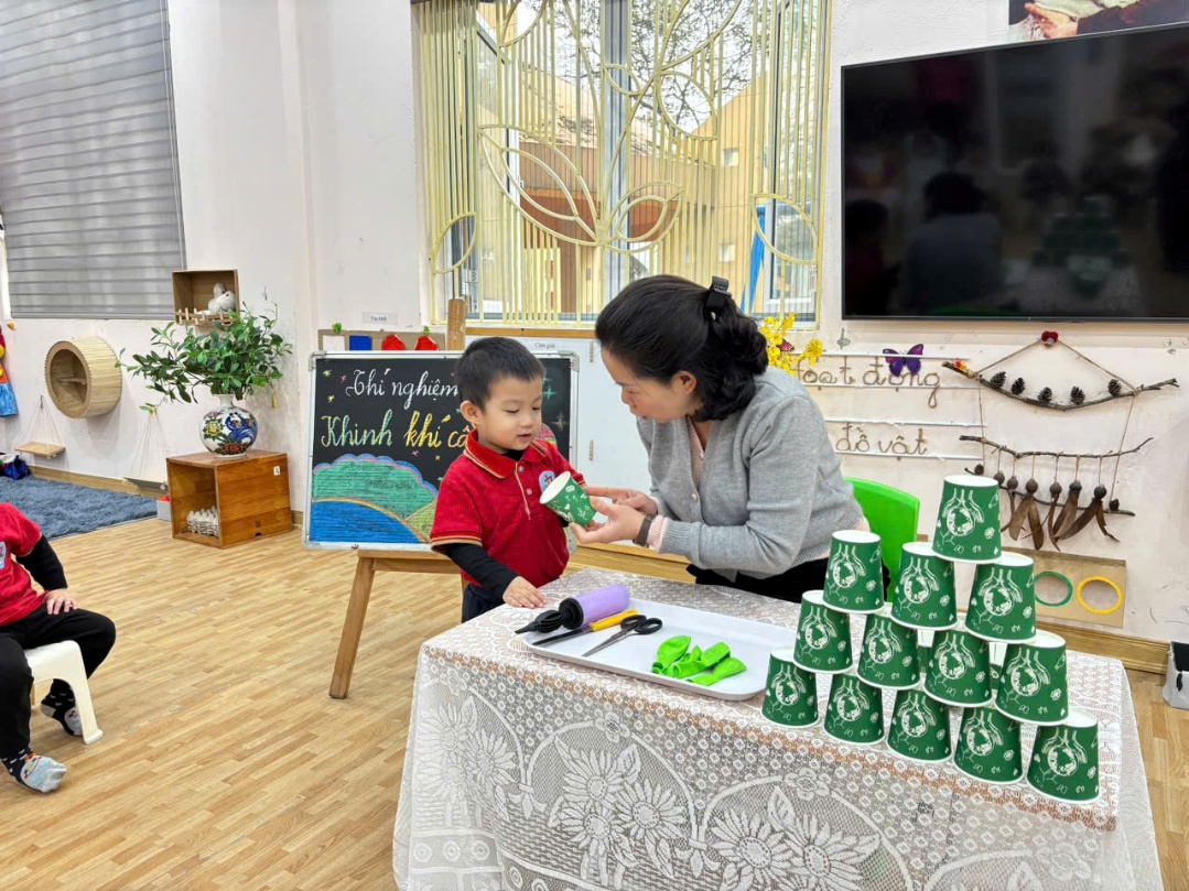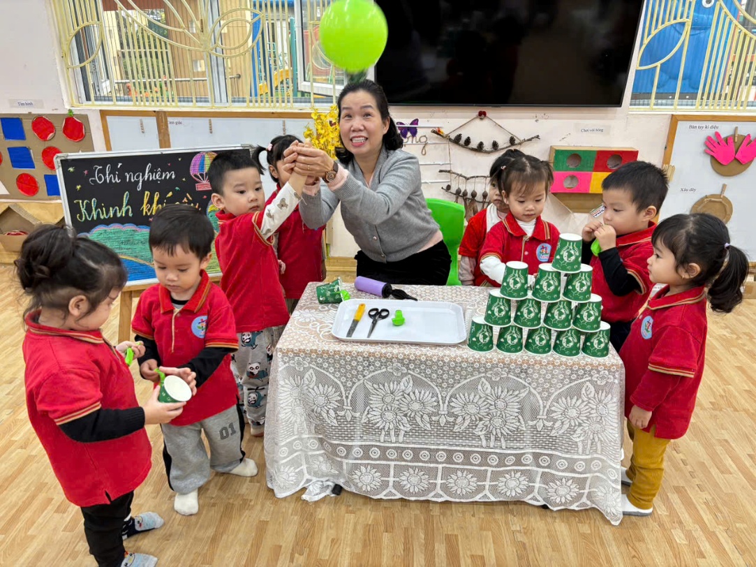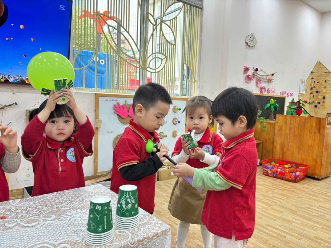 Hôm nay, lớp học D2 bỗng chốc biến thành một “phòng thí nghiệm tí hon”. Các bạn nhỏ đã cùng nhau khám phá cách một chiếc cốc giấy + quả bóng bay lại có thể biến thành khinh khí cầu mini siêu thú vị!
