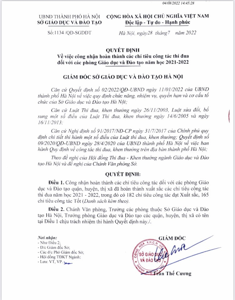 Sở GDĐT chính thức ban hành kết quả chấm 13/13 lĩnh vực công tác GDĐT năm học 2021-2022, theo đó 13/13 lĩnh vực công tác của quận xếp loại Xuất sắc. Quận Ba Đình vươn lên xếp thứ 3/30 quận, huyện, thị xã (tăng 03 bậc so với năm học trước; tăng 14 bậc so với đầu nhiệm kỳ Đại hội), hoàn thành chỉ tiêu KT-XH quận giao năm 2022; Phòng GDĐT quận được Giám đốc Sở trình Chủ tịch UBND Thành phố tặng Cờ đơn vị xuất sắc dẫn đầu phong trào thi đua. Thay mặt ngành GDĐT quận, xin cảm ơn và chúc mừng các đ/c CQBL, GV, NV toàn ngành. Đoàn kết, nỗ lực, cố gắng, sáng tạo, chúng ta đã góp phần hoàn thành tốt công việc, nhiệm vụ được giao.