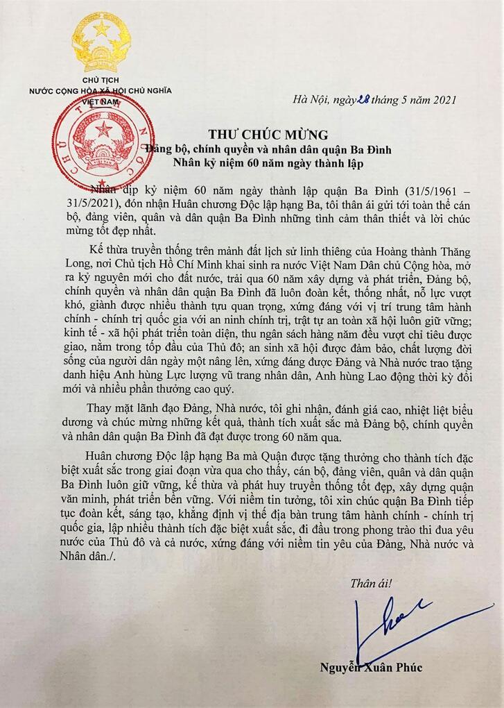 Chủ tịch nước Nguyễn Xuân Phúc gửi thư chúc mừng Đảng bộ và Nhân dân quận Ba Đình nhân kỉ niệm 60 năm ngày thành lập Chia sẻ bài viết lên facebook
