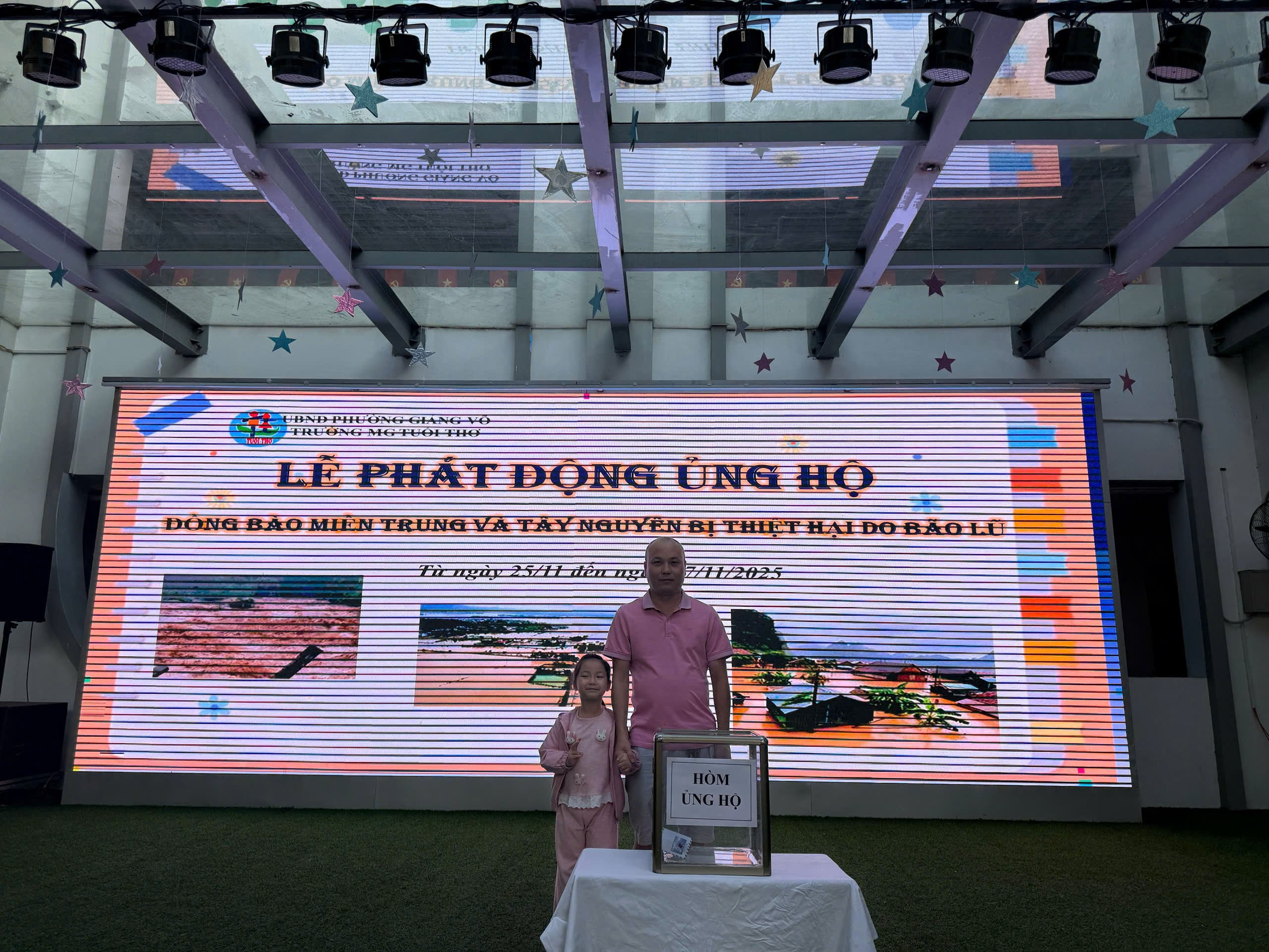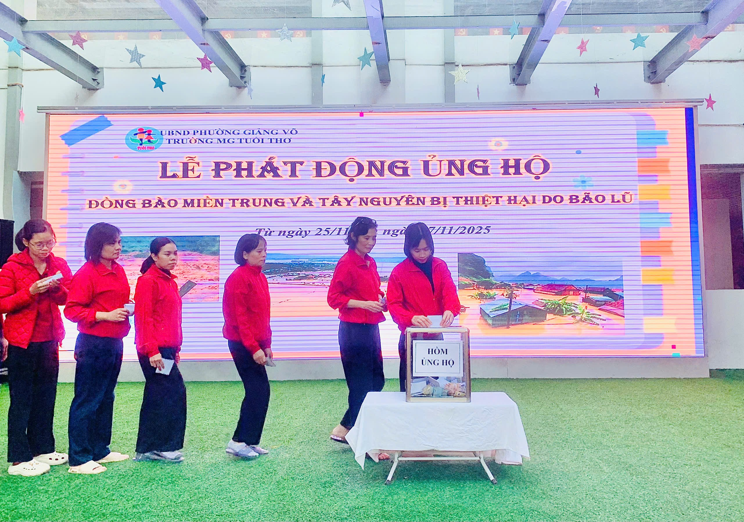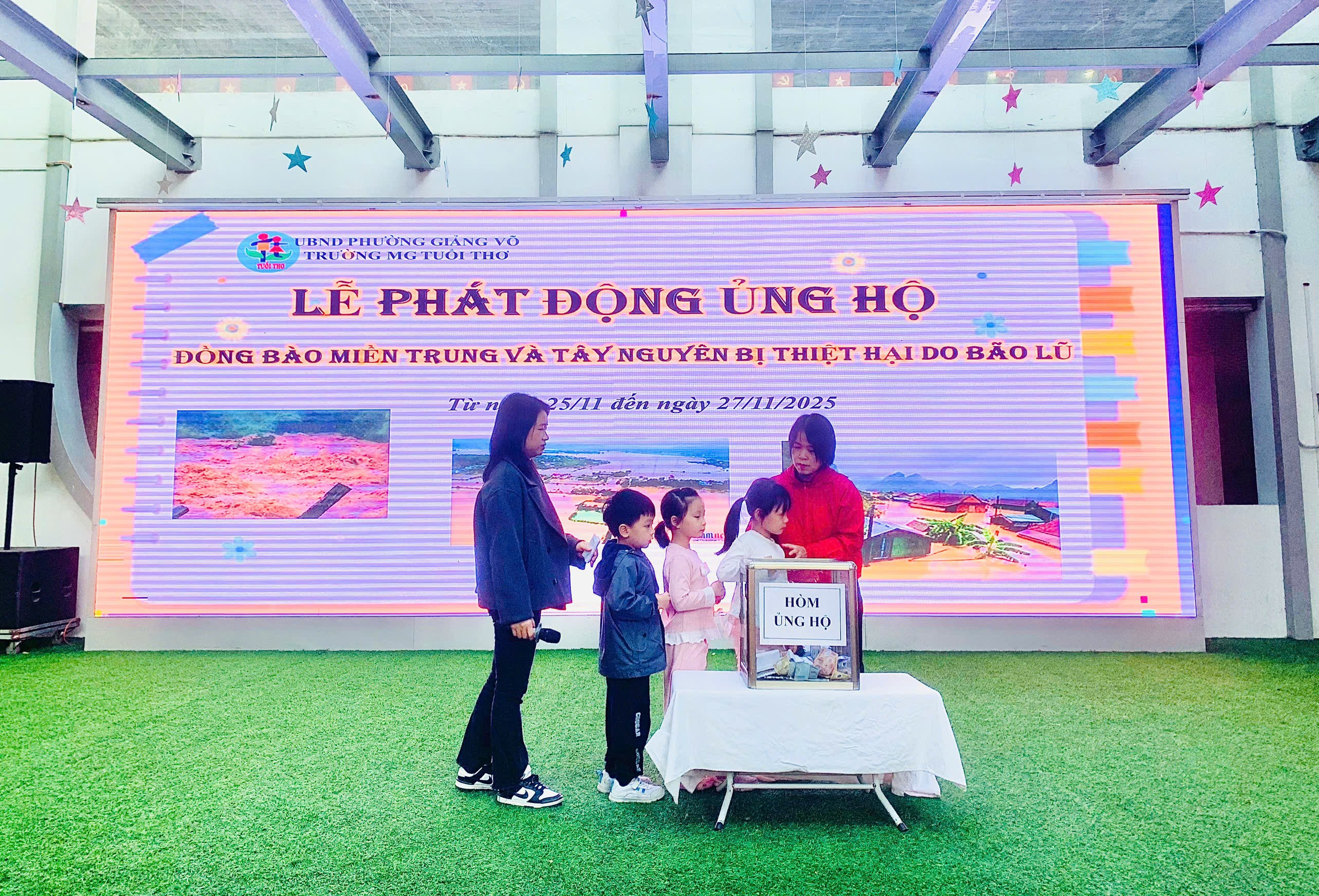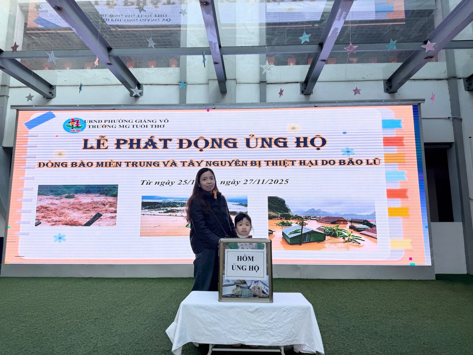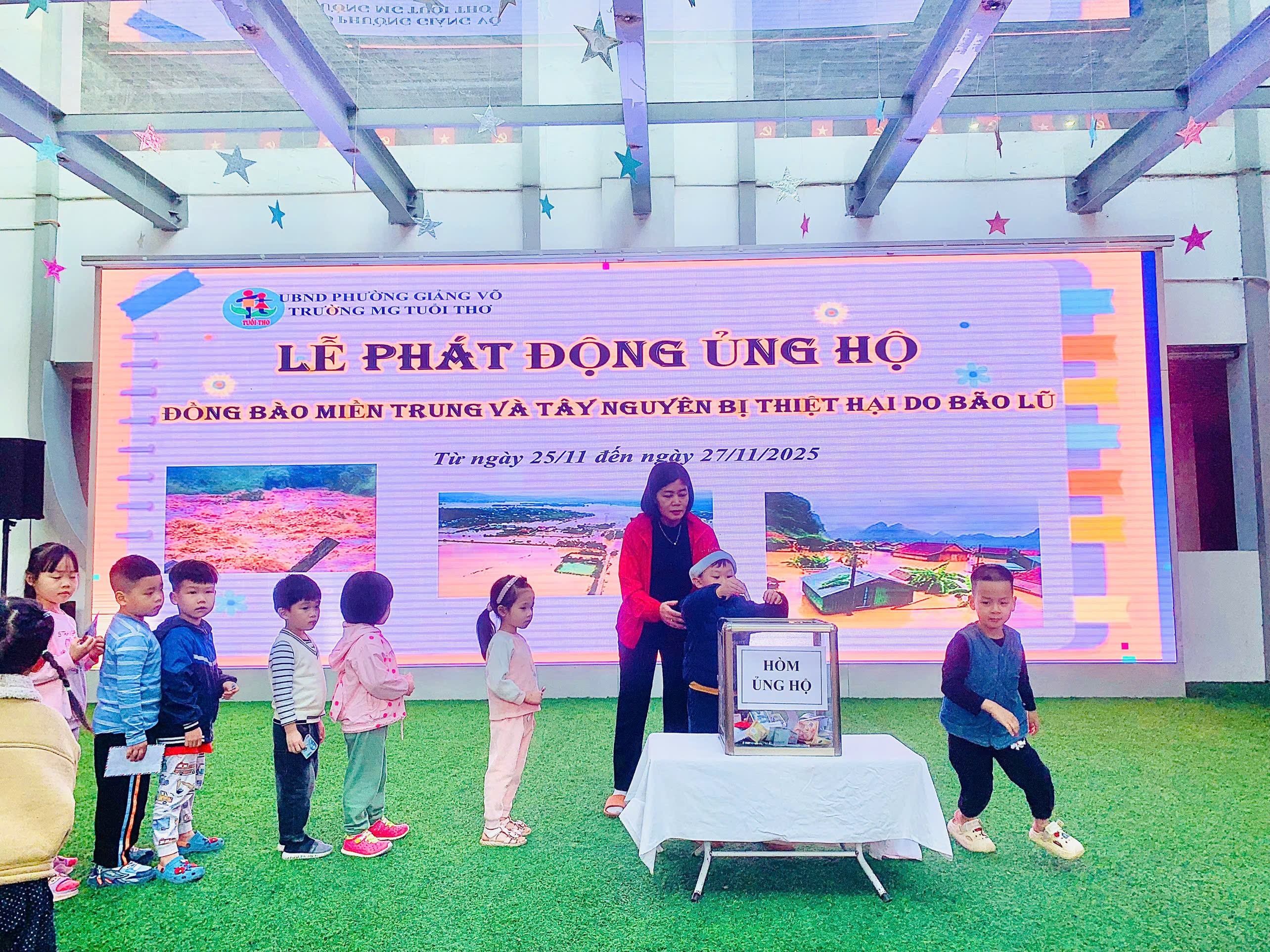 Thực hiện lời kêu gọi của Ủy ban MTTQ Việt Nam Phường Giảng Võ, sáng ngày 25/11/2025 trường MG Tuổi Thơ long trọng tổ chức Lễ phát động ủng hộ đồng bào các tỉnh khu vực miền Trung và Tây Nguyên – những địa phương đang chịu nhiều thiệt hại nặng nề do mưa lũ kéo dài.