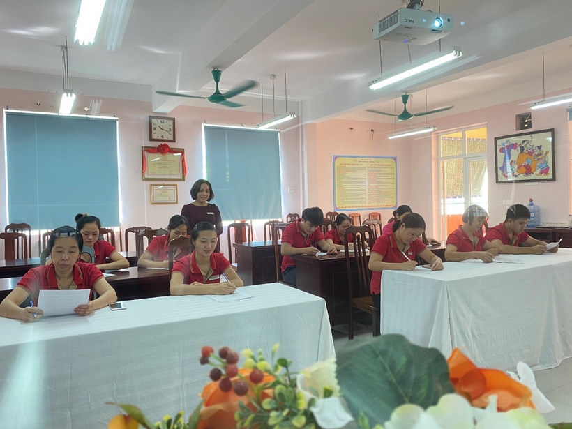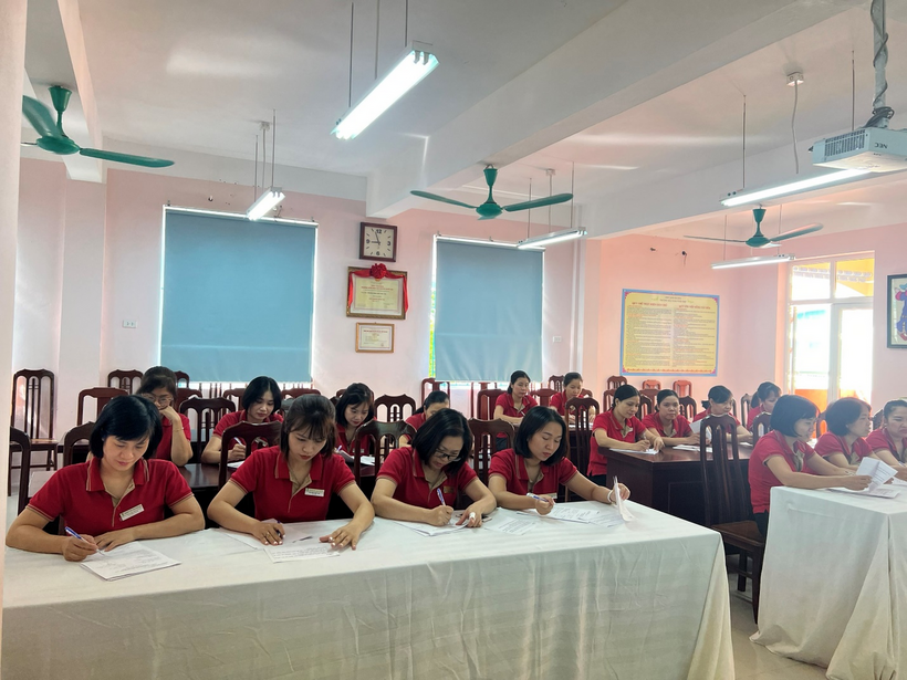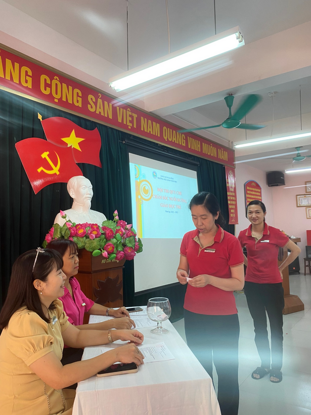 Sáng ngày 12/10/2022, khai mạc Hội thi quy chế năm học 2022 – 2023, phần thi lý thuyết được tổ chức cùng ngày tại phòng Hội đồng nhà trường. Giáo viên, nhân viên nhà trường thực hiện phần thi là phần thi lý thuyết. Phần thi lý thuyết các cô dự thi tập trung và bắt thăm đề thi theo từng lĩnh vực. Phần thi thực hành các cô sẽ thi trực tiếp tại vị trí mình được phân công như: Giáo viên dạy khối mẫu giáo, giáo viên dạy khối nhà trẻ, nhân viên cấp dưỡng, bảo vệ, nhân viên y tế, kế toán.