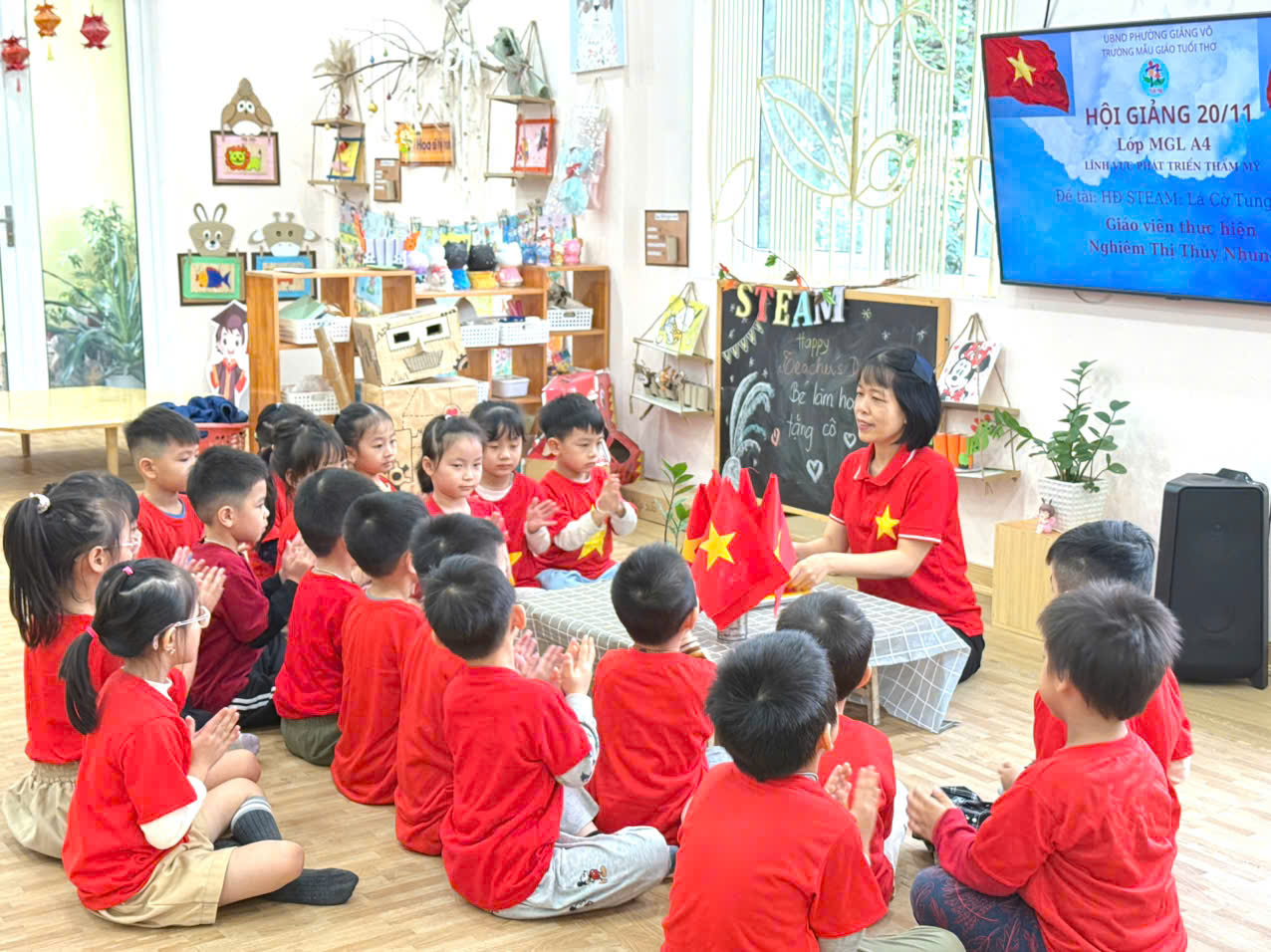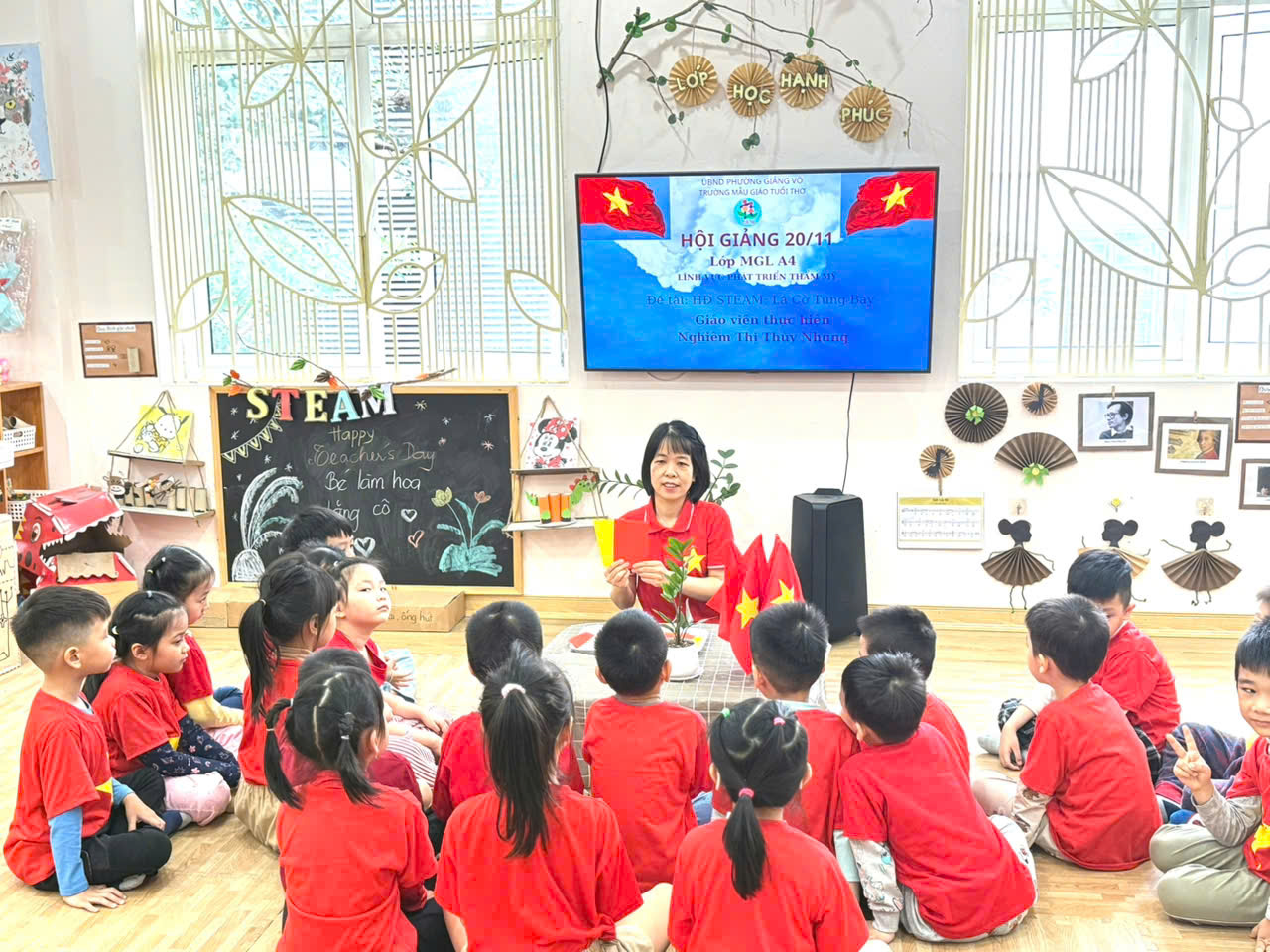 Hòa trong không khí thi đua lập thành tích chào mừng ngày Nhà giáo Việt Nam 20/11, cô giáo Nghiêm Thị Thùy Nhung và Nguyễn Thị Định, giáo viên lớp Mẫu giáo lớn A4 – Trường Mẫu giáo Tuổi Thơ, đã mang đến một tiết hội giảng đặc biệt ứng dụng PPGD STEAM với đề tài: “Lá cờ Tổ quốc tung bay”.