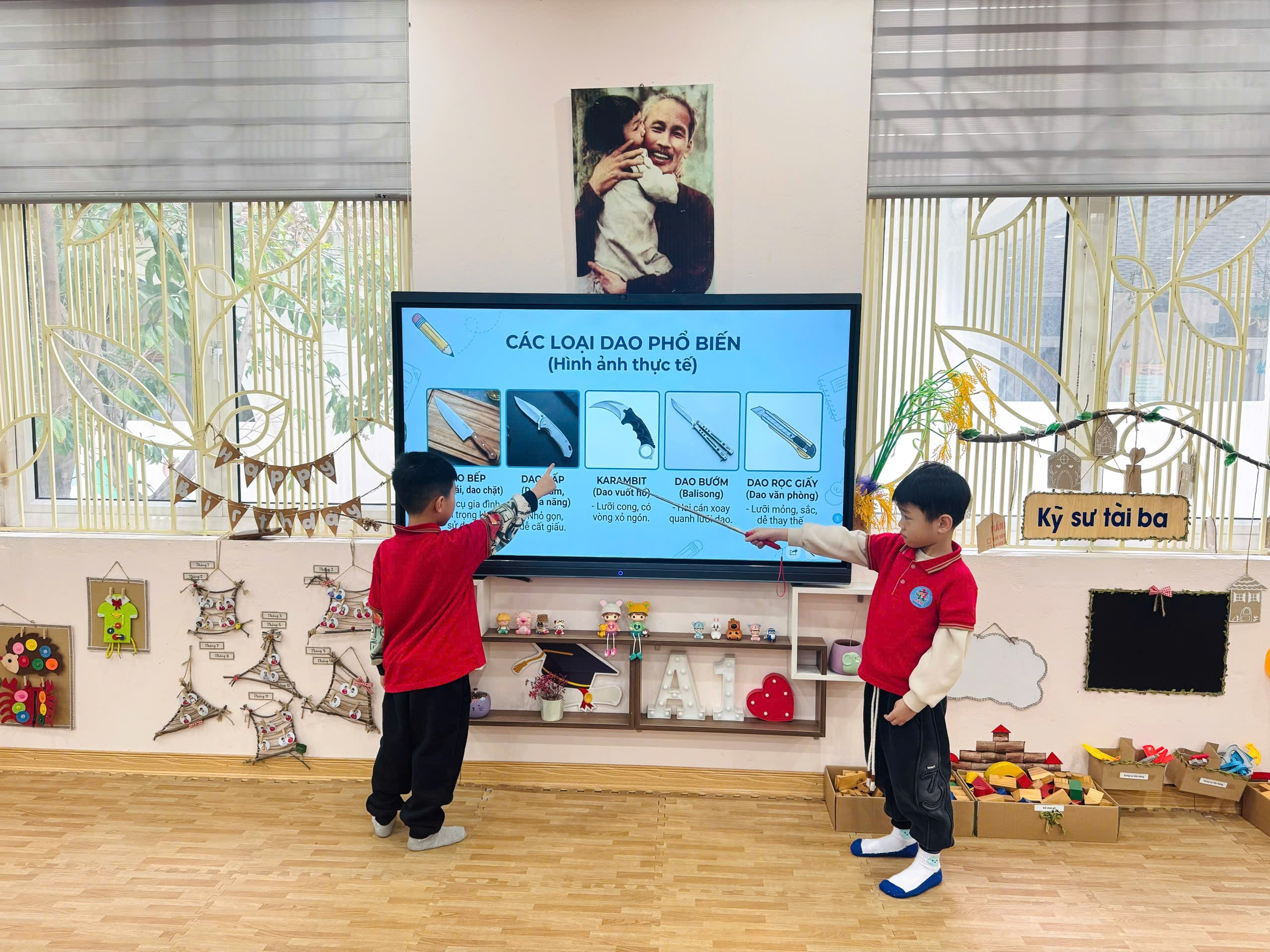 Các bé lớp MGL A1 trong giờ tìm hiểu công dụng các loại dao phổ biến