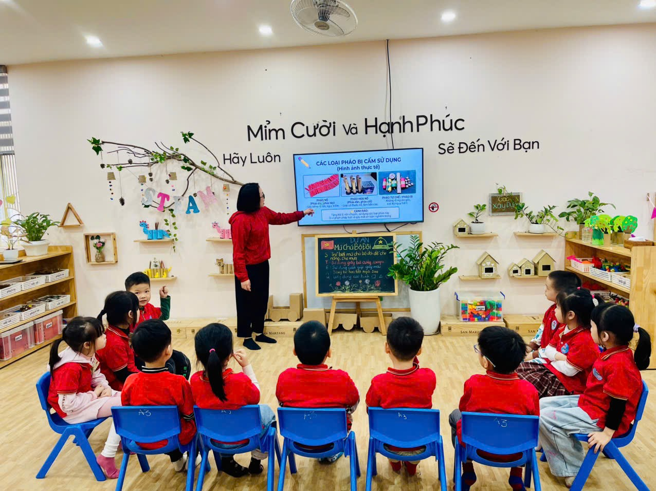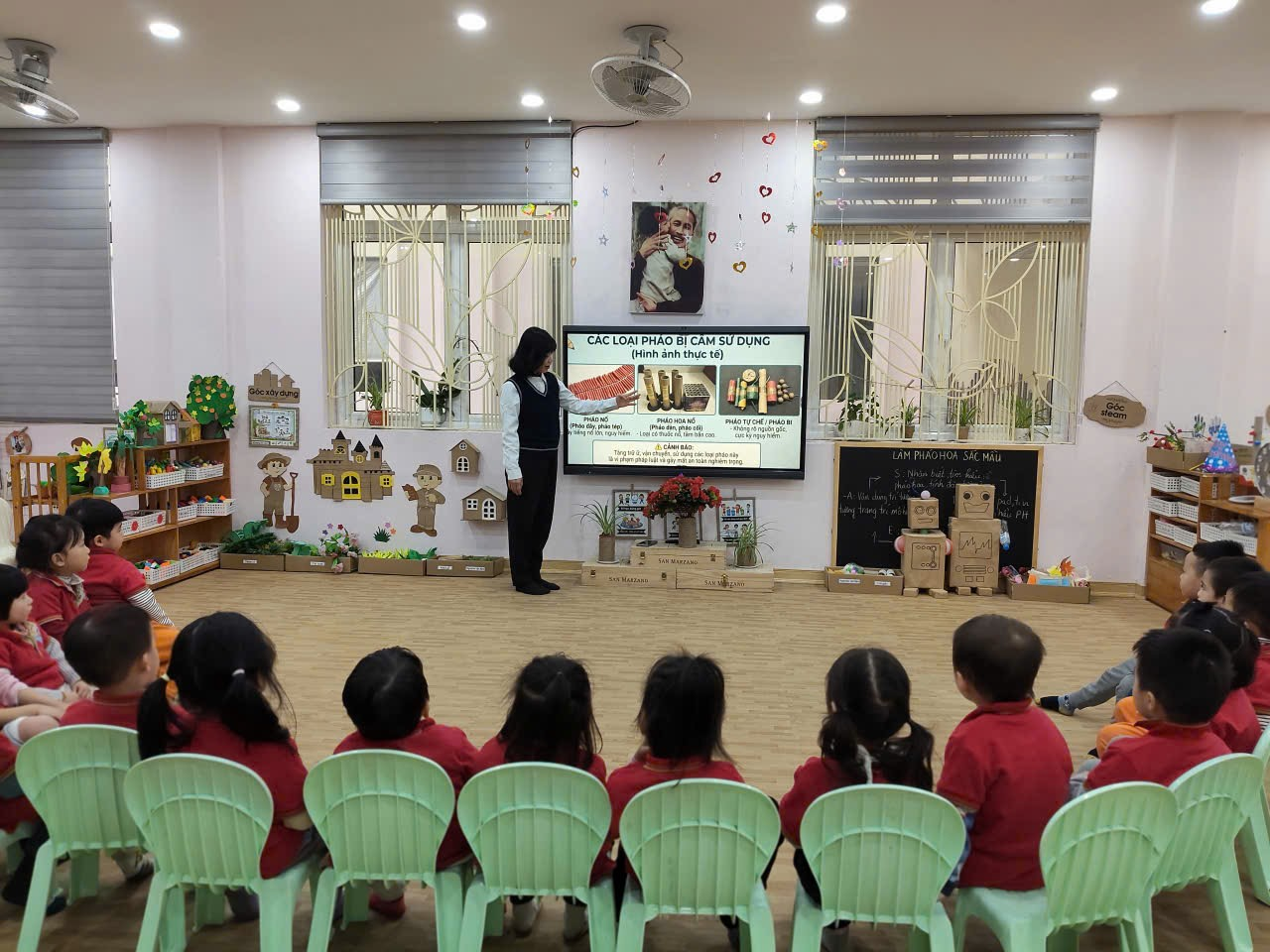 Cô và trẻ lớp MGB C2 trong giờ hoạt động tìm hiểu về tác hại của việc chơi, nghịch “pháo”