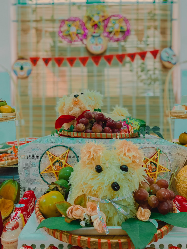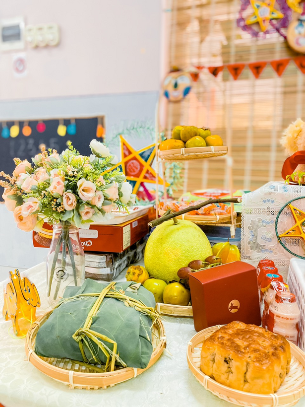 Ngay từ sáng sớm các bậc PHHS của lớp đã chuẩn bị rất chu đáo mang đến cho các con. Nào thì bánh nướng, bánh dẻo, nào thì đèn ông sao, mặt nạ, rồi hoa quả bánh kẹo, bim bim…đủ cả không thiếu thứ gì