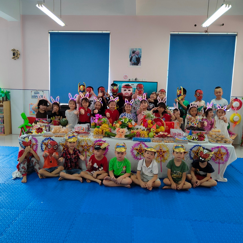 Ngay từ sáng sớm các bậc PHHS của lớp đã chuẩn bị rất chu đáo mang đến cho các con. Nào thì bánh nướng, bánh dẻo, nào thì đèn ông sao, mặt nạ, rồi hoa quả bánh kẹo, bim bim…đủ cả không thiếu thứ gì.