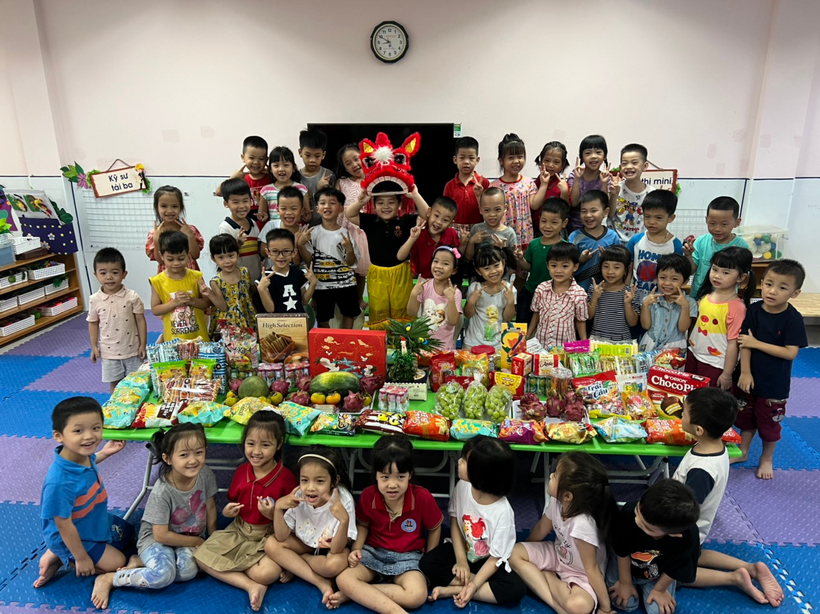 Ngay từ sáng sớm các bậc PHHS của lớp đã chuẩn bị rất chu đáo mang đến cho các con. Nào thì bánh nướng, bánh dẻo, nào thì đèn ông sao, mặt nạ, rồi hoa quả bánh kẹo, bim bim…đủ cả không thiếu thứ gì.