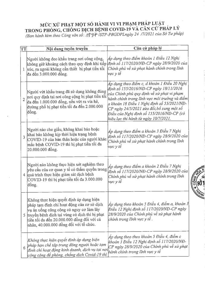 Mức độ phạt một số hành vi vi phạm trong phòng chống dịch bệnh Covid 19 và căn cứ pháp lý.