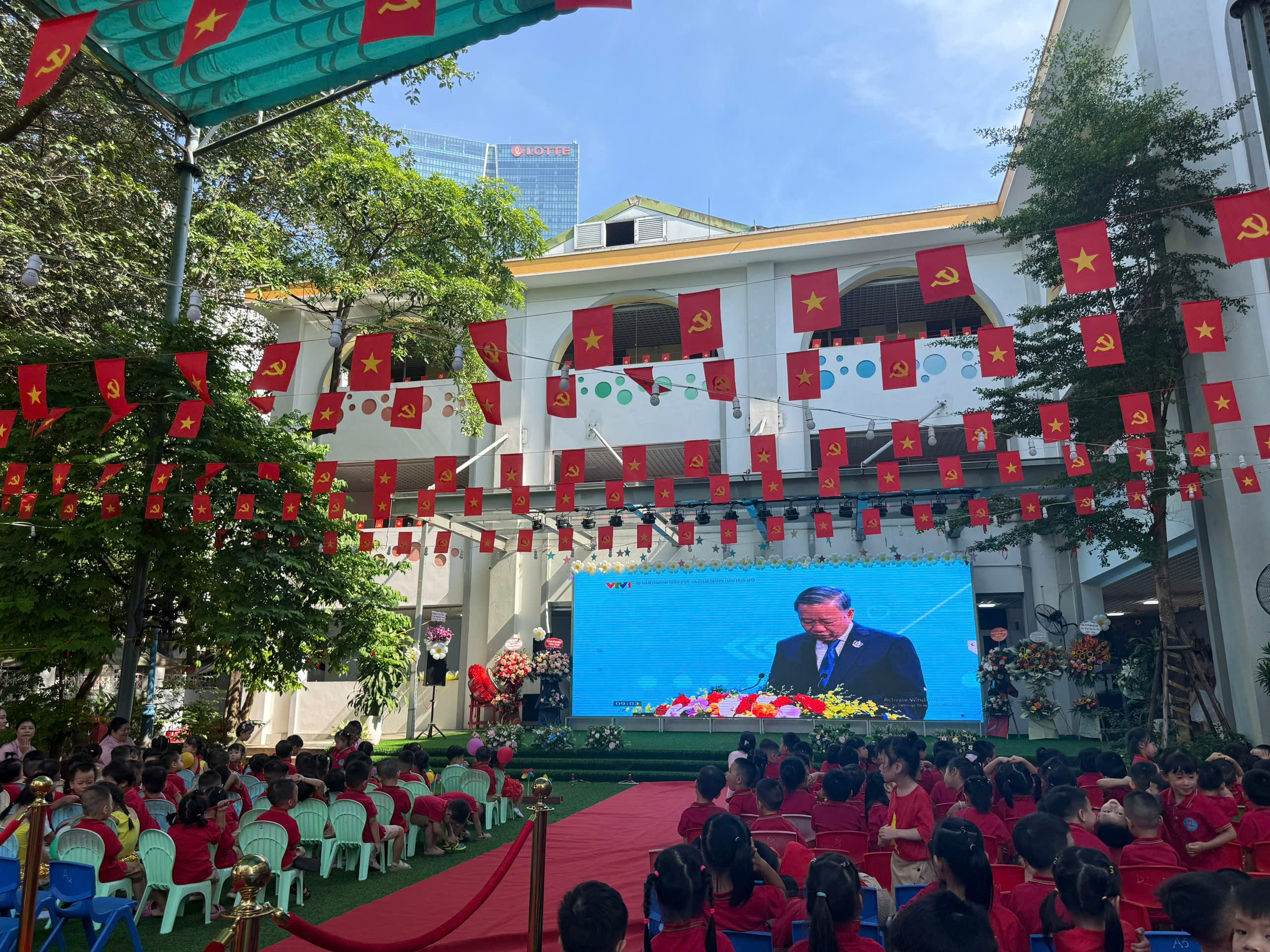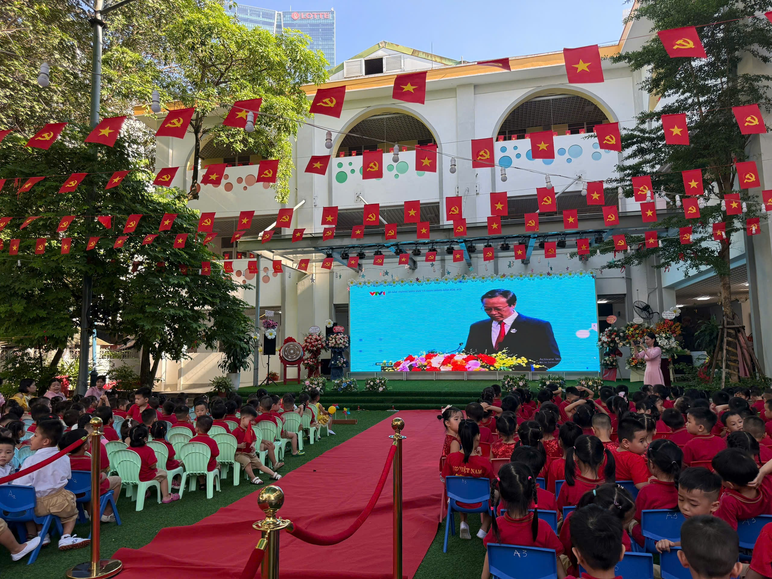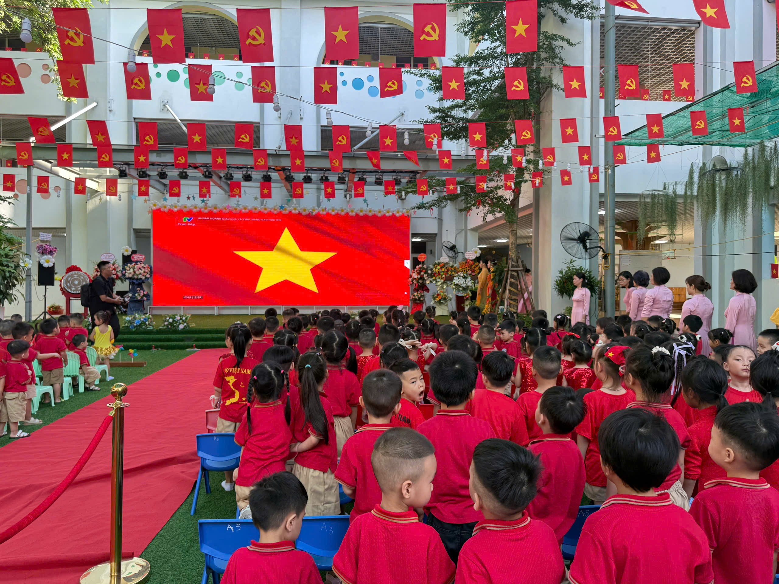 Ngay từ đầu buổi sáng, cô và trò nhà trường đã tham dự lễ Khai giảng trực tuyến toàn quốc do Bộ Giáo dục & Đào tạo phát động. Các bé nghiêm trang trong nghi lễ chào cờ, cùng lắng nghe phát biểu khai giảng của Bộ trưởng Nguyễn Kim Sơn và đặc biệt là những lời căn dặn đầy xúc động của Tổng Bí thư Tô Lâm gửi tới thầy, trò cả nước.