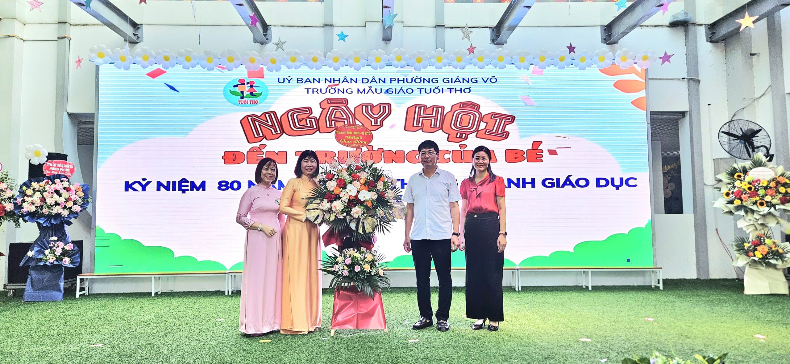 Các đồng chí lãnh đạo UBND Phường Giảng Võ tặng hoa chúc mừng nhà trường