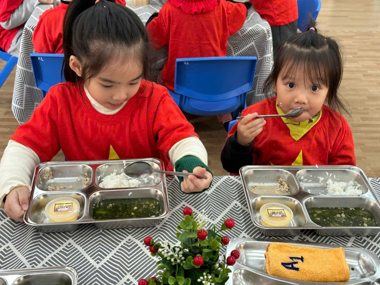 Bữa ăn trưa giao lưu giữa các bé mẫu giáo lớn và mẫu giáo bé ở trường Mẫu giáo Tuổi thơ